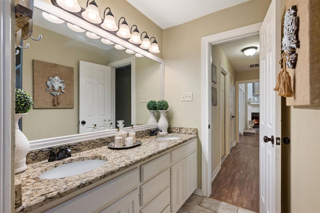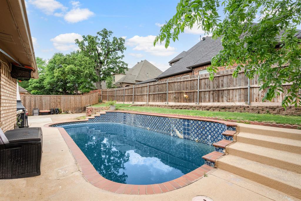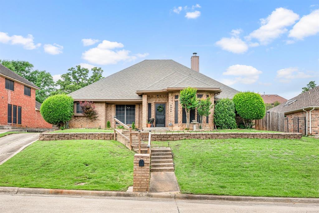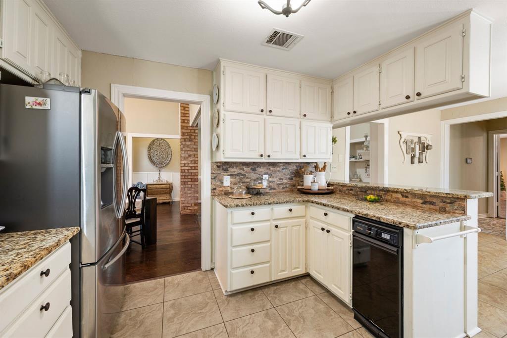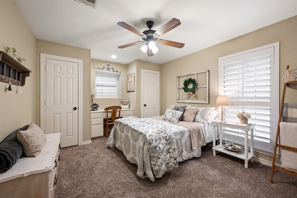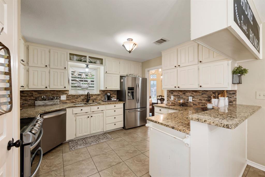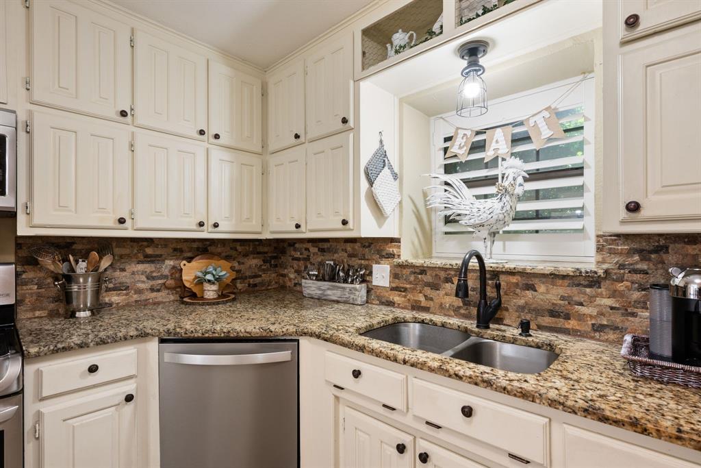 NEW ROOF, GUTTERS, AND FENCE STAINING. Step into timeless charm with this beautifully styled 3-bedroom, 2.5-bath home, offering the perfect blend of rustic farmhouse character and modern comfort. Nestled in a quiet, welcoming neighborhood, this spacious residence features two inviting living rooms—ideal for both cozy nights in and lively entertaining. Exposed brick accents and thoughtfully selected farmhouse finishes create a warm, inviting atmosphere throughout. Enjoy natural light pouring in through classic plantation shutters, adding elegance and privacy to every room. Main living room offers a fireplace and shelving. The secondary living room hosts a wet bar and views of your gorgeous backyard. The kitchen features white cabinetry, a new double oven and microwave, and granite counters. This home has two dining area options! The primary bedroom features a sitting area and door to your patio. The en-suite bath is spacious with two walk-in closets, two sinks, a walk-in shower, and tub. Two secondary bedrooms complete the space. Out back, your private oasis awaits—a sparkling pool surrounded by mature landscaping, perfect for weekend lounging or summer gatherings. The pool was recently replastered. Upgrades include electrical panel, plantation shutters, new garage door, new thermostat, and new air handler for HVAC system. Whether you’re drawn to the style, space, or seamless indoor-outdoor living, this home has something for everyone. Don't miss this home in a fantastic location! The seller will have the home painted upon move-out, the new home-owner gets to select the new paint color!