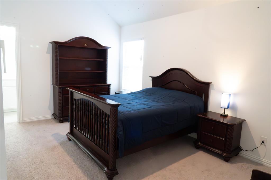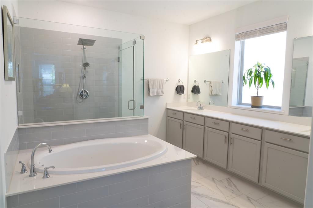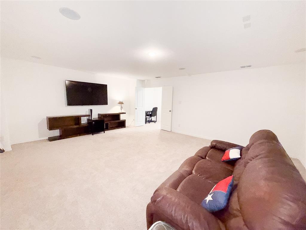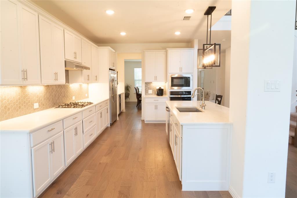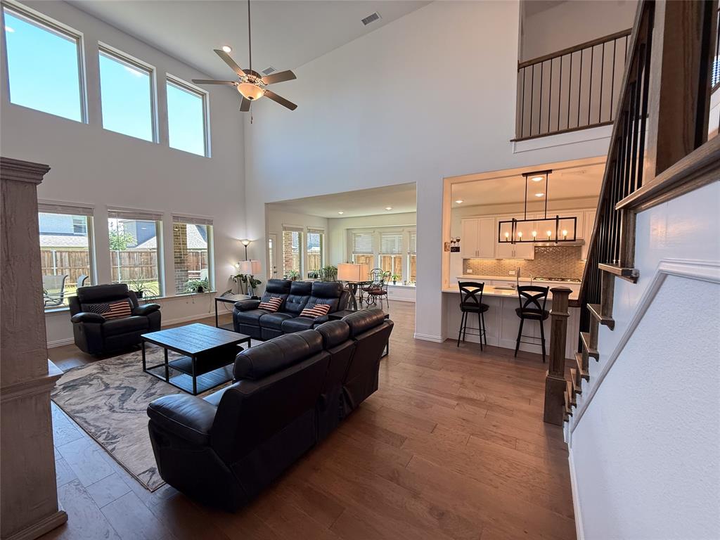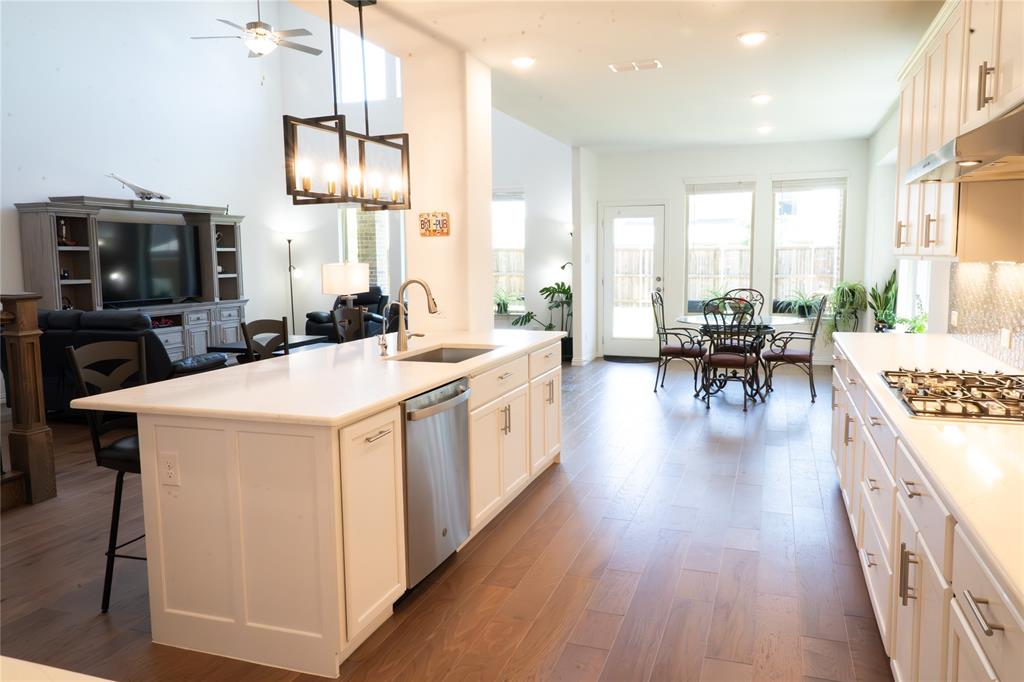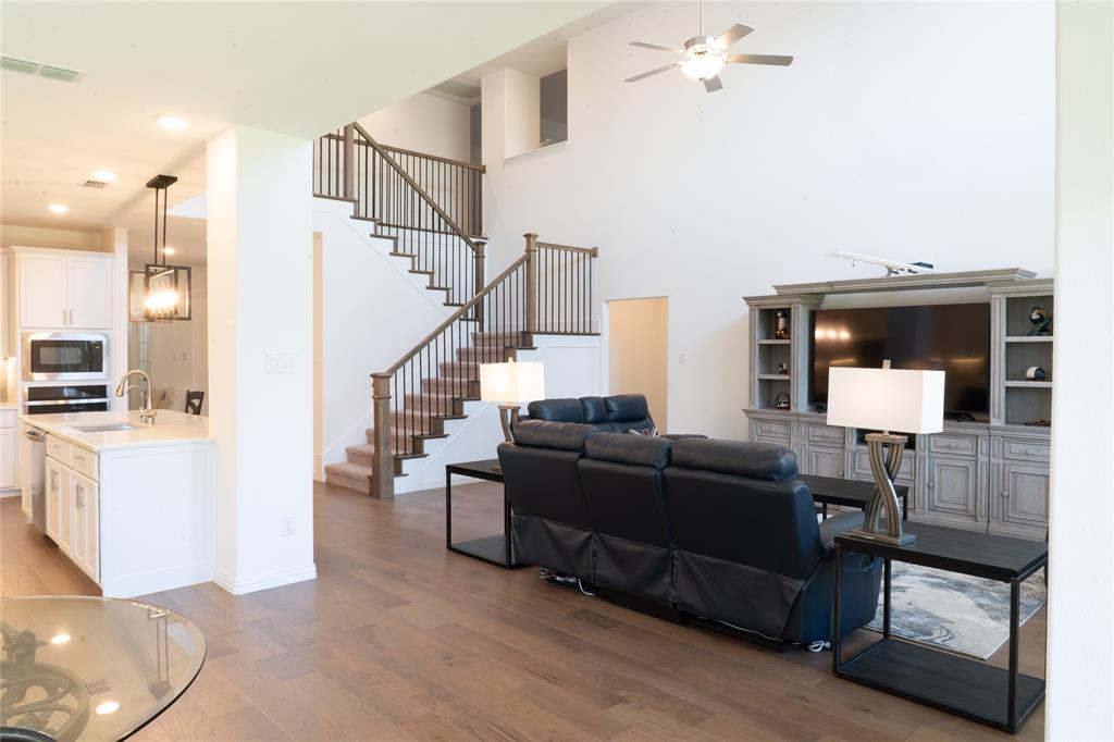 This move-in ready home blends warmth and functionality with soaring ceilings, honey-toned wood floors, and abundant natural light. Chef’s kitchen includes quartz countertops, gas cooktop, stainless oven and microwave, walk-in pantry, and sunny dining nook. Dedicated office, formal dining, and grand living area with cathedral ceiling and floor-to-ceiling windows. Two downstairs bedrooms with ensuite baths—perfect for guests or multi-generational living. Luxe primary suite features bay windows, dual vanity, soaking tub, glass shower & custom walk-in closet. Upstairs: 3 bedrooms, game room, and media room with built-in speakers. Covered patio opens to spacious backyard—ideal for pool, garden, or play. Located in a quiet, friendly neighborhood just 3 minutes from trails, ponds, playground & pool.