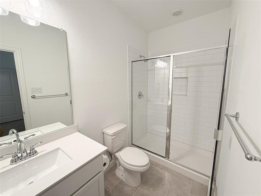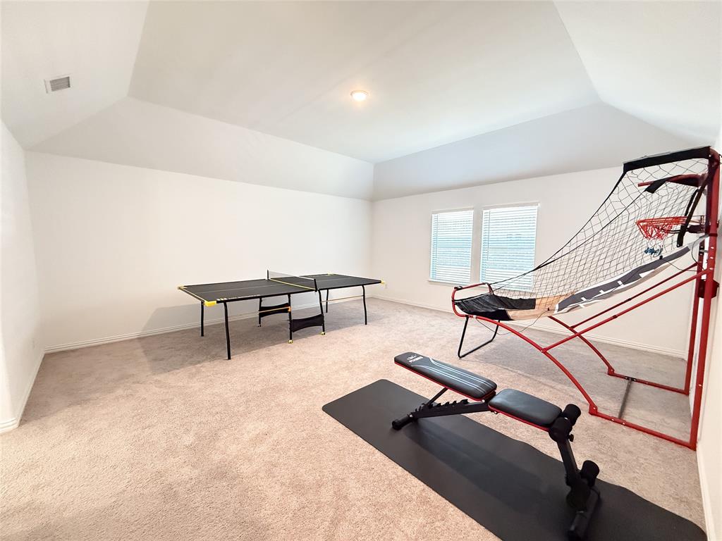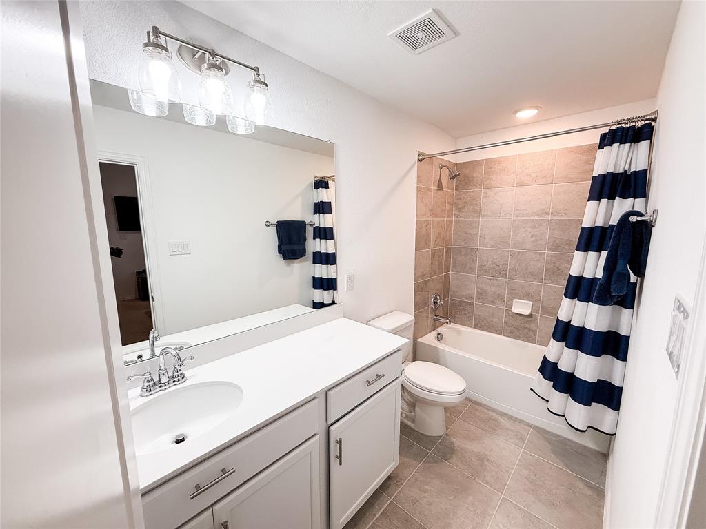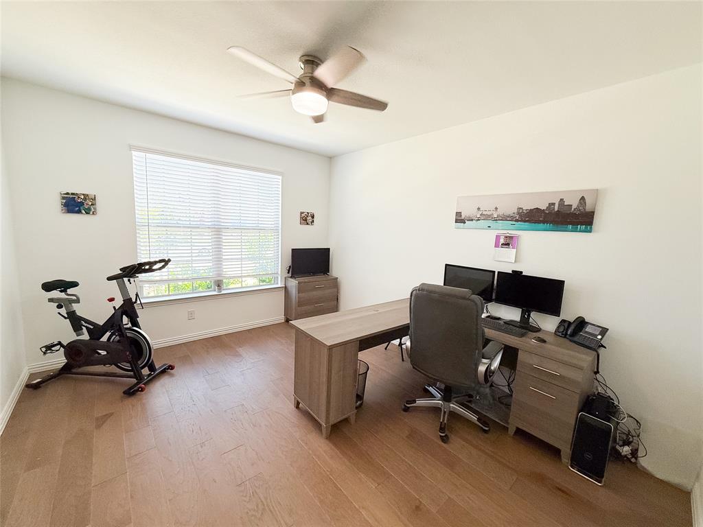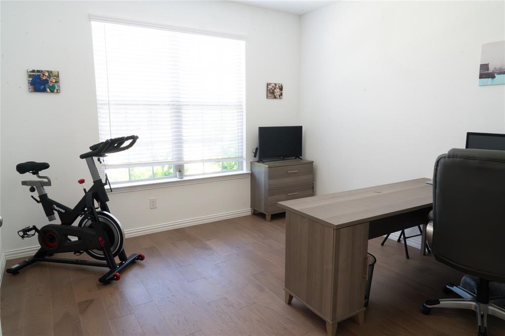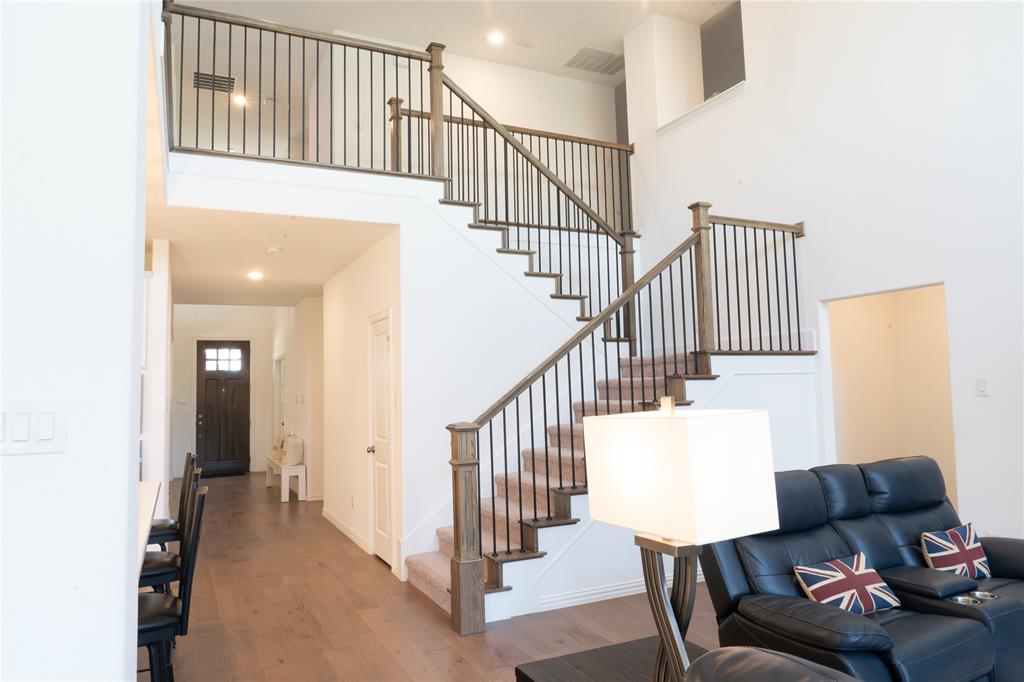 This move-in ready home blends warmth and functionality with soaring ceilings, honey-toned wood floors, and abundant natural light. Chef’s kitchen includes quartz countertops, gas cooktop, stainless oven and microwave, walk-in pantry, and sunny dining nook. Dedicated office, formal dining, and grand living area with cathedral ceiling and floor-to-ceiling windows. Two downstairs bedrooms with ensuite baths—perfect for guests or multi-generational living. Luxe primary suite features bay windows, dual vanity, soaking tub, glass shower & custom walk-in closet. Upstairs: 3 bedrooms, game room, and media room with built-in speakers. Covered patio opens to spacious backyard—ideal for pool, garden, or play. Located in a quiet, friendly neighborhood just 3 minutes from trails, ponds, playground & pool.