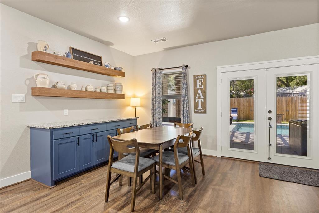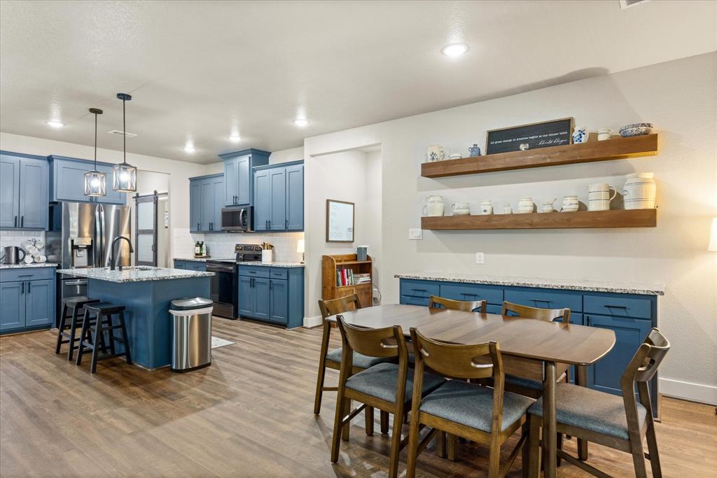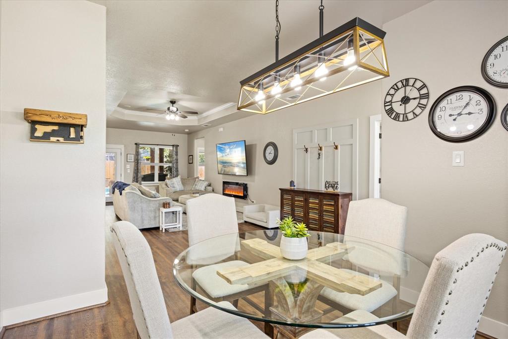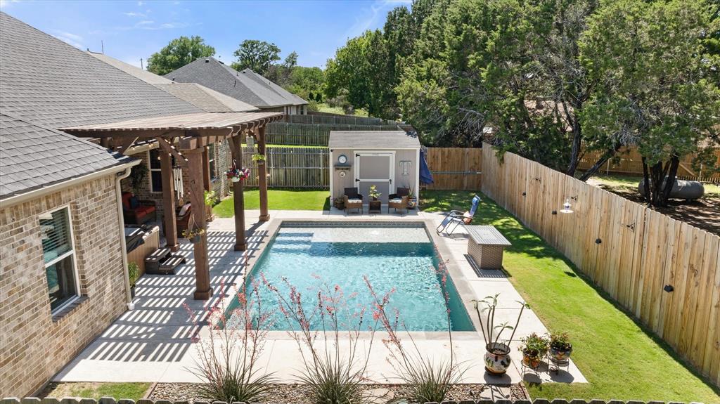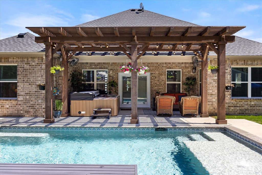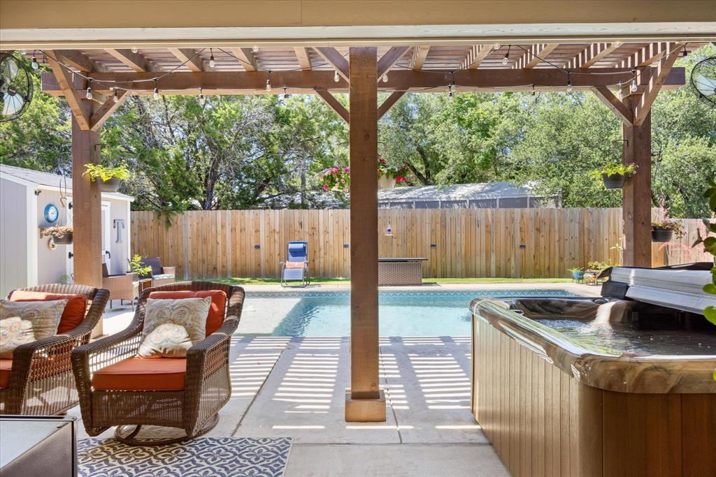 Pristine and better than new home in gated community of Canyon Creek with Assumable VA Mortgage at 3.4%. This 4 bedroom, 2.5 bath home has all the cool finishes and a TON of EXTRAS! Flat and perfectly manicured fenced backyard that features an in ground gunite salt water pool with beautiful decking, decorative lighting and fans around the patio but still plenty of grassy area for pets. This is going to be your SUMMER HOT SPOT for all your friends and family! Pool equipment is nicely tucked out of sight behind the shed that conveys. Pergolas adorn both the front and back of home and add to the high end custom feel. Upon entering, there is a light and bright office with glass French doors that could also be a bedroom. Formal dining at the front of the home is spacious and has a built in shelf with a hidden compartment. Open concept floorplan, light color palette, and modern electric fireplace welcome you home. Kitchen is open to living room and is perfect setup for entertaining with the popular blue cabinetry, white subway tile backsplash, and granite counters. Coffee bar or wine bar area perfectly placed by the fridge PLUS a huge butler pantry area with decorative wood shelving is located off the breakfast dining area. Spacious laundry area features shelving, hanging area and sink and is easily closed off by a stylish opaque glass contemporary barn door. Half bath is easily accessible across from the laundry. French doors lead to the outdoor patio, pool and HOT TUB. Use your whole yard, as no septic to worry about here, it is on CO-OP water and sewer and the entire yard has irrigation. Built in soffit lighting makes for easy holiday decorating. Community has Clubhouse, dock, playground and more-see canyoncreekpoa.com info. Too much to mention, this is a must see!