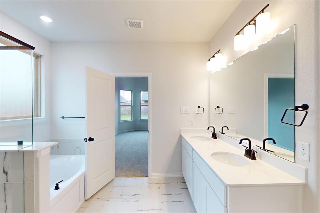 The owner's suite is tucked away at the back of the main level for added privacy. It features an 11’ ceiling, an en-suite bathroom with dual vanities, a soaking tub, a separate walk-in shower, and a generous walk-in closet. Also on the first floor is a convenient half bath and laundry room with garage access, making daily routines simple and streamlined.