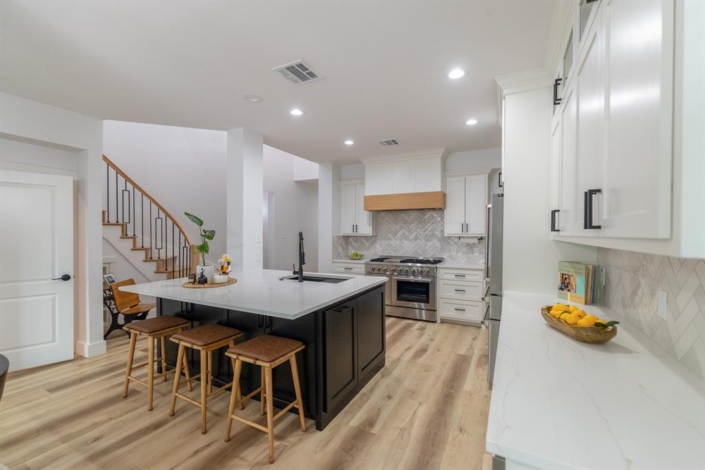 All countertops (kitchen and bathrooms) are Quartz. Chef's Kitchen comes with custom-built cabinets and Thor Stainless Steel 6-burner gas range with a double oven. Waterproof luxury vinyl flooring across the first floor and the game room on the second floor.