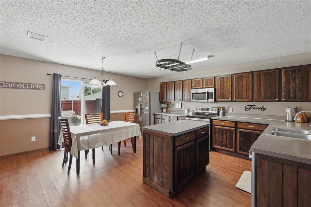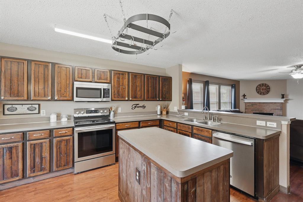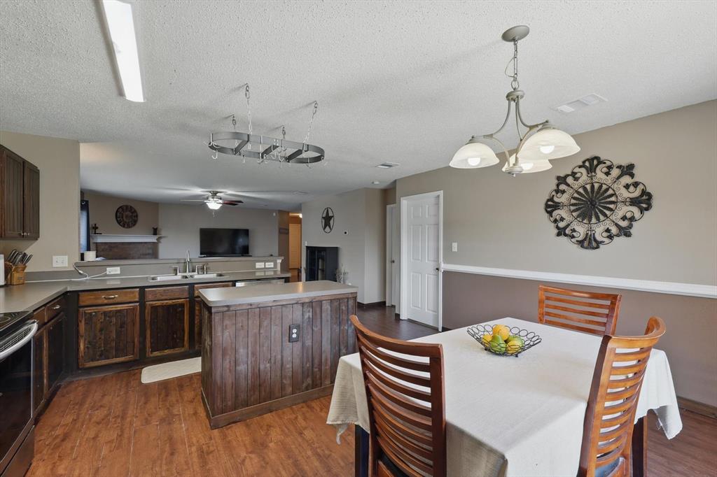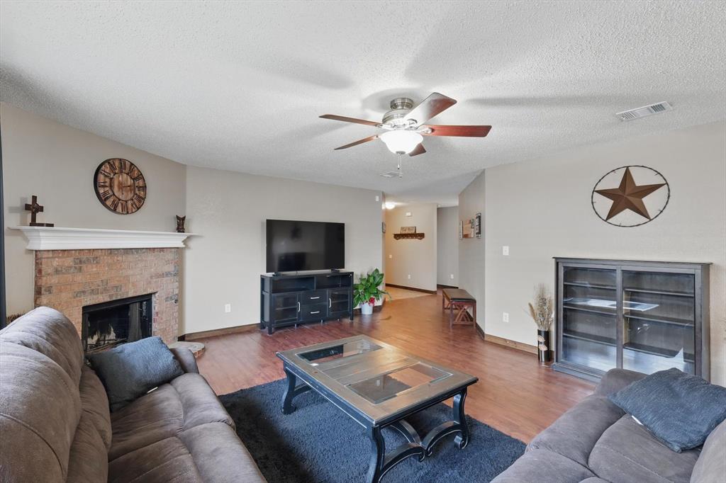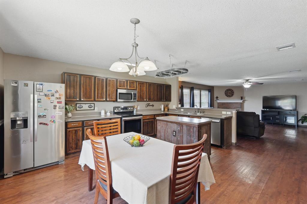 Open Concept Living: The family room features a cozy wood-burning fireplace and flows seamlessly into the dining area and kitchen.