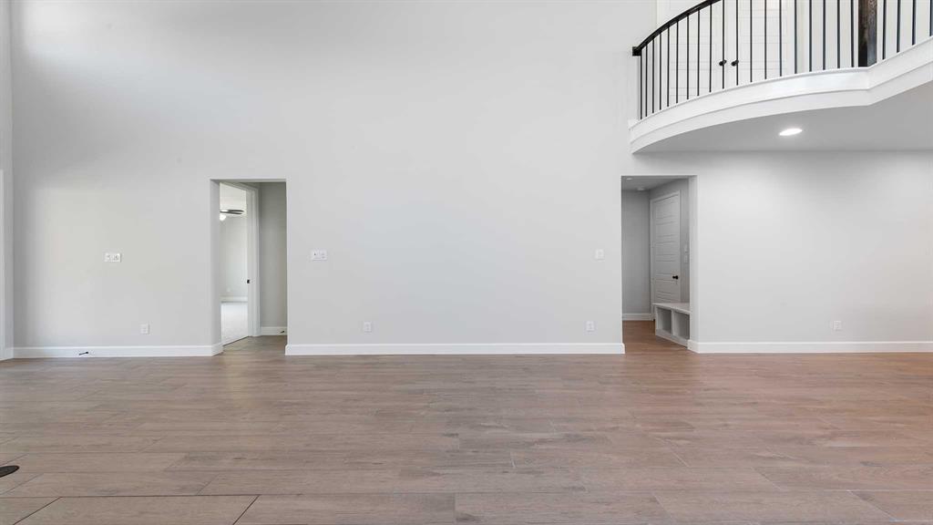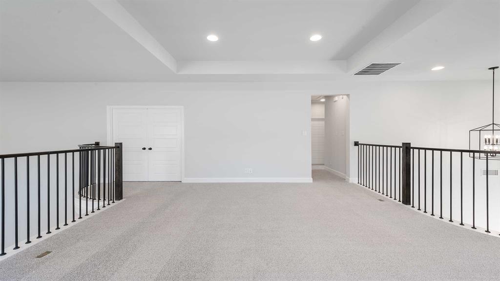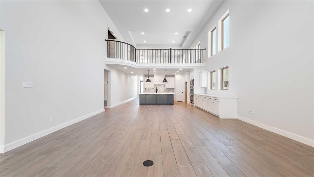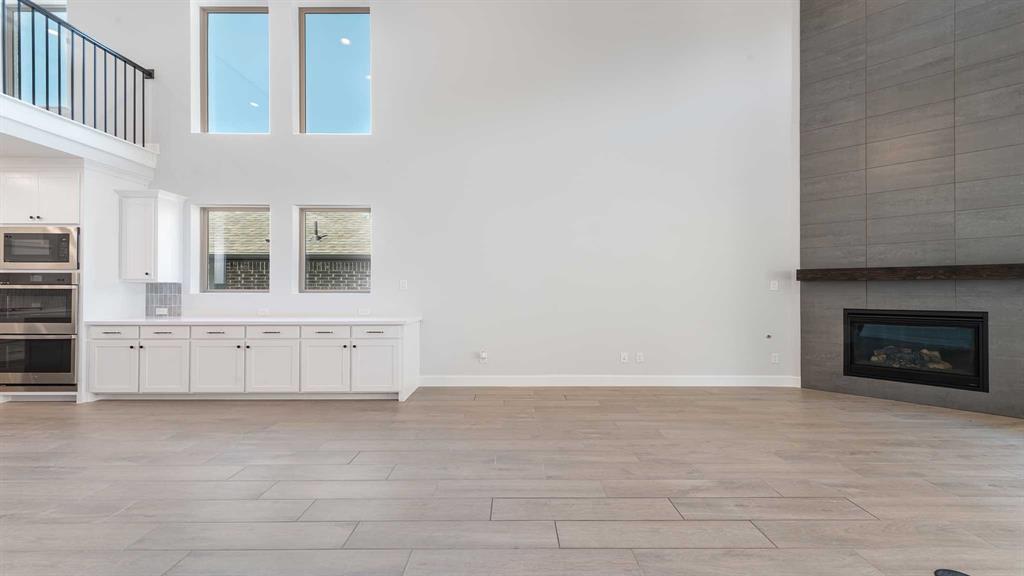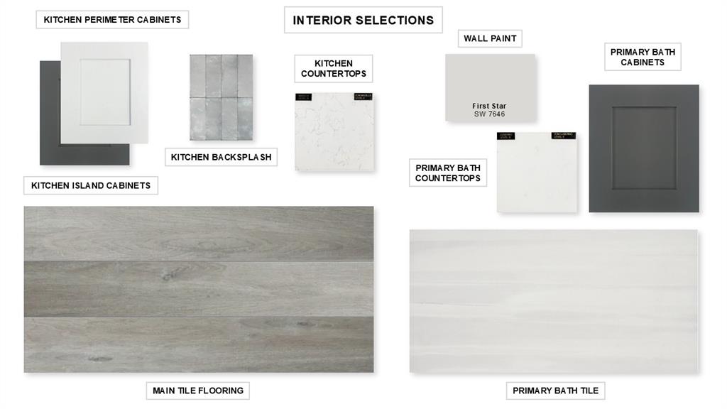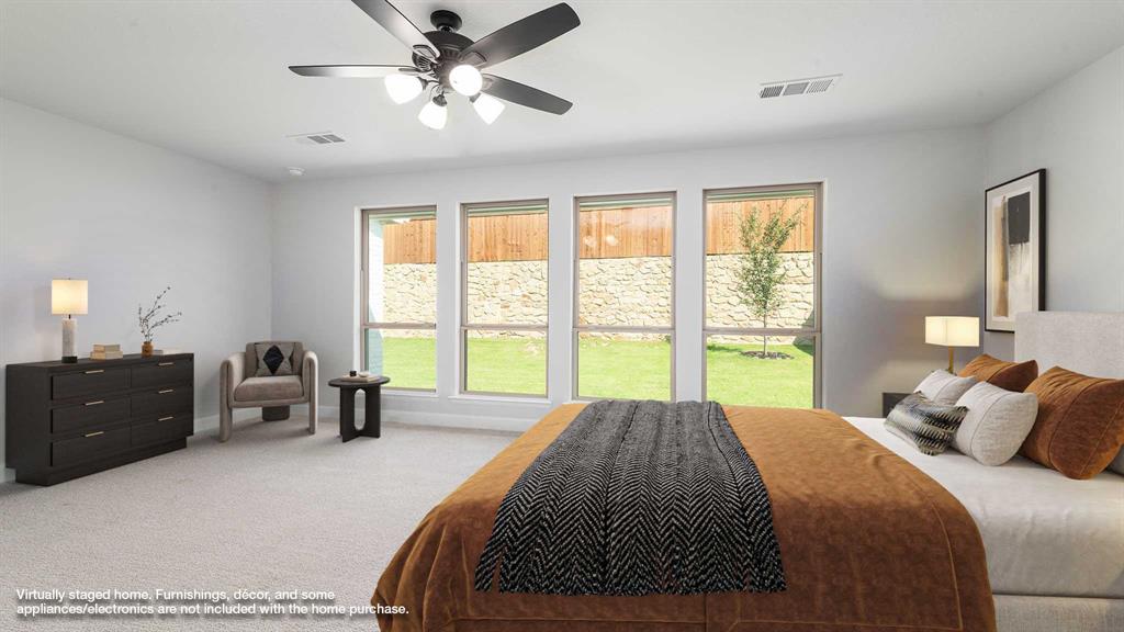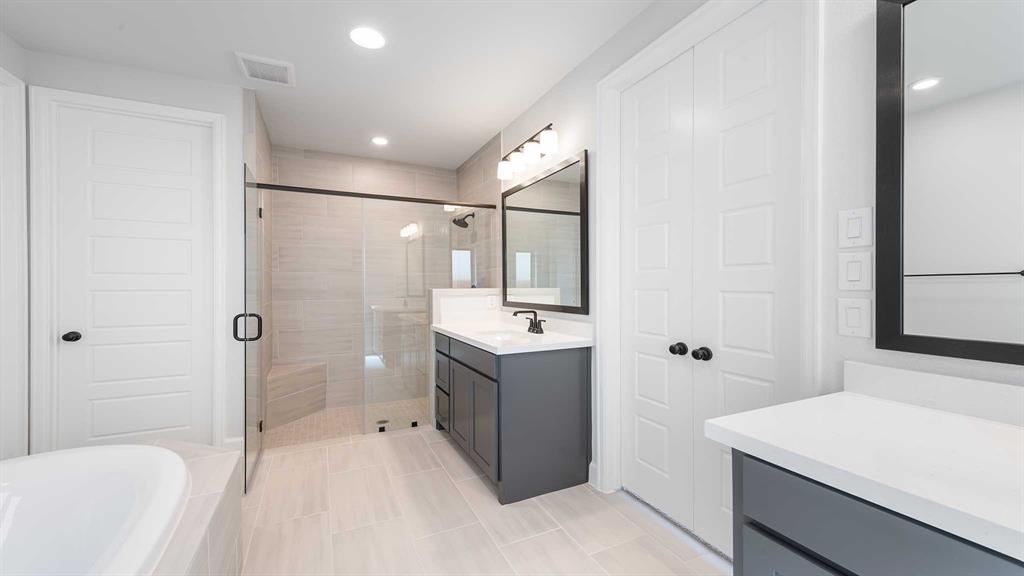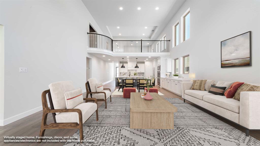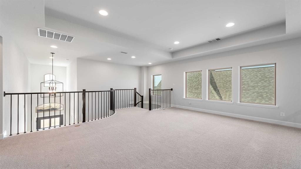 Home office with French doors set at two-story entry. Open kitchen hosts inviting island with built-in seating space. Two-story dining area opens to two-story family room with wall of windows. First-floor primary suite with wall of windows. Dual vanities, garden tub, separate glass-enclosed shower and two walk-in closets in primary bath. A guest suite with full bath is downstairs. Secondary bedrooms, a game room and media room with French doors are upstairs. All bedrooms include walk-in closets. Covered backyard patio. Mud room off three-car garage.