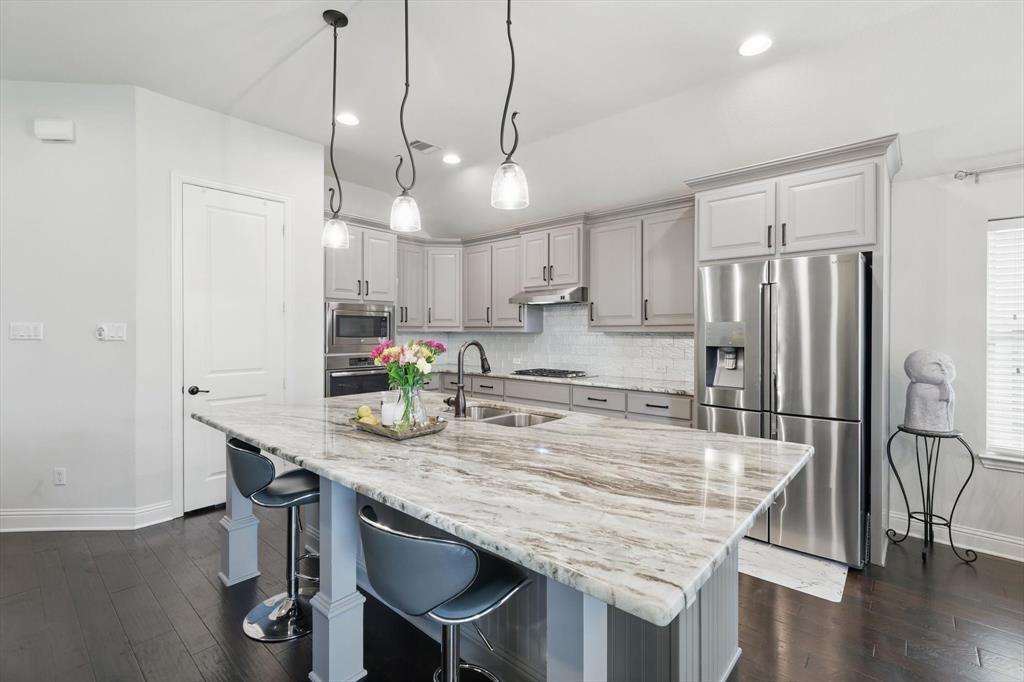 Stunning like new single story that effortlessly blends modern elegance with everyday comfort. Nestled in one of the areas most sought after neighborhoods, this property stands out with exceptional curb appeal and thoughtful after-build enhancements that elevate the home. Pristine engineered hardwood floors, high ceilings, high level granite counters, custom backsplash, designer pendant lights, upgraded primary bathroom with added access to laundry through primary closet. Extended kitchen and primary bedroom. Split bedroom floor plan. Ask your agent for Upgrades List! This one will show like a model with that new construction smell, look, and feel! Seller's pride reflects this beauty.