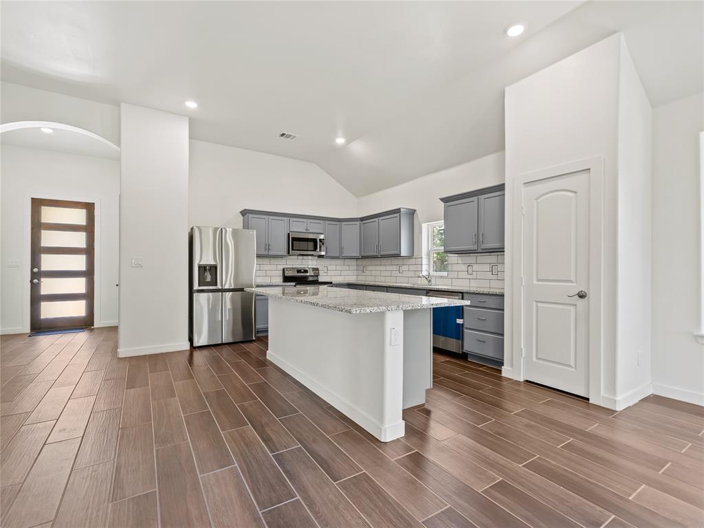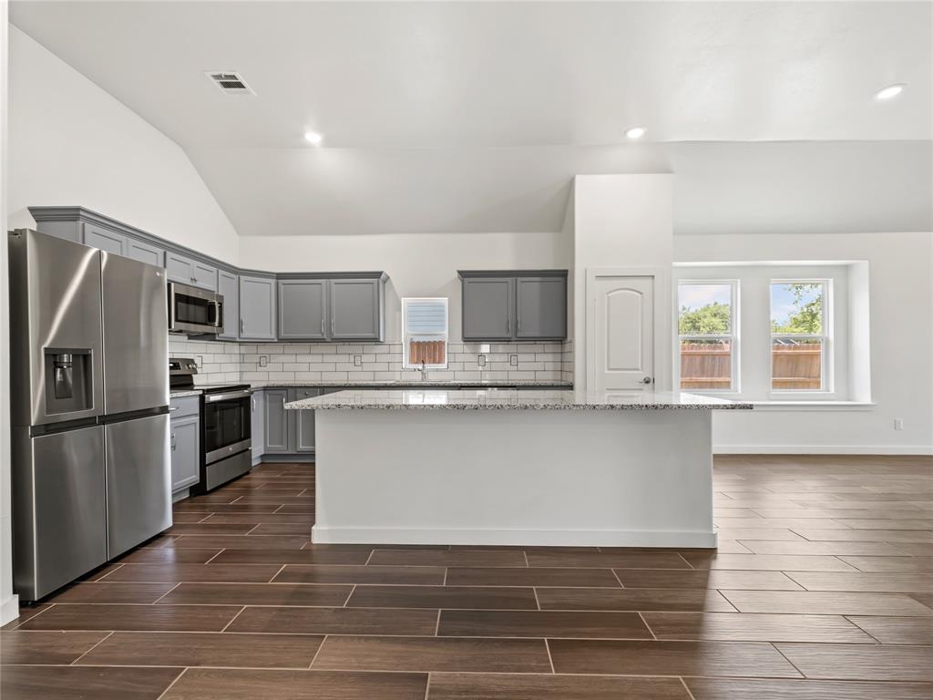The heart of the home is the open-concept floorplan, perfectly designed for both everyday living and entertaining. The large kitchen island serves as a beautiful and functional centerpiece, offering additional prep space, seating, and storage. The chef-inspired kitchen is finished with sleek granite countertops and a full suite of stainless steel appliances—including a refrigerator—ensuring you have everything you need from day one.