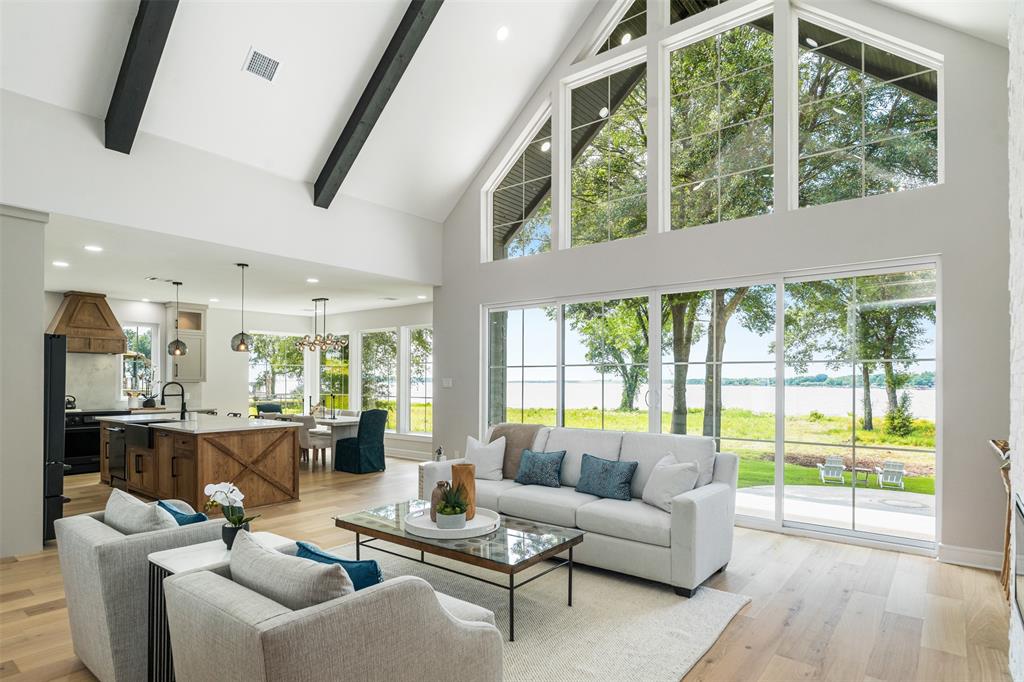 UP TO 3% IN SELLER CONCESSIONS WHEN USING OUR PREFERRED LENDER. CAN SLEEP 12+. This modern farmhouse mini mansion on the water is truly a remarkable find, set on over half an acre with breathtaking waterfront views. When you step inside, you’re immediately captivated by a wall of windows that frame stunning views of the lake. The home boasts engineered hardwood floors throughout, quartz countertops, and beautifully tiled bathrooms. The heart of this home is the kitchen, designed for both chef enthusiasts and casual cooks alike. It features plenty of space to move around, custom cabinets that include lit display cases at the top. Gorgeous bubble chandeliers hang gracefully over the spacious kitchen island and the dining table. A wall of windows off the dining area allows for uninterrupted lake views. The cutting-edge appliance package includes black stainless steel by Z Line, with a standout oven from the luxury brand Thor, known for its association with Gordon Ramsay. This oven has all the bells and whistles, making it a dream for any culinary enthusiast. The open floor plan seamlessly integrates these areas. The primary suite is conveniently located on the first floor, featuring a luxurious bathroom that has a grand wet room, reminiscent of upscale residences. As you ascend the staircase, adorned with a grand chandelier, you’ll find an overlook that provides a stunning view of the great room with up to 17' ceilings. The second floor offers a fantastic space for guests or family members, complete with a game room and TV area. A large concrete pad invites gatherings around a fire pit, creating a perfect spot for entertaining friends and family. This gated community also provides private amenities, including an infinity-edge swimming pool, boat ramp, and a gym, making this home an ideal location for a luxurious lifestyle filled with recreation and relaxation. This home, built by Coastal Plains Custom Estates, showcases the most trendy styles, finishes.