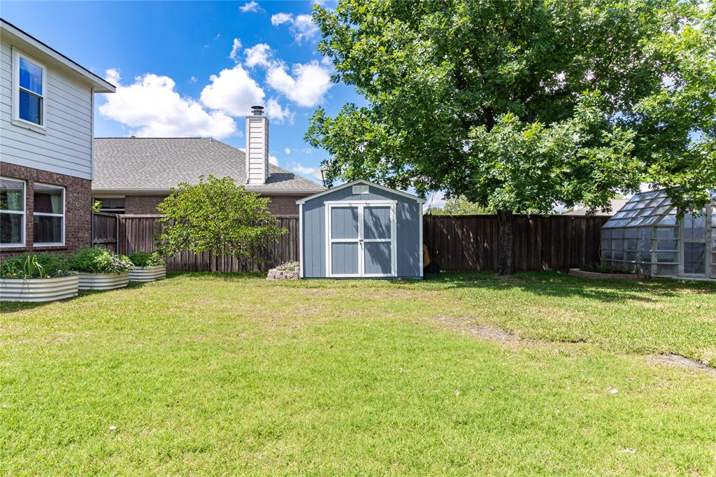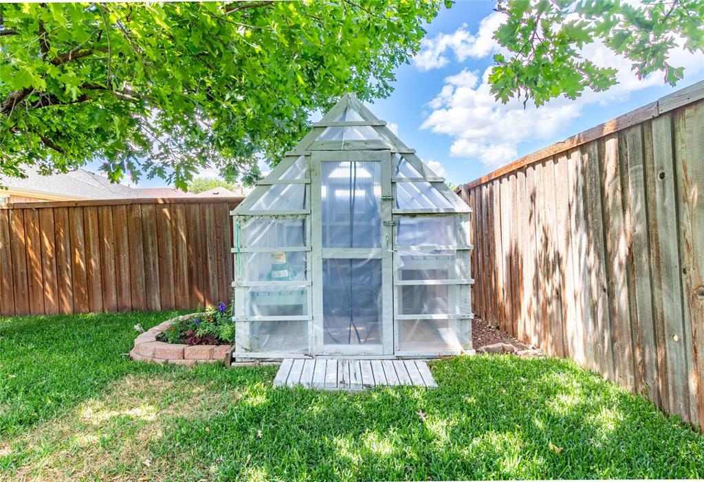 Step outside into your own private backyard oasis featuring mature trees, fresh sod, three raised garden beds, a greenhouse, and a storage shed—perfect for outdoor entertaining, gardening, or simply enjoying the peaceful setting.