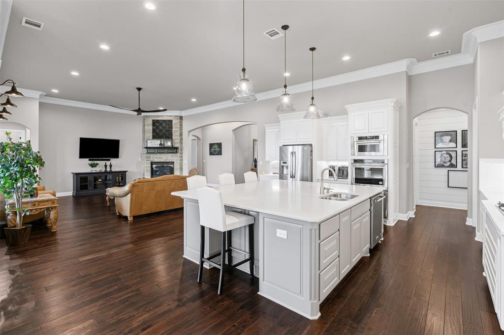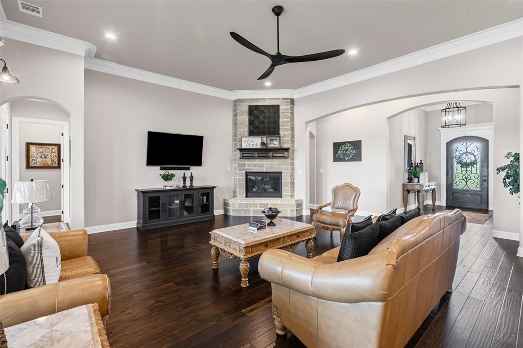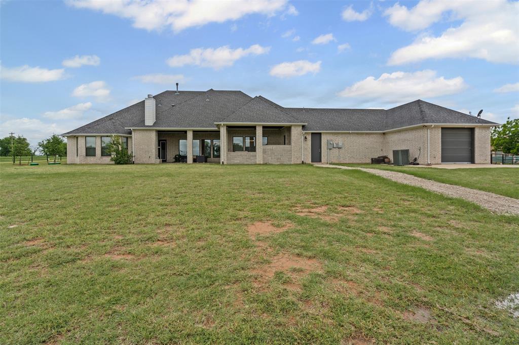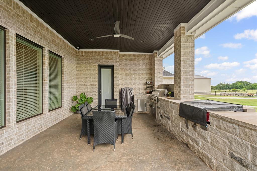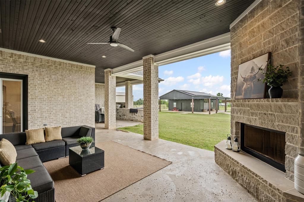 Energy smart construction features full spray foam, aero seal barrier interior walls, and a solar array discreetly mounted on the shop roof for reduced utility costs. Showcase interior includes designer lighting making a statement with chandeliers in the pantry, bathrooms, closets, and bedrooms that blend artfully with rich millwork, custom cabinetry, and upscale surfaces throughout. Spacious patio where every comfort of the indoors meets the beauty of the open sky. Wall mounted TV hangs above a stone fireplace, perfect for catching the game or a movie while flames crackle warmly beneath. Just a few steps away, a built in grilling station for cooking and sunset dinners. The oversized garage has 3 vehicle bays plus two additional bays perfect for your recreational toys or lawn mowers. Across the breezeway is a private office and storage area. Your 1200 sqft dream shop awaits. Fully spray foamed with its own electrical service, plumbed for bathroom, ample parking for boats, tractor or ATVs, and a heated and cooled fitness studio. With over 3 acres of land, this yard is a green canvas ready for every pursuit. Ideal for an expansive garden, pool, outdoor living, or just giving your dogs room to play. Perimeter is fully fenced. 40 planted, irrigated trees create a living privacy screen. It’s a rare blend of rural space and conveniently located to town. Every detail of this property speaks to meticulous planning and investment, delivering a rare combination of elegance, practicality, and sustainability. Discover a property that truly has it all.