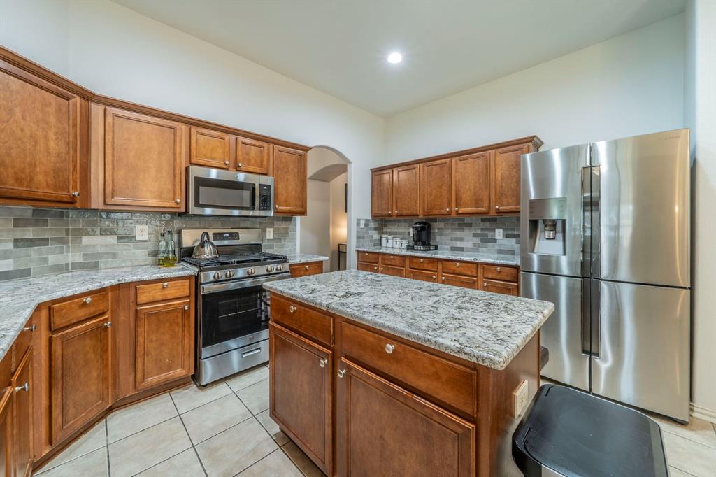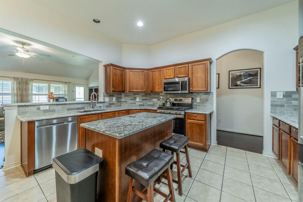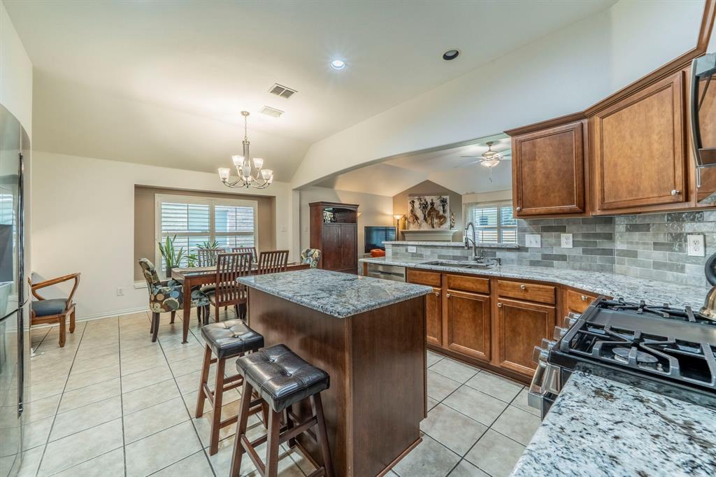 At the heart of the home is the fully upgraded kitchen, complete with sleek granite countertops, a modern tile backsplash, large island, pantry, breakfast bar, and a gas range—ideal for everyday living and entertaining.