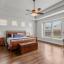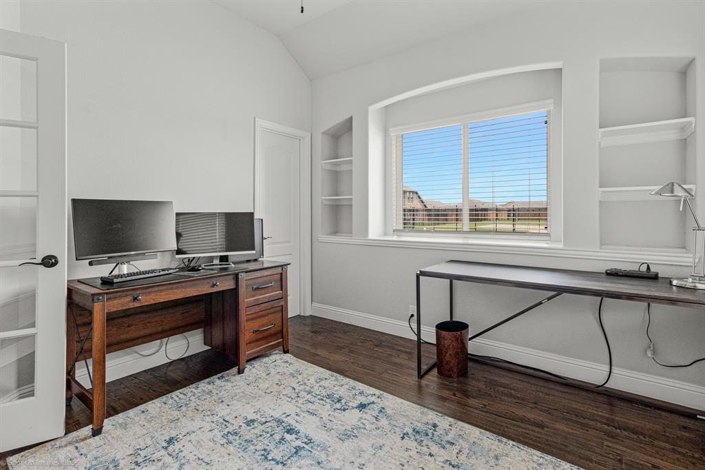 The luxurious primary suite offers a serene retreat with a spa-inspired bath complete with a rain shower head, deck-mounted tub, vanity with knee space, and dual closets with sweater-shoe shelves. Additional upgrades include a vanity cabinet with Level 3 granite in the powder bath, a guest bath with a tiled mud pan shower, and a built-in dresser in the guest room closet. Function meets elegance in the mudroom and utility room—both equipped with upper-lower cabinetry and granite countertops. Bedroom 4 doubles as a stunning study with custom 8ft bookcase shelving.