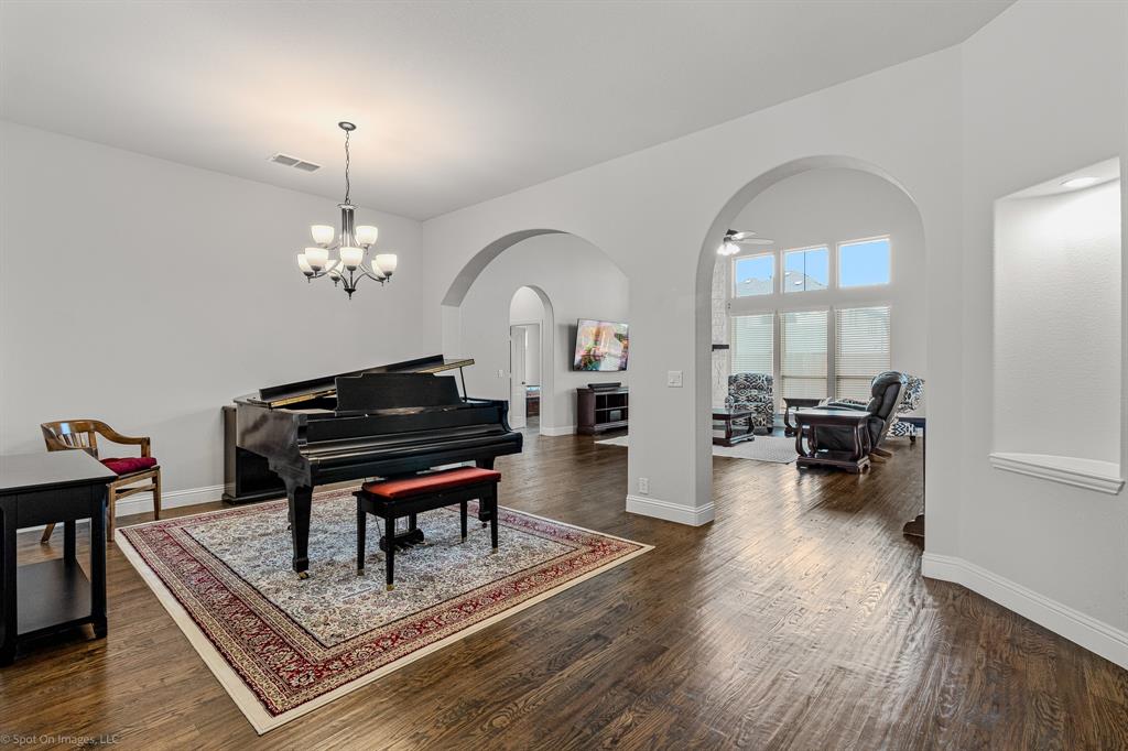 Step inside to hand-scraped wood floors that flow through the entry, living spaces, primary suite and study (4th bedroom). The heart of the home is the deluxe kitchen, featuring a 36” five-burner cooktop, pot filler, pendant lighting, under-cabinet lighting, glass-front cabinets, pot & pan drawers, and Level 3 granite countertops. Entertain with ease around the oversized island and enjoy the open flow into the family room, highlighted by striking wood beams and a floor-to-ceiling stone fireplace with hearth.