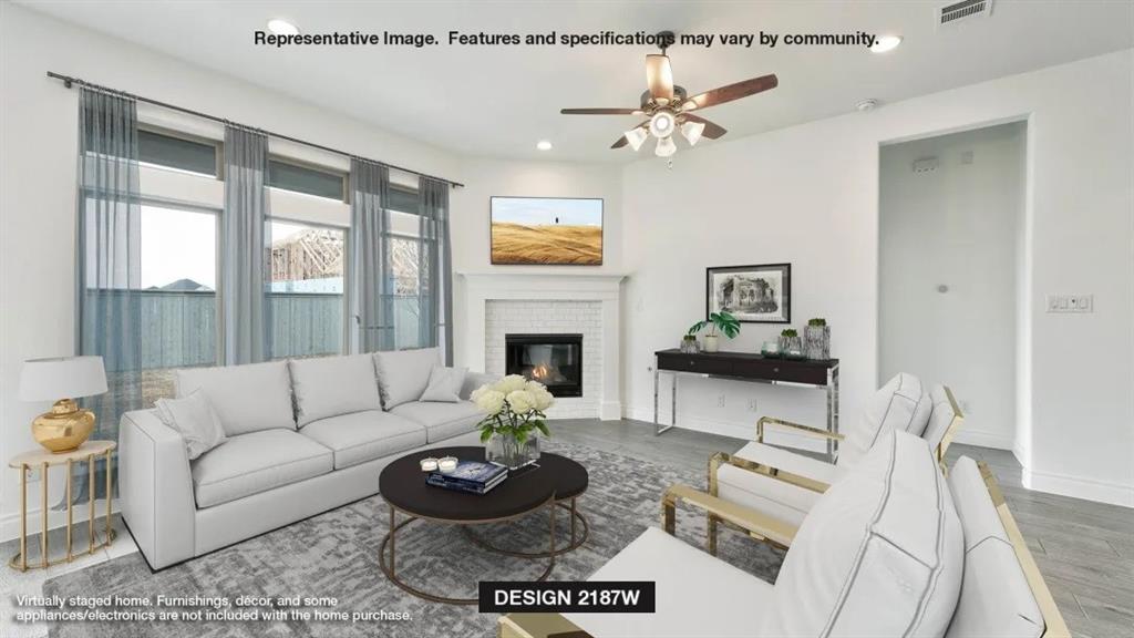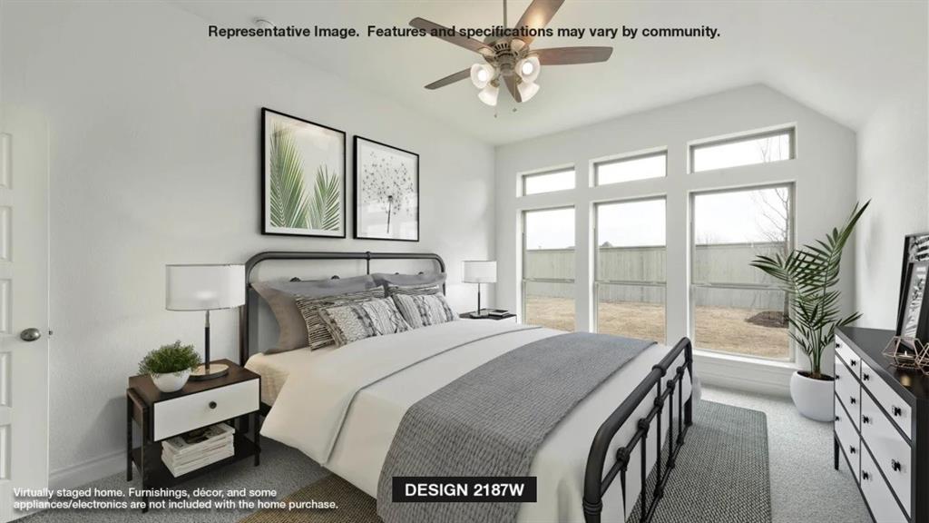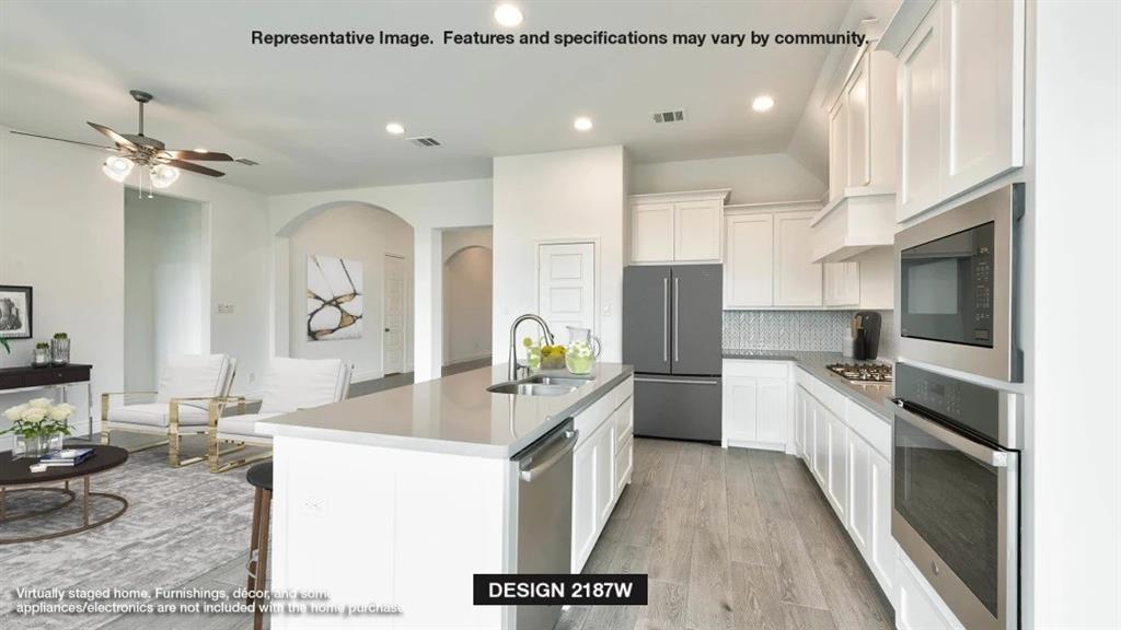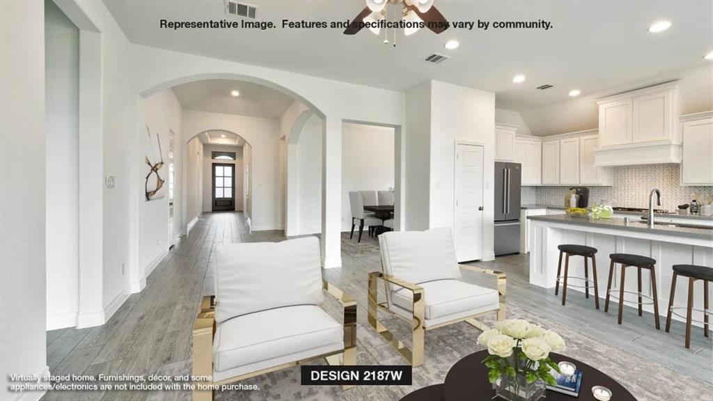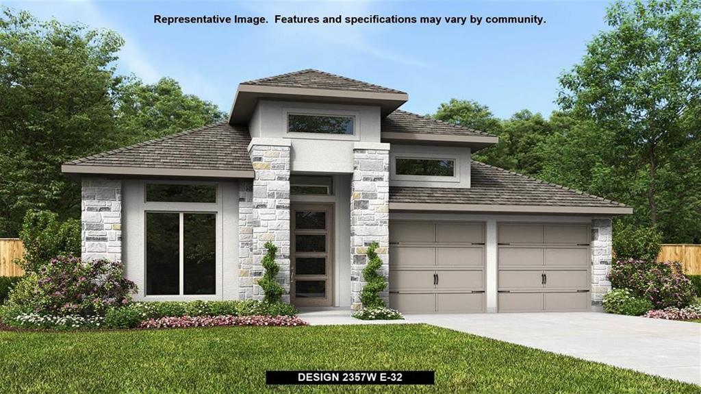 Extended entry highlights 12-foot coffered ceiling. Home office with French doors set at entry. Dining area flows into open family room with wall of windows. Open kitchen offers extra counter space, corner walk-in pantry and generous island with built-in seating space. Spacious primary suite. Double doors lead to primary bath with dual vanities, garden tub, separate glass-enclosed shower and two walk-in closets. Private guest suite with full bathroom and walk-in closet. All bedrooms include walk-in closets. Covered backyard patio. Mud room off two-car garage.