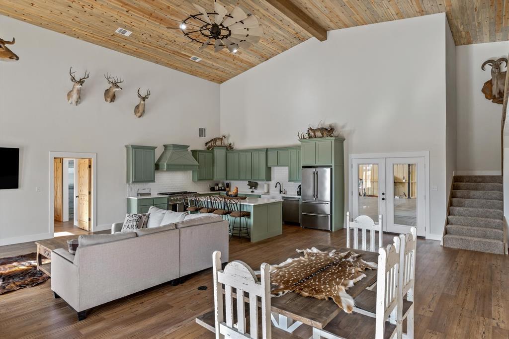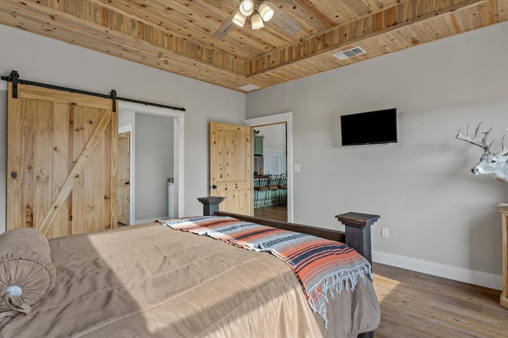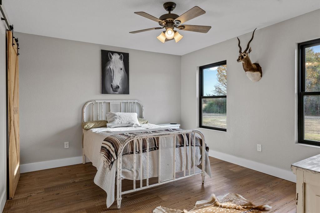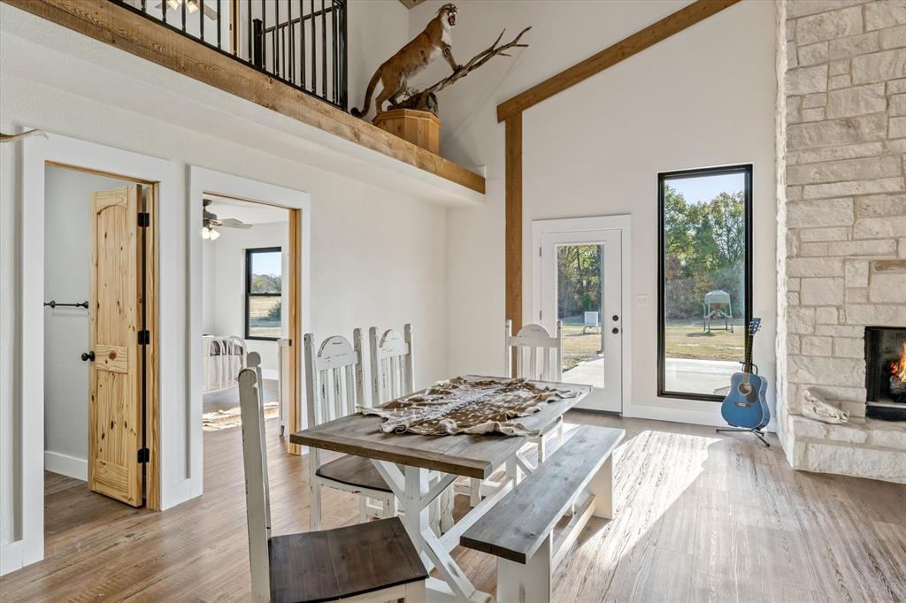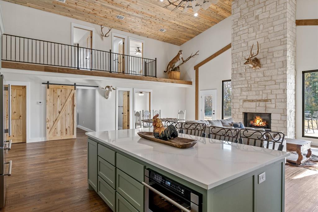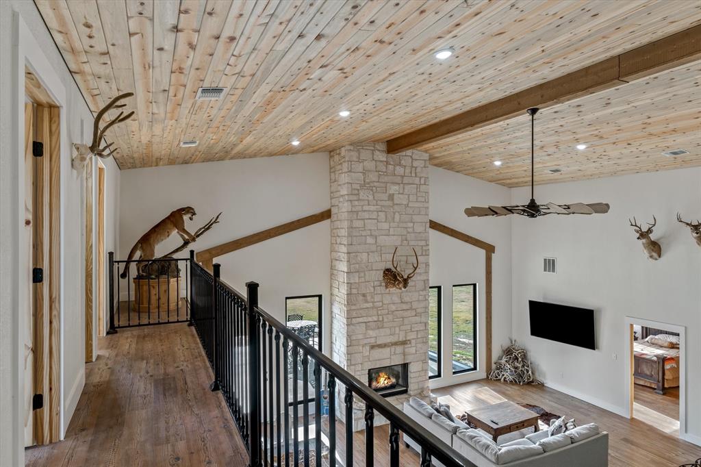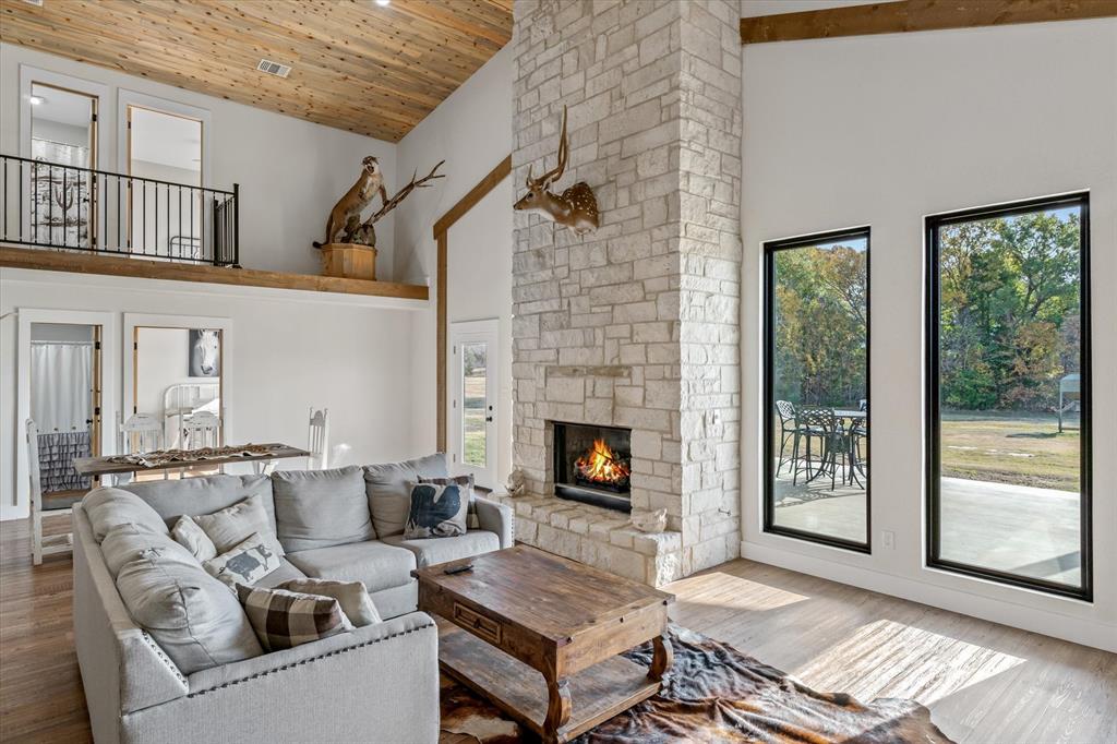 The Edgewood ISD gem you've been waiting for! Soaring ceilings and expansive windows to view the deer that walk right up to your covered back porch. Already flat screen wired and ready for your lazy evenings on the back porch. Inside you will enjoy luxury details which include Blue Ponderosa Pine tongue and groove ceilings, a gas fireplace, CHEF'S KITCHEN featuring commercial grade stainless steel appliances that ALL STAY, drawer microwave in the oversized island, impressive 8 burner, and double oven gas range. The efficiency was well thought out with the upstairs having it's own separate HVAC unit and all gas appliances including a tankless water heater. The home and shop are spray-foamed with an interior dehumidifier. Every room in this house is OVERSIZED, primary bedroom closet is 13x14!Primary suite is sequestered and has an ensuite bathroom which includes a separate glass enclosed walk in shower, CLAWFOOT TUB, and dimmable, fogless LED mirror on the double vanity, and a separate toilet room. There are two bedrooms and a full bath upstairs and one more downstairs bedroom overlooking the wildlife out back on level 1. Separated by the large laundry room with ample storage, the downstairs office can be used as 5th bedroom and has it's own exterior door into the shop. Attached 2000 sq. ft. shop with three 14-ft doors on automatic openers, paved roads, insulated shop, additional covered parking outside the shop doors with hot water on outdoor water faucet, means your truck never has to be dirty again. Enjoy all of the benefits of peaceful country living without the mess. Efficient, stylish, and move-in ready! Furniture can be purchased. Additional land available from another seller not related to this sale.