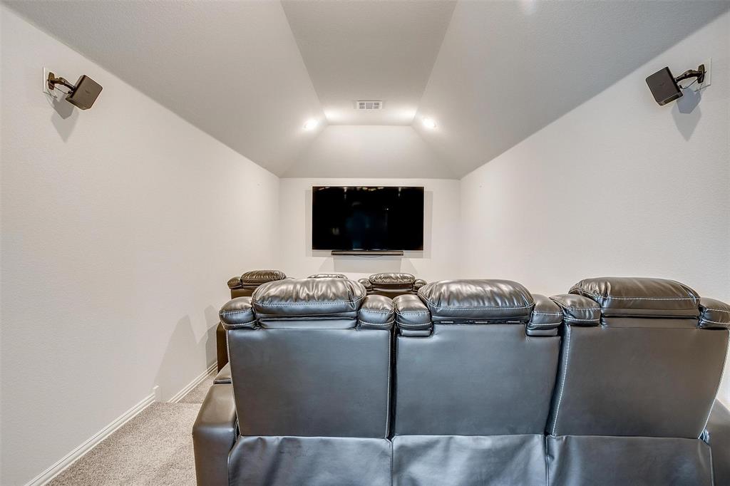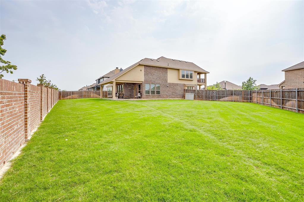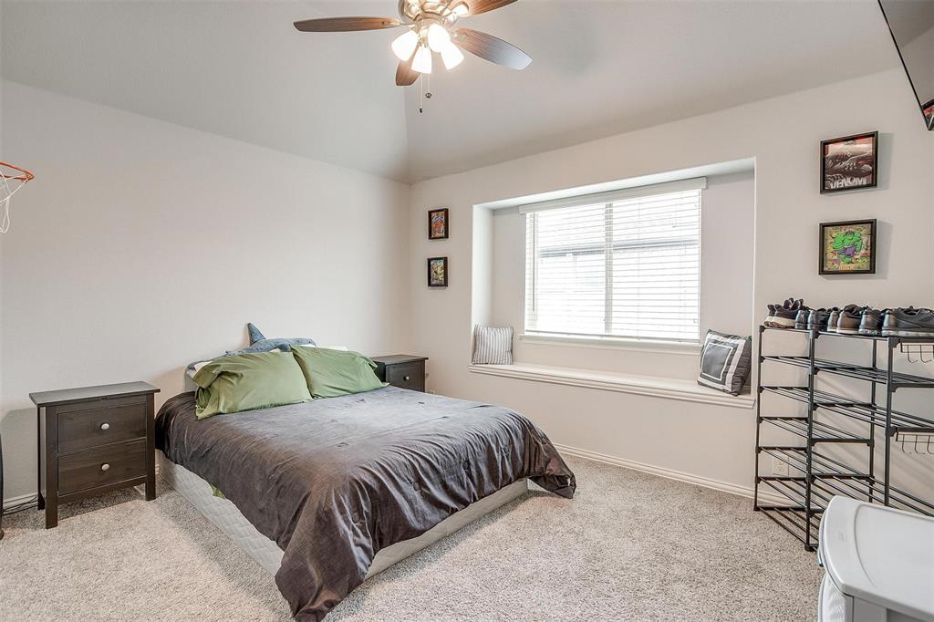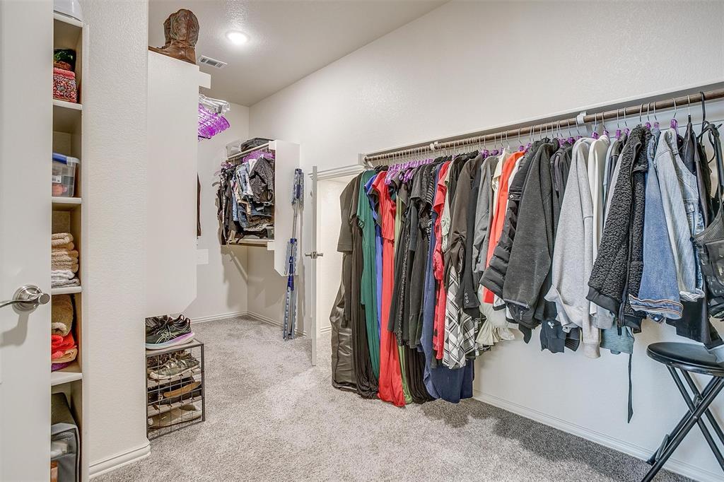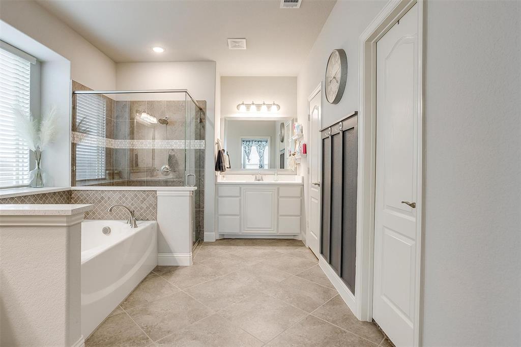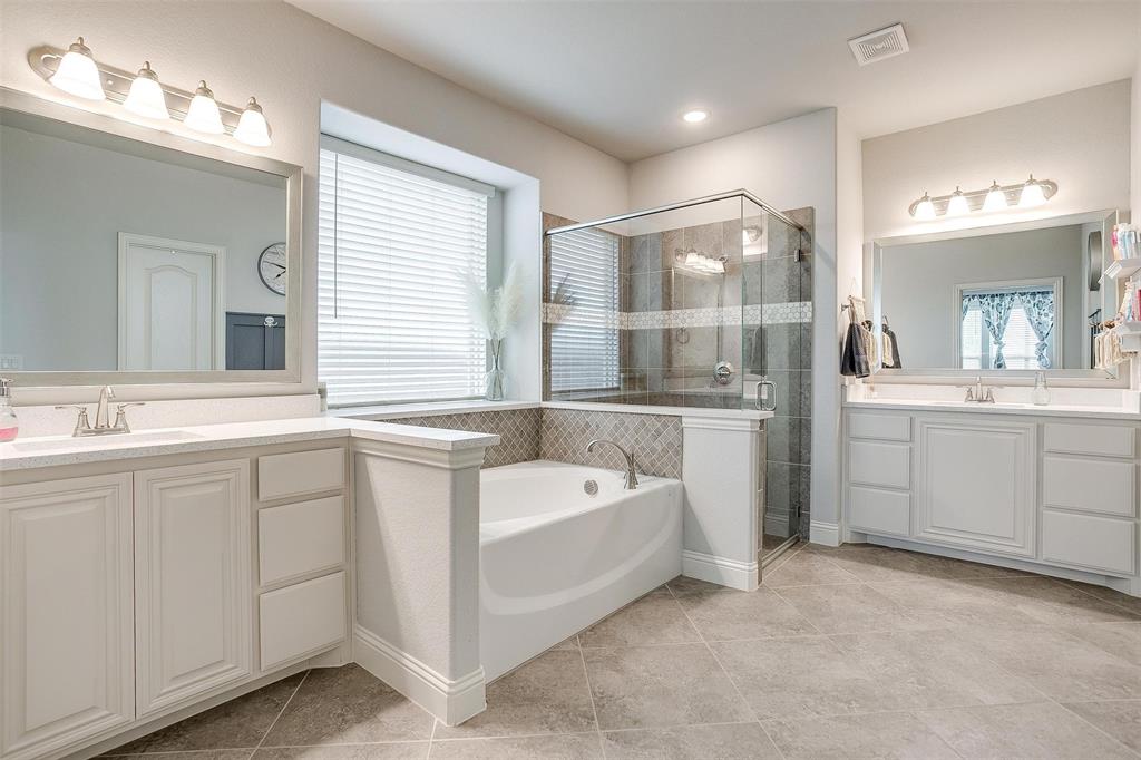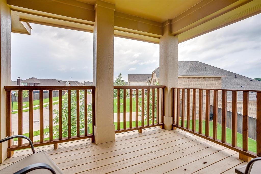 The primary suite is a true retreat, large windows let in natural light. Read a book under a blanket relaxing on the window seat. Ensuite primary bathroom complete with a garden tub, separate shower, and a large walk-in closet featuring a built-in tornado shelter and custom organization system. All bedrooms are generously sized with walk-in closets. The upstairs offers a game room, media room, along with a spacious balcony perfect for relaxing. Enjoy the outdoors with a covered, extended back porch equipped with TV-ready plug and cable, solar-powered lights, and a brick wall adding privacy. Engineered wood floors, two water heaters, two AC units, Wi-Fi garage sensors, and a greenbelt view round out the incredible features of this exceptional property. Just minutes from local schools, shopping, and dining!