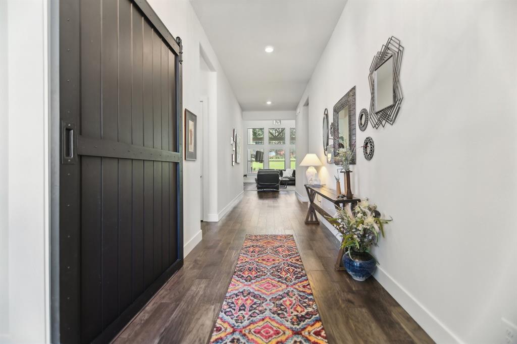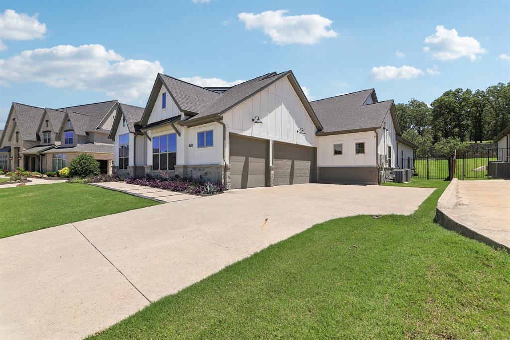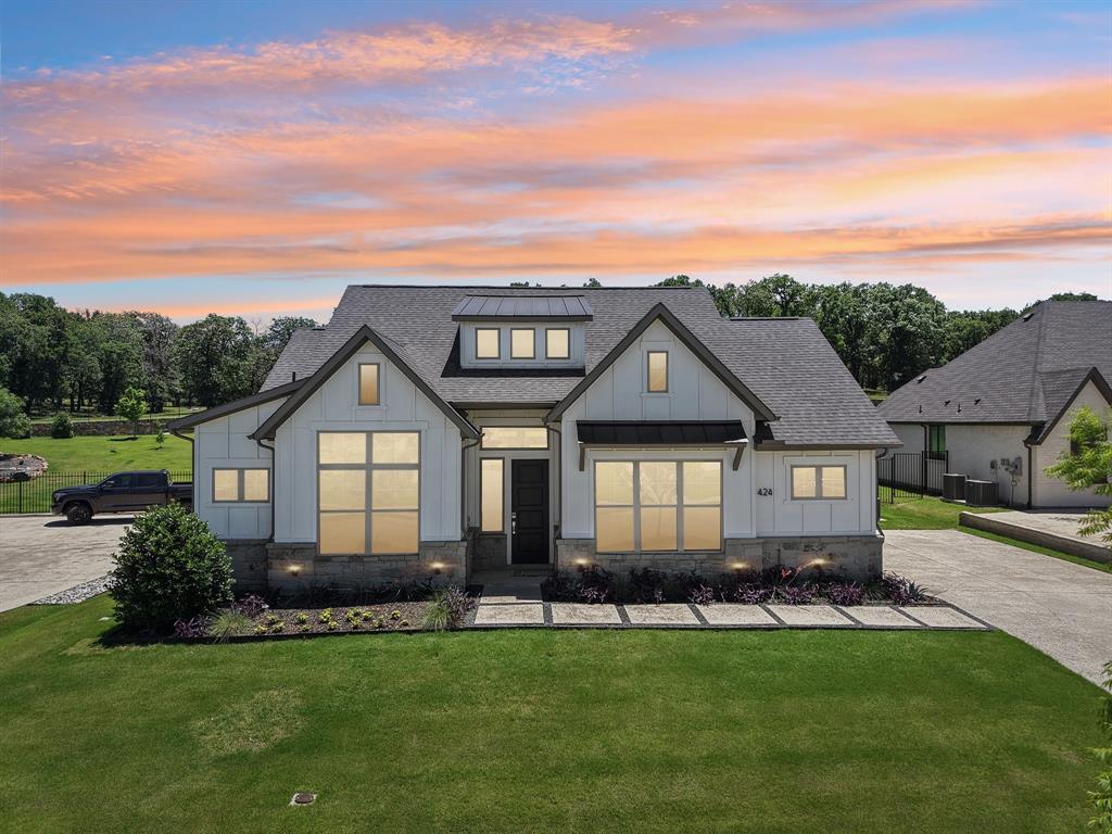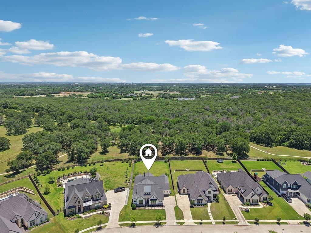 Seller offering $5,000 in concessions in addition to $4,000 in lender incentives! Don't miss your chance to own the ONLY single-story home with a view for sale in 5T Ranch. This exceptional 4-bed, 3.5 bath home blends modern luxury with close-knit community and it's tucked away on a premium oversized lot with a tree-filled view. It's also zoned to Hilltop Elementary in the top-rated Argyle ISD! Step inside to warm wood flooring, high ceilings, & sun-drenched living spaces. The expansive kitchen is a chef’s dream, with stainless steel appliances, a gas cooktop, double ovens, quartz counters, an Instahot water dispenser, abundant cabinetry, & generous prep space—all overlooking the breakfast nook & spacious family room. It also has surround sound & a gas fireplace enhanced with a blower, but best of all a priceless view that will always remain! The primary suite is a luxurious retreat with cathedral ceilings, a spa bath, & an oversized custom walk-in closet featuring built-ins & a striking center island. Three additional bedrooms include two with walk-in closets & a thoughtfully positioned front mother-in-law suite offering ideal privacy. Plus, there is also a large front office. Outside, a beautifully designed extended patio with its own fireplace sets the stage for year-round outdoor living. Raised flower beds, enhanced drainage, professional outdoor lighting, & a sprinkler system complete the landscape. The home is also prewired for a future pool with two 240V & one 120V electrical leads in place. Additional features include money-saving solar panels, a 3-car garage with custom cabinetry & a workbench, an EV charging outlet, a fully decked attic with safety rails & an electric lift for effortless storage, & a professionally integrated Control4 system—providing seamless control of HVAC, audio-video, mesh Wi-Fi, & automated outdoor lighting. This home is positioned in one of Argyle’s most desired neighborhoods that includes a massive park & gorgeous walking trail.