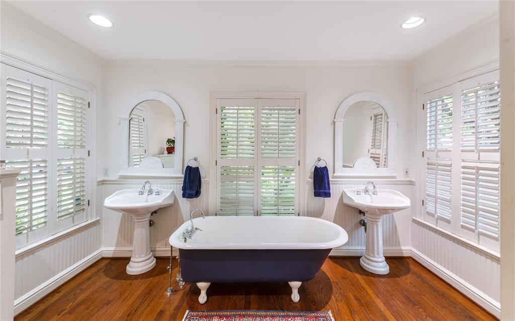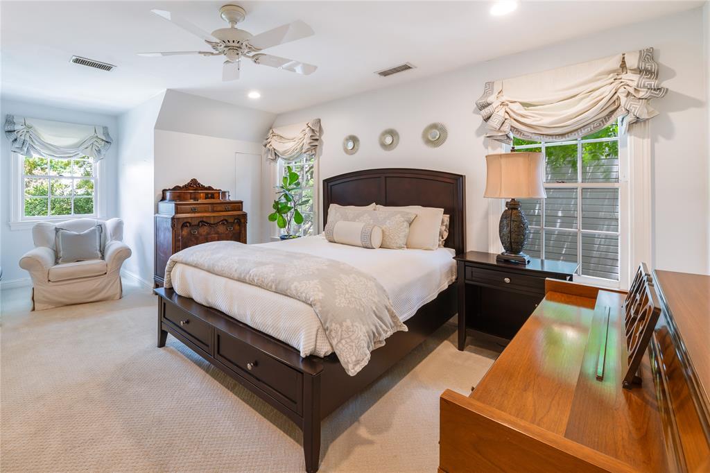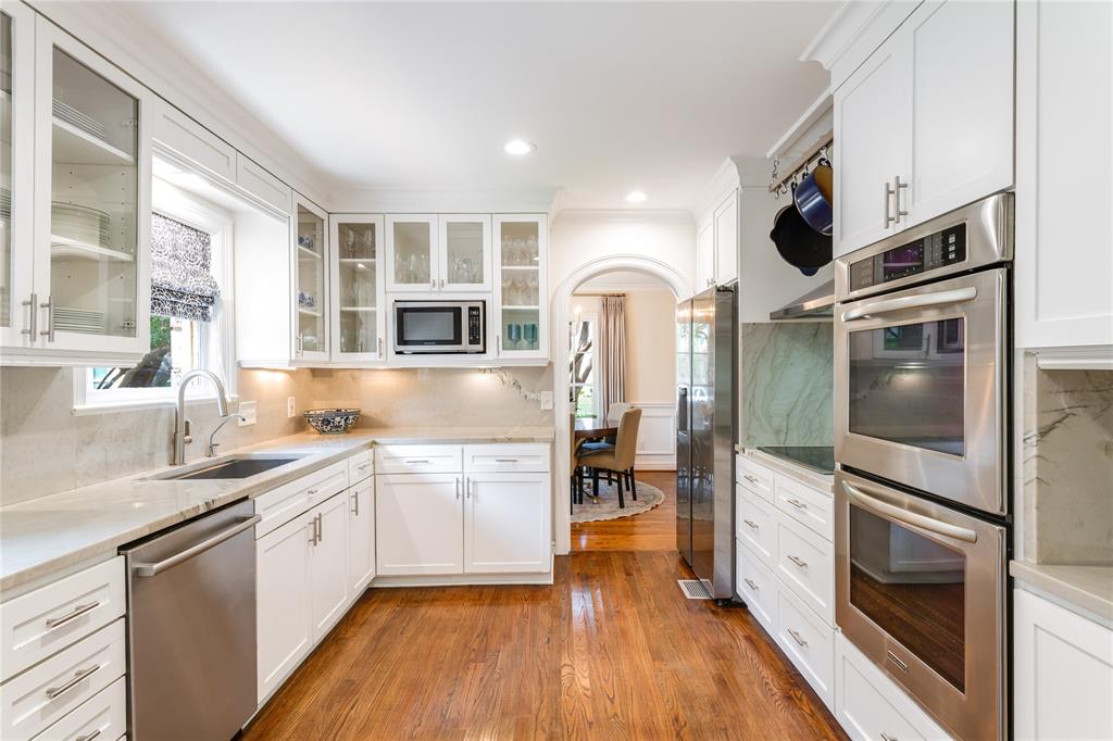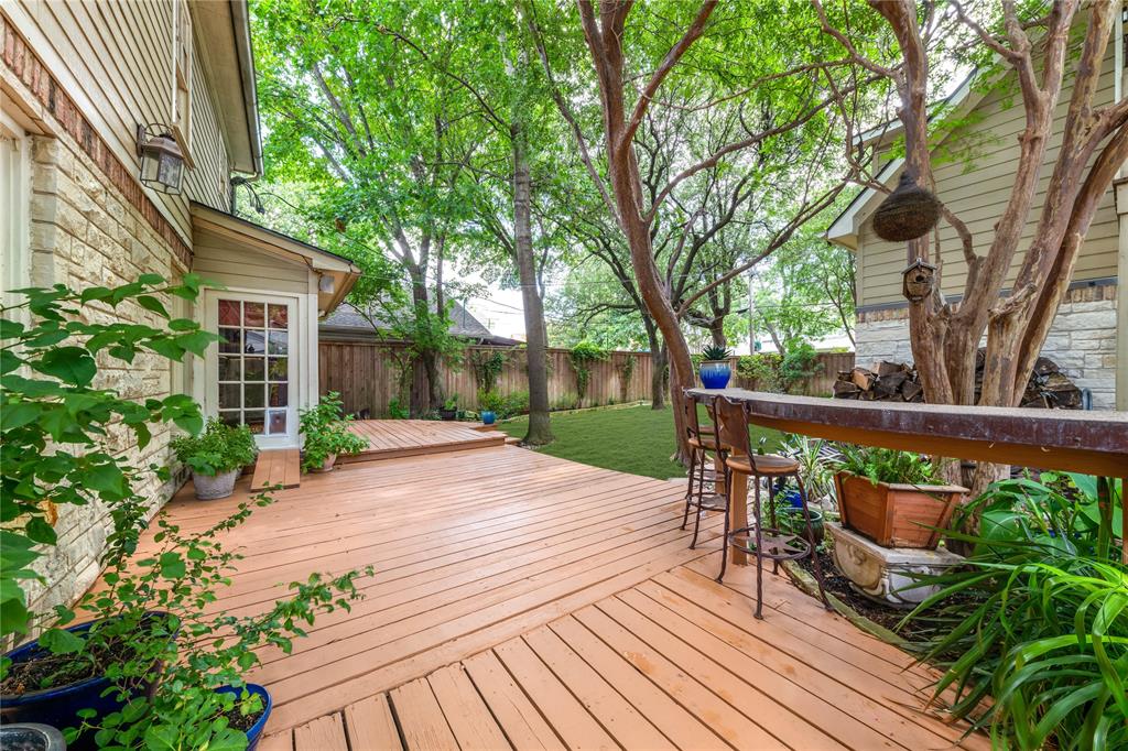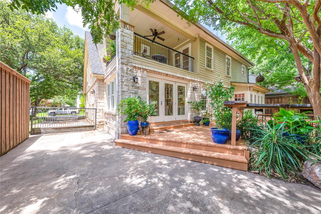 Located in one of University Park’s most sought-after locations and zoned to Hyer Elementary, this charming Austin stone traditional offers the perfect blend of comfort, space, and convenience. Enjoy walkability to parks, shopping and dining on Lovers Lane or Preston Center, plus easy access to work via Preston Road and the Tollway, and Highland Park schools. Designed with an excellent flow and easy layout, the home features both formal and casual living spaces, including a gracious living room with fireplace and an attached dining room filled with natural light. The updated kitchen, complete with stainless steel appliances, opens to a breakfast room and wet bar—perfect for morning coffee or weekend entertaining. The inviting family room connects seamlessly to the kitchen and overlooks the back patio and lawn, offering ideal indoor-outdoor living. Unique to this home are dual primary suites, one on each floor. The downstairs primary boasts two walk-in closets, a private office, and a spacious bath with separate tub and shower. Upstairs, the second suite offers its own updated bath, two walk-in closets, and access to a lovely covered balcony. Two additional upstairs bedrooms share a generously sized Jack-and-Jill bath, and all feature ample closet space. The upstairs utility room with sink adds everyday convenience. Out back, a detached two-car garage includes a spacious guest suite or bonus room with wet bar, full bath, and abundant storage—ideal for guests, playroom, or home office. The beautifully landscaped backyard is ready for gatherings, with plenty of space for a pool, play area, or outdoor entertaining. A motorized back gate adds privacy and security to the extended drive. This is easy University Park living at its best.