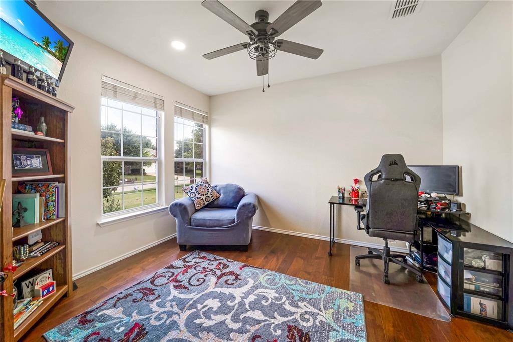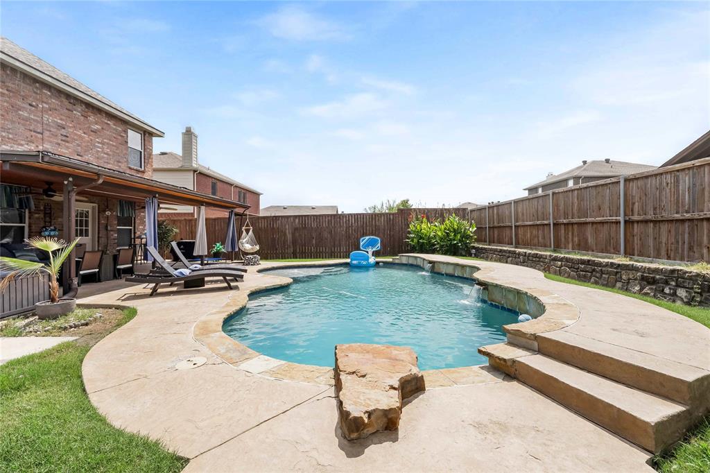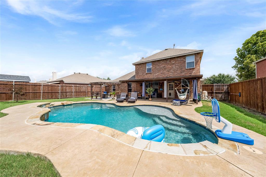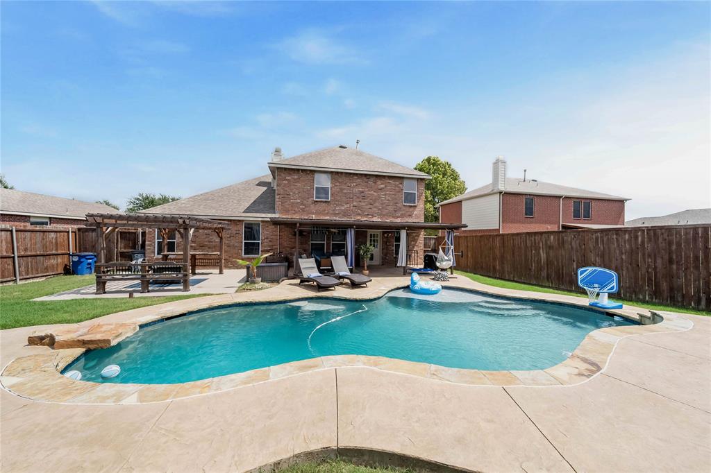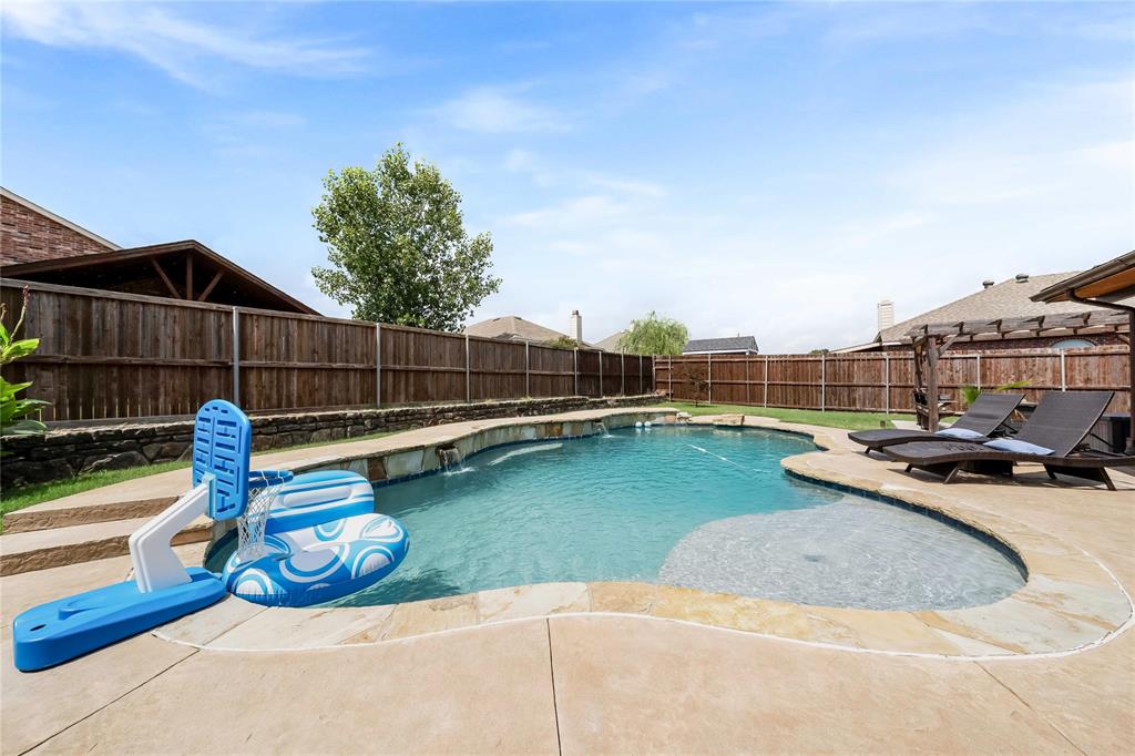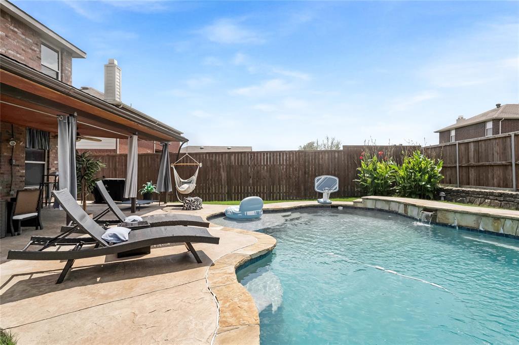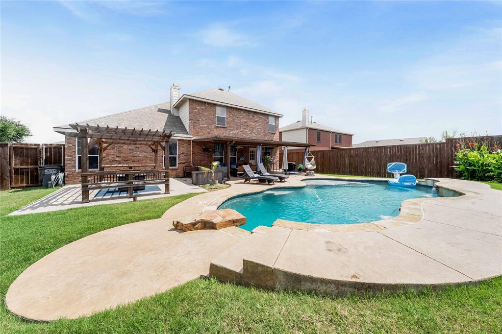 Gorgeous East-Facing Two-Story with Sparkling Pool! This stunning home showcases a light and bright open concept layout with tasteful upgrades throughout. Featuring 4 bedrooms plus a dedicated study! Beautiful hardwood floors flow through the main living areas, leading into the chef’s kitchen with two-tone cabinetry, quartz countertops, stainless steel appliances, and a walk-in pantry. The kitchen opens seamlessly to the spacious living room, anchored by a cozy fireplace, perfect for gatherings and everyday living.The private primary retreat is conveniently located on the first floor and boasts a spa-like bath with dual vanities, a soaking tub, glass-enclosed shower, and walk-in closet. Upstairs, you’ll find a spacious flex space along with secondary bedrooms for family or guests. Step outside to your backyard oasis, complete with an extended covered patio, pergola, sparkling pool with lounging benches and dive rocks, and a privacy fence! The large backyard provides plenty of room for pets or play, an ideal setting for Texas summers and year-round entertaining! Neighborhood amenities include a community pool, splash park, playground, and scenic walking trails. All this, just minutes from highway access, local restaurants, and shopping.