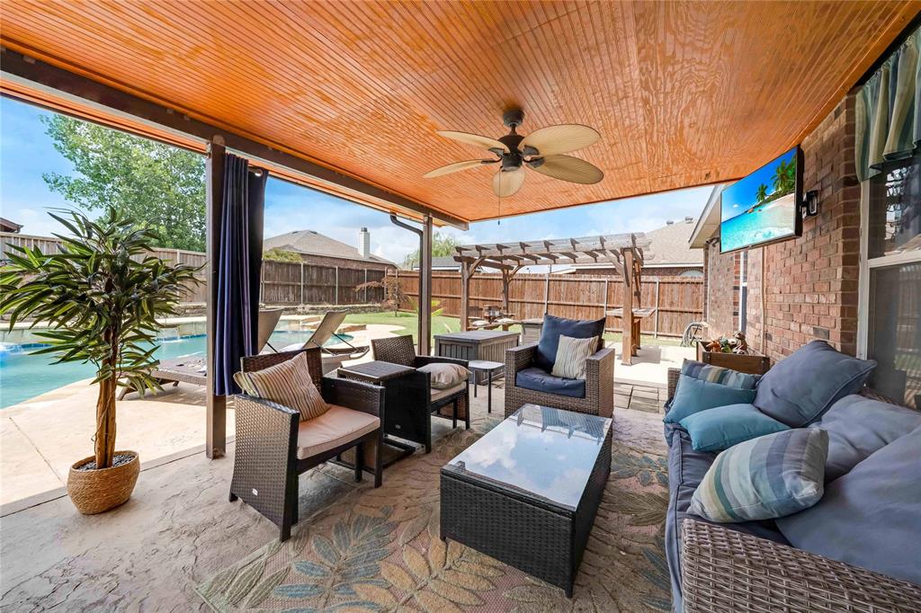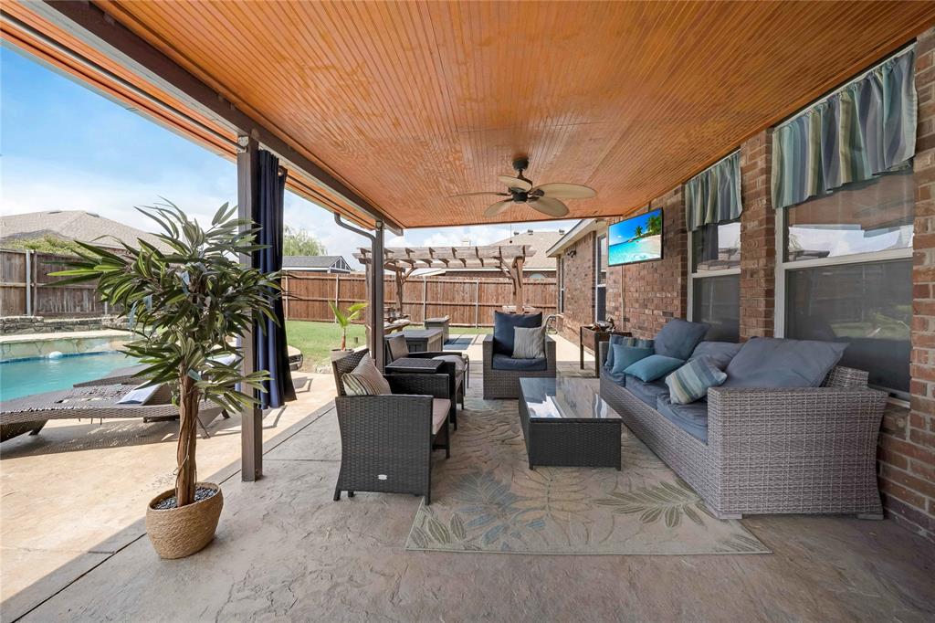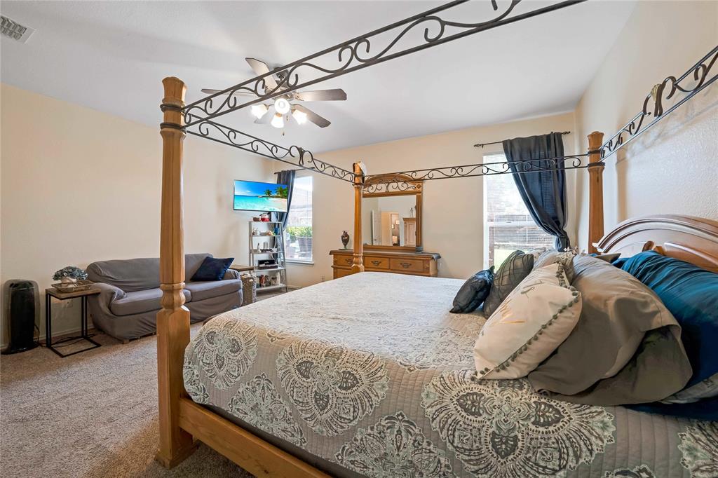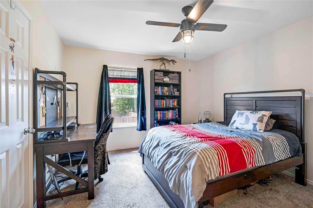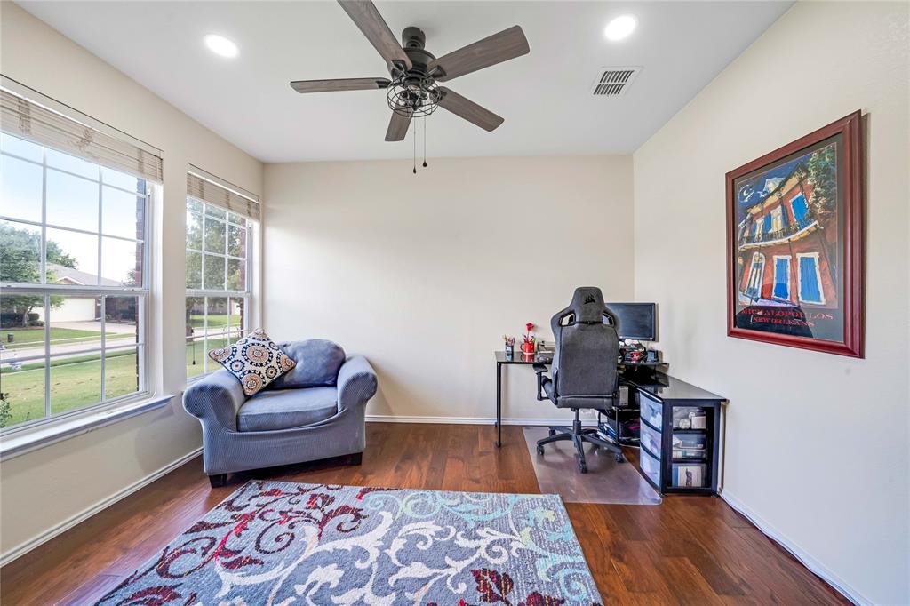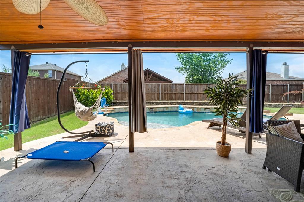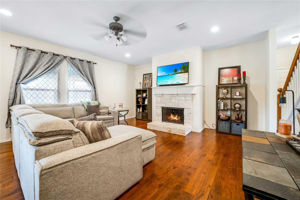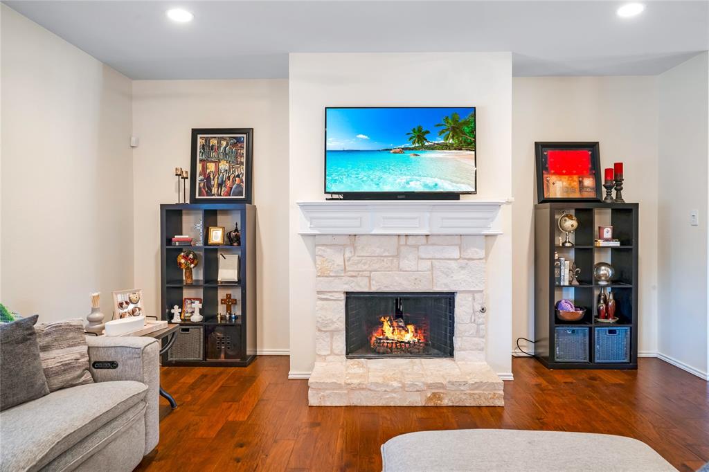 Gorgeous East-Facing Two-Story with Sparkling Pool! This stunning home showcases a light and bright open concept layout with tasteful upgrades throughout. Featuring 4 bedrooms plus a dedicated study! Beautiful hardwood floors flow through the main living areas, leading into the chef’s kitchen with two-tone cabinetry, quartz countertops, stainless steel appliances, and a walk-in pantry. The kitchen opens seamlessly to the spacious living room, anchored by a cozy fireplace, perfect for gatherings and everyday living.The private primary retreat is conveniently located on the first floor and boasts a spa-like bath with dual vanities, a soaking tub, glass-enclosed shower, and walk-in closet. Upstairs, you’ll find a spacious flex space along with secondary bedrooms for family or guests. Step outside to your backyard oasis, complete with an extended covered patio, pergola, sparkling pool with lounging benches and dive rocks, and a privacy fence! The large backyard provides plenty of room for pets or play, an ideal setting for Texas summers and year-round entertaining! Neighborhood amenities include a community pool, splash park, playground, and scenic walking trails. All this, just minutes from highway access, local restaurants, and shopping.