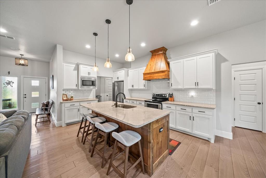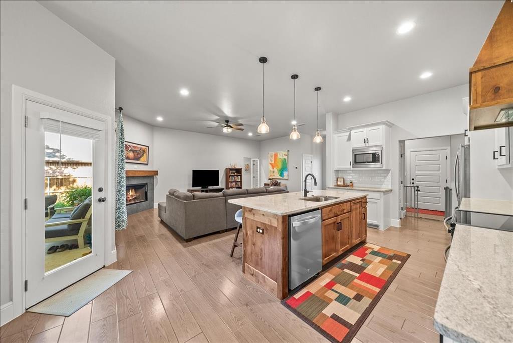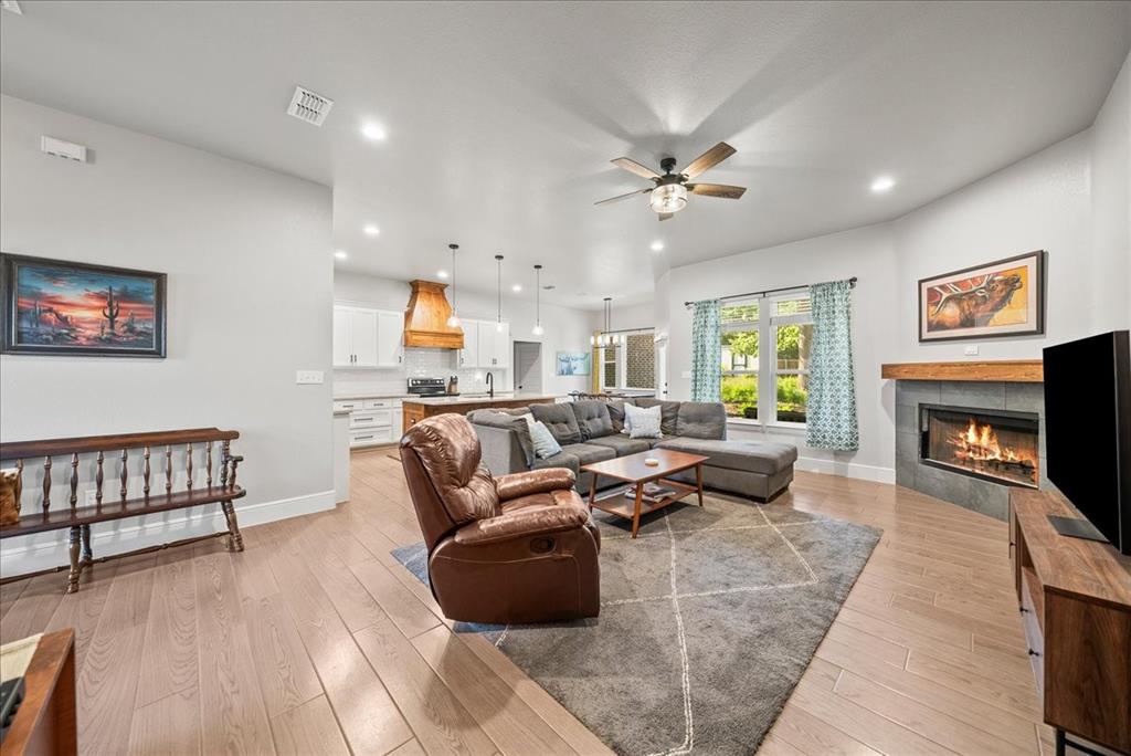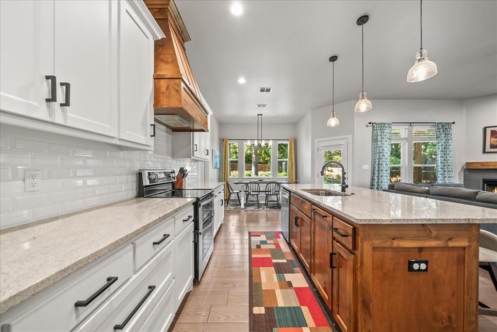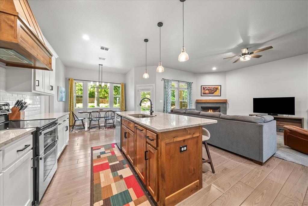 Step inside to an open floor plan filled with warmth and style. The living area features wood-look tile flooring, a cozy wood-burning fireplace, and seamless flow into the kitchen—perfect for everyday living and entertaining. The kitchen is a chef’s dream with custom knotty alder cabinets, granite countertops, a large island, walk-in pantry, and plenty of prep and storage space.