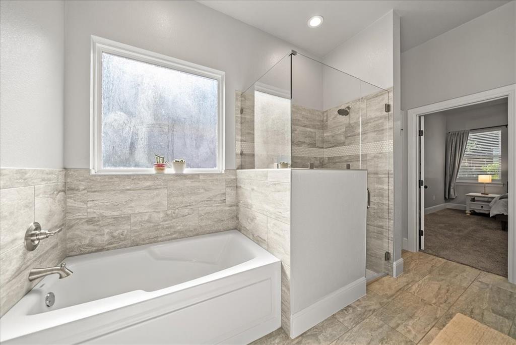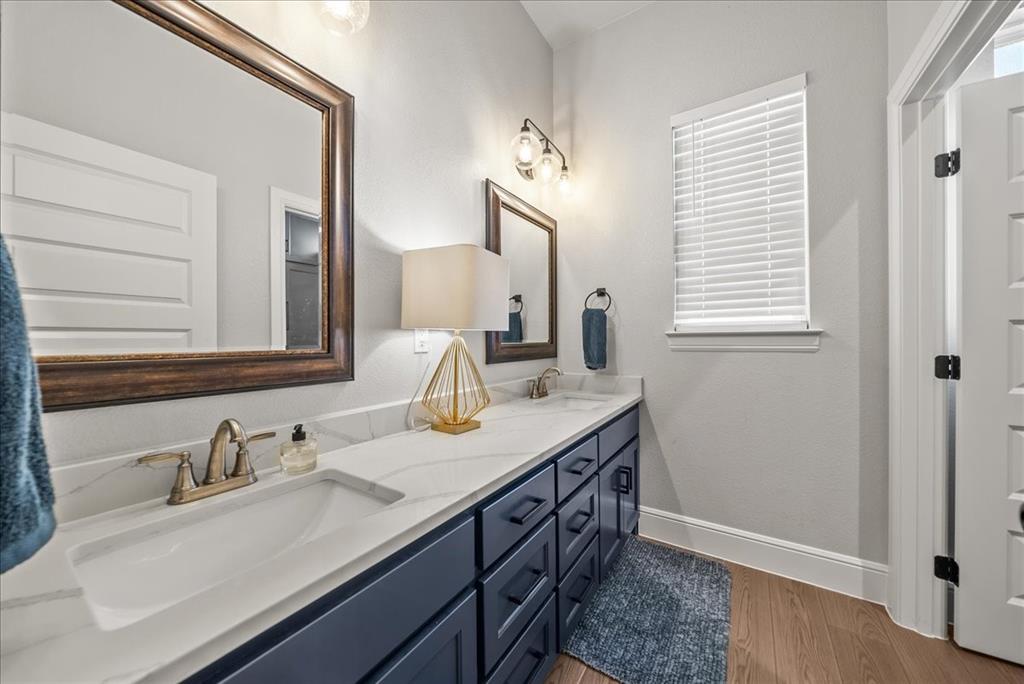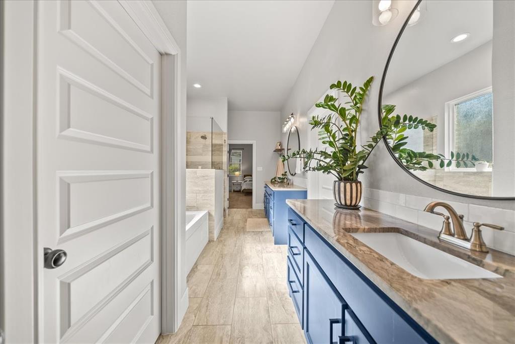 This 4-bedroom, 2-bath home is thoughtfully designed with a split-bedroom layout. The master suite is a peaceful retreat with a spa-like bath that includes separate vanities with quartzite counters, a walk-in closet, a soaking garden tub, and a separate shower. The guest bath and laundry room are equally impressive, each featuring sleek quartz counters.