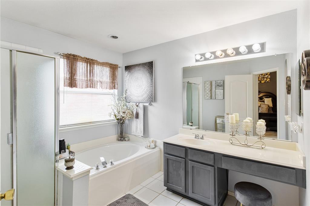 The spacious primary suite is a true retreat, complete with walk-in closets and a luxurious en-suite bath featuring a separate shower, garden tub, and built-in shelving. The second full bathroom includes double sinks—ideal for busy mornings or guest use.