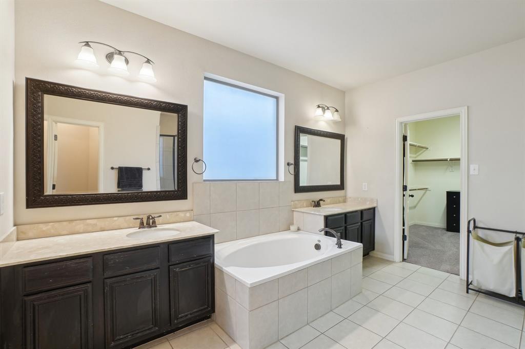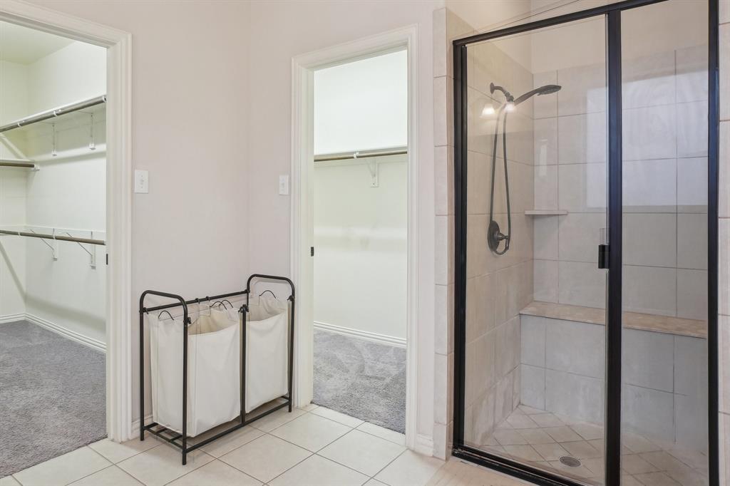 The spacious primary suite is located on the main floor and features a luxurious ensuite bathroom with dual vanities, a glass-enclosed shower, soaking tub, and two large walk-in closets.