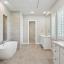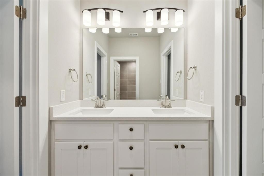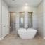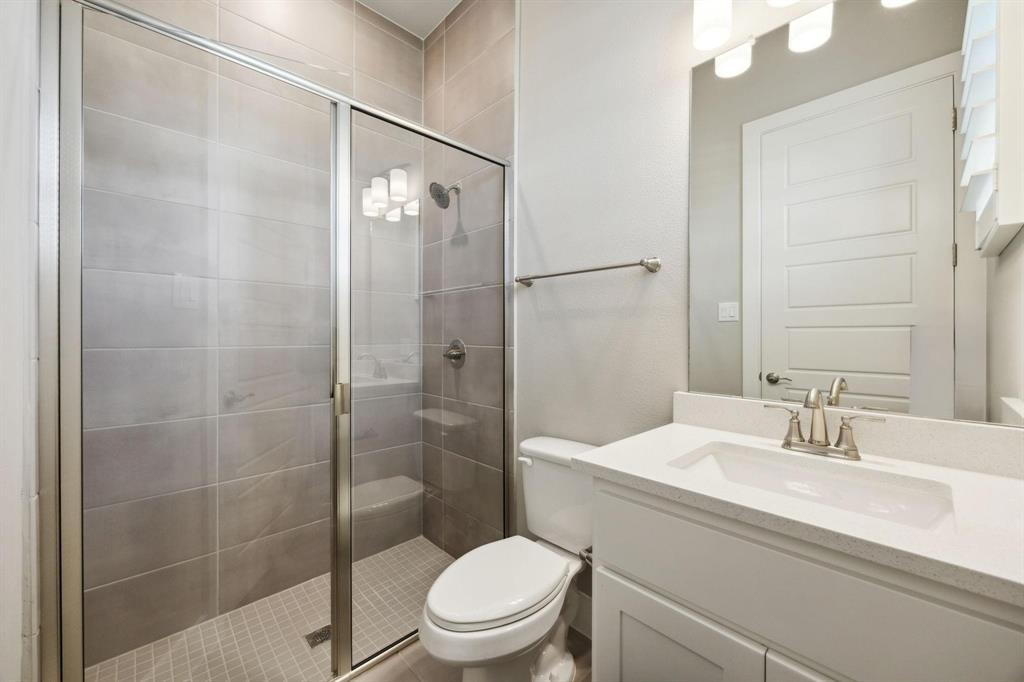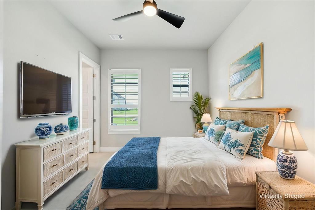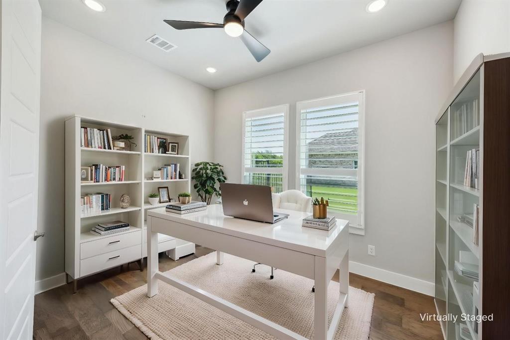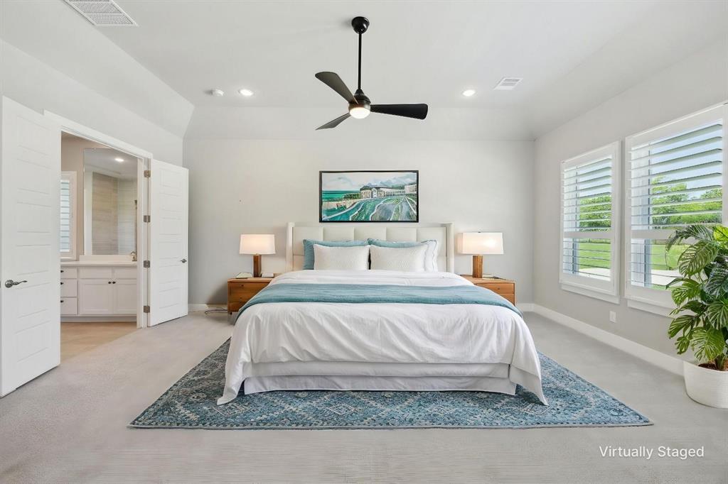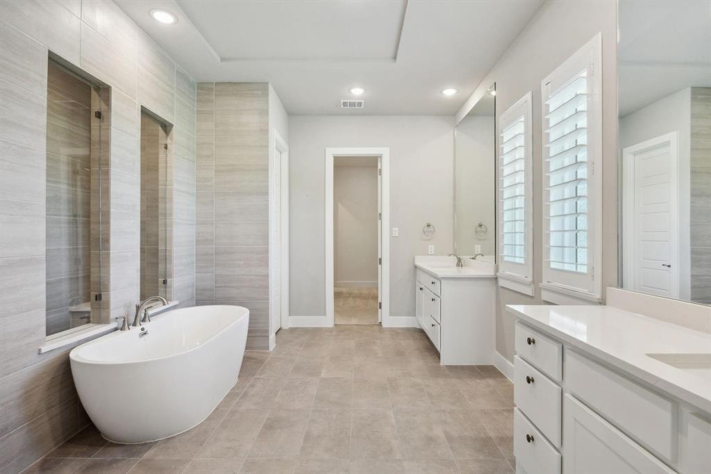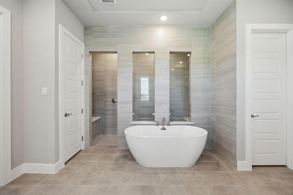 The luxurious owner's suite on the main floor is a private sanctuary with views of the serene backyard. Indulge in the spa-like bathroom, featuring separate vanities, a linen closet, a walk-in shower, and a designer free-standing tub. A spacious walk-in closet connects to the laundry room (with a sink, cabinets and quartz counters), offering unmatched convenience. The main level also houses a guest bedroom with an ensuite full bath & walk in closet, ideal for accommodating visitors.