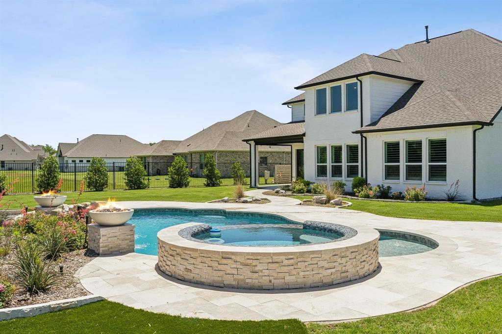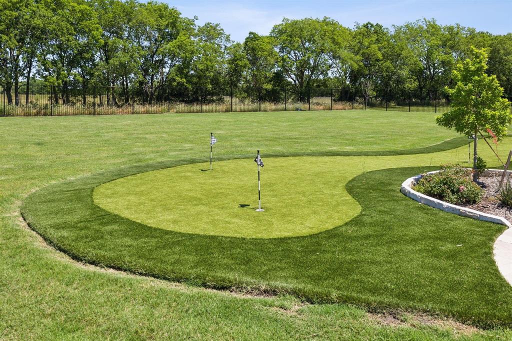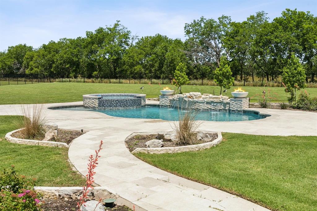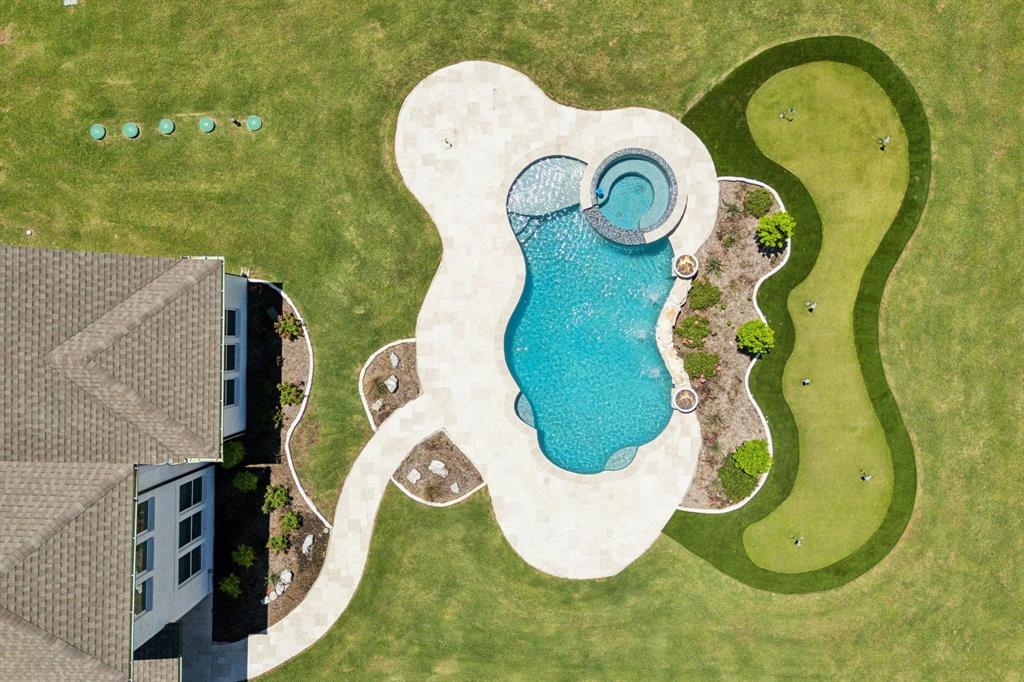 Relax & entertain with ease in your outdoor retreat featuring a sparkling pool & spa, CHILLER, & HEATER. Hone your skills on the putting green. The fire bowls on either side of the waterfall feature help make the backyard feel like an oasis. The lush landscape & enchanting design create an atmosphere of whimsy & luxury, offering endless possibilities for outdoor enjoyment.