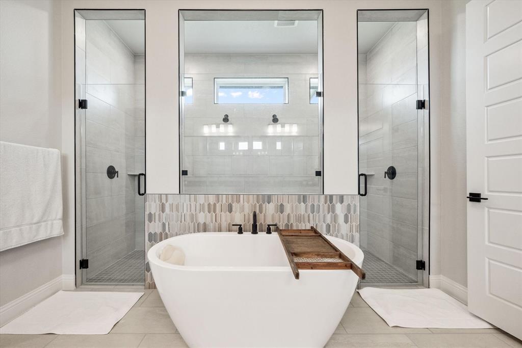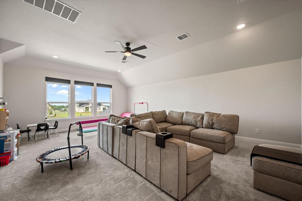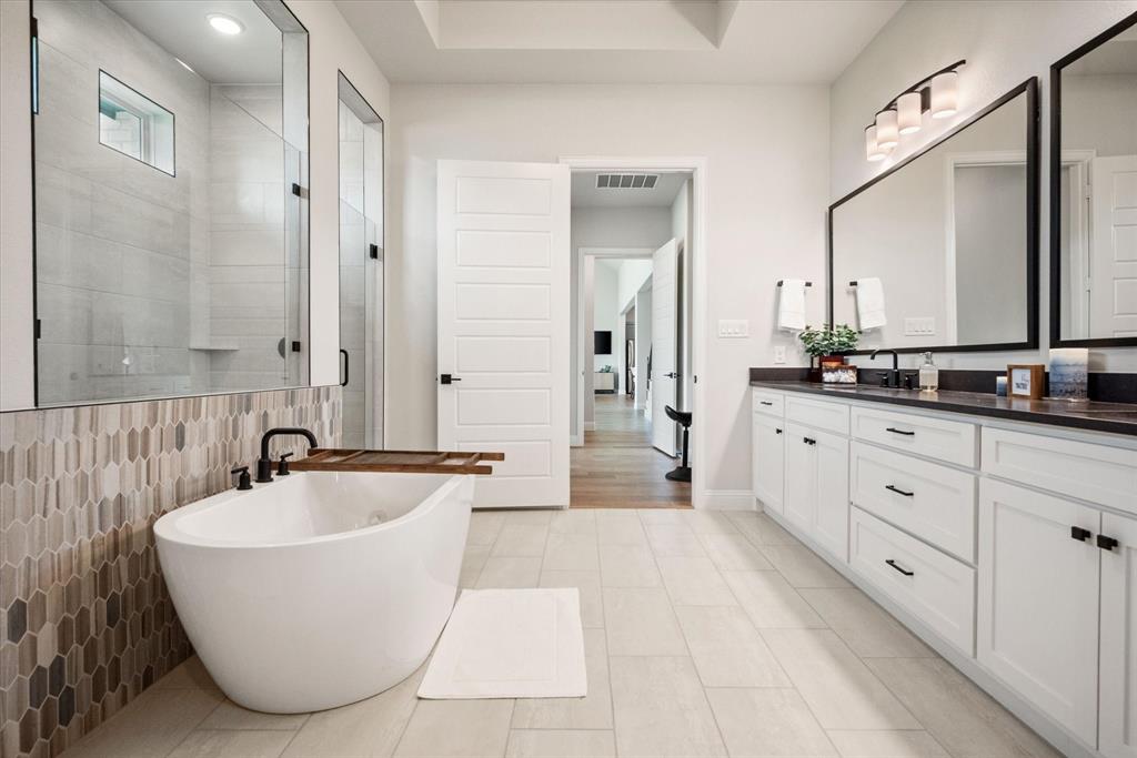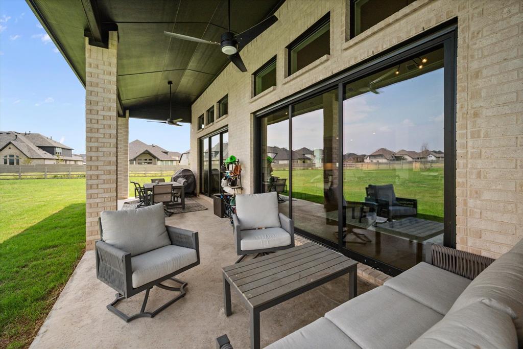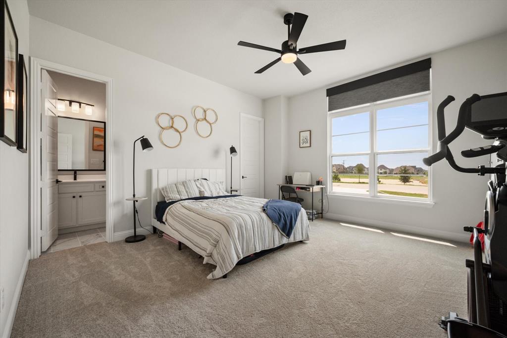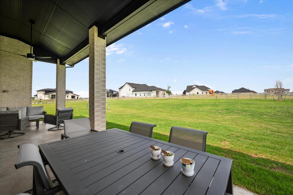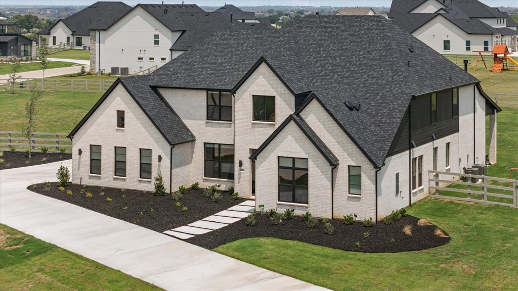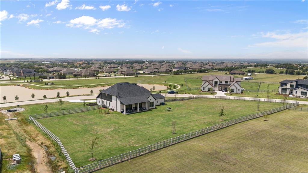 BETTER THAN NEW!! 2024 masterpiece with all of the new construction kinks worked out. Nestled in the sought-after, master-planned community of Harvest directly across from the serene community fishing pond. Featuring 5 spacious bedrooms, each with its own ensuite bathroom, plus a convenient half bath for guests; this home is ideal for luxurious living and effortless entertaining. Enjoy the elegance of a HUGE chef’s kitchen outfitted with a gas cooktop, double ovens, walk-in pantry, and abundant cabinetry. The open-concept floorplan flows seamlessly into a large back patio, highlighted by a stunning sliding glass wall and pre-wired for outdoor speakers—perfect for gatherings. This smart home, powered by HomePro Smart Home Services, also includes a private office, a media room pre-wired for surround sound, and a massive utility room with cabinetry and a sink. The primary suite offers a spa-like retreat with a garden tub, a walk-through shower, and a customizable closet system. Additional features include: -Second bedroom with ensuite on the main level – ideal for multi-generational living or guests -Tesla charging station and epoxy flooring in the oversized 4-car garage -Circle driveway for added curb appeal and convenience -Full sprinkler system, fenced 1.69 acre lot, and French drains -Room-darkening blinds -City water and sewer -Argyle ISD and a low tax rate. This home offers the perfect blend of elegance, functionality, and location—don’t miss your chance to own a slice of luxury in Harvest!