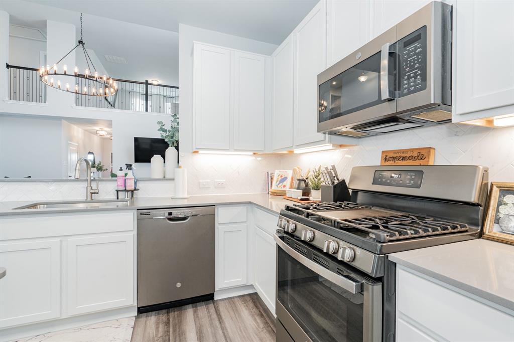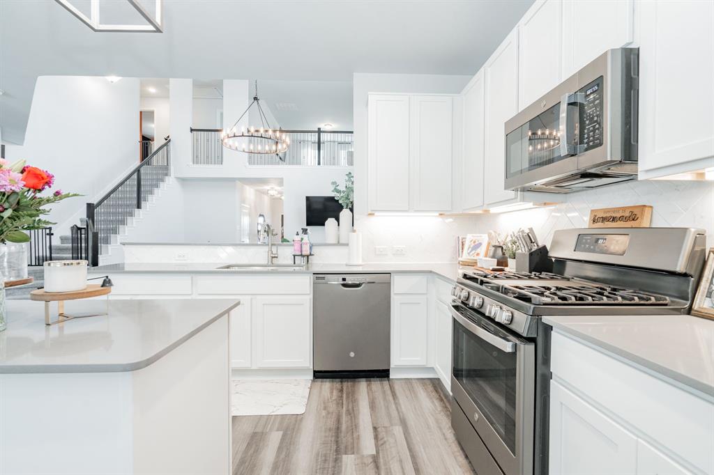 • Gourmet kitchen with quartz countertops, oversized prep island, and coffee bar