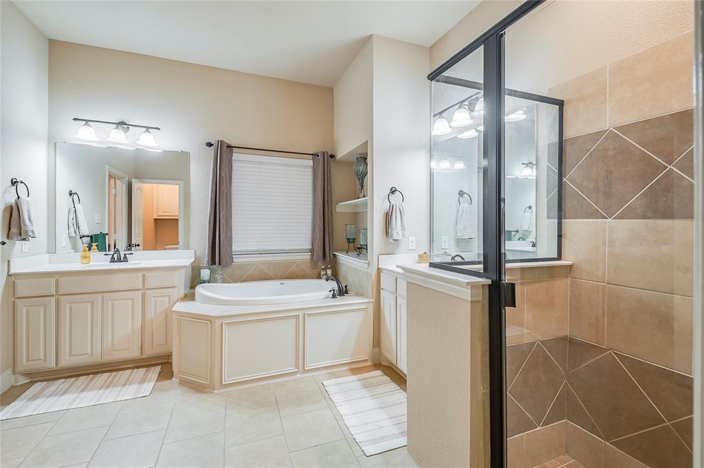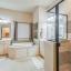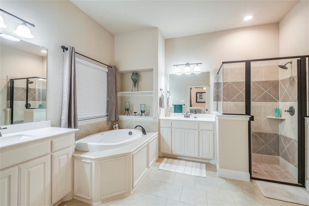 The primary suite offers a relaxing retreat with dual vanities, a soaking tub, and a walk-in shower.