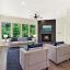 Designed with modern living in mind, the open floor plan features crown molding, decorative lighting, and a striking oversized gas fireplace with a floor-to-ceiling tile surround. The well-appointed kitchen is equipped with a center island, custom cabinetry with ample counter space & storage, premium KitchenAid appliances, granite counters, gas cooktop and a pot filler above the stove, while the adjacent dining area is ideal for casual meals or special gatherings.