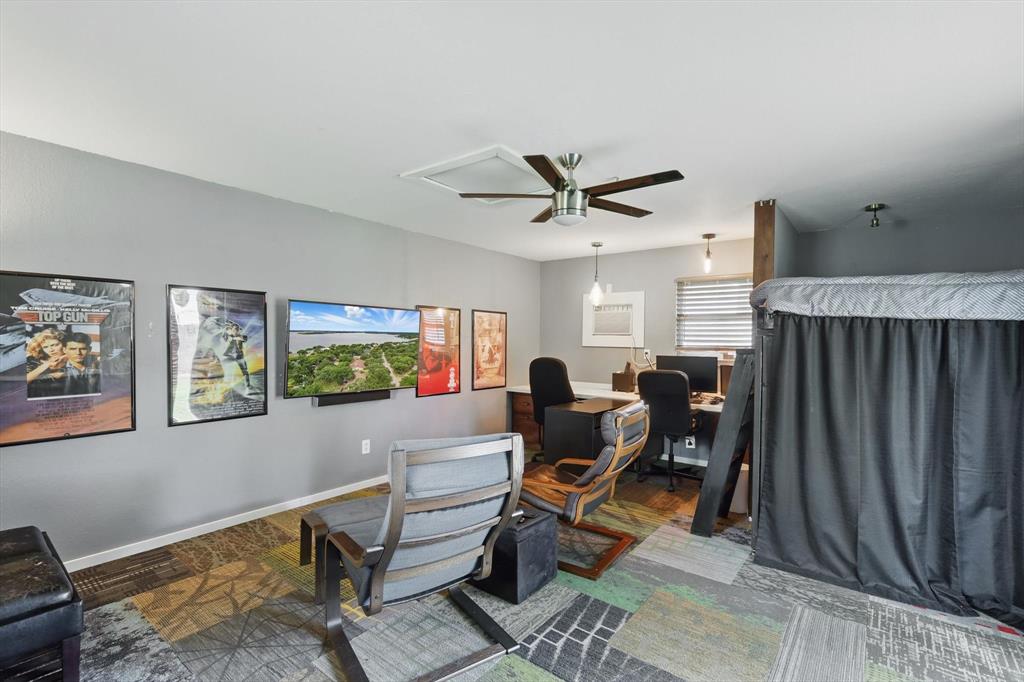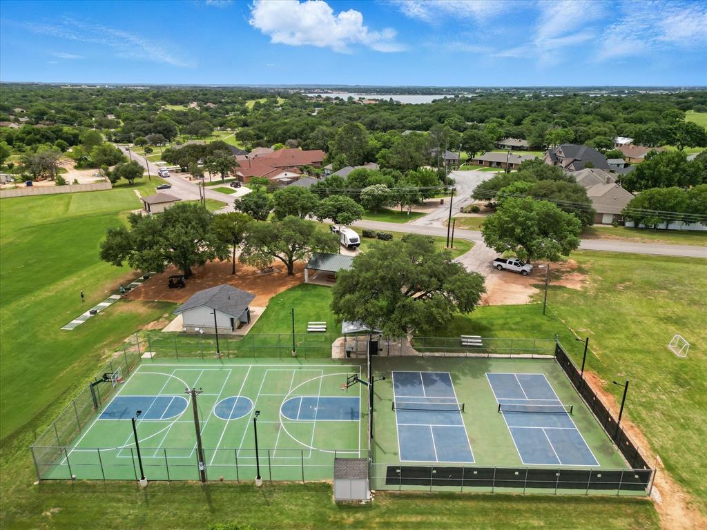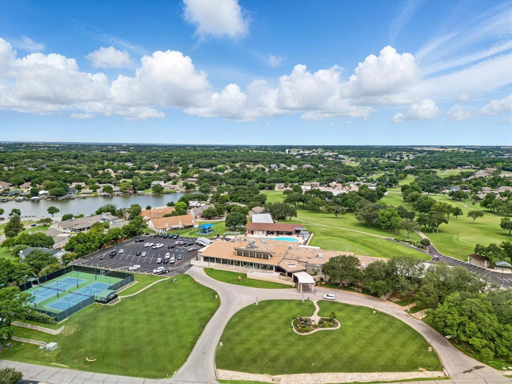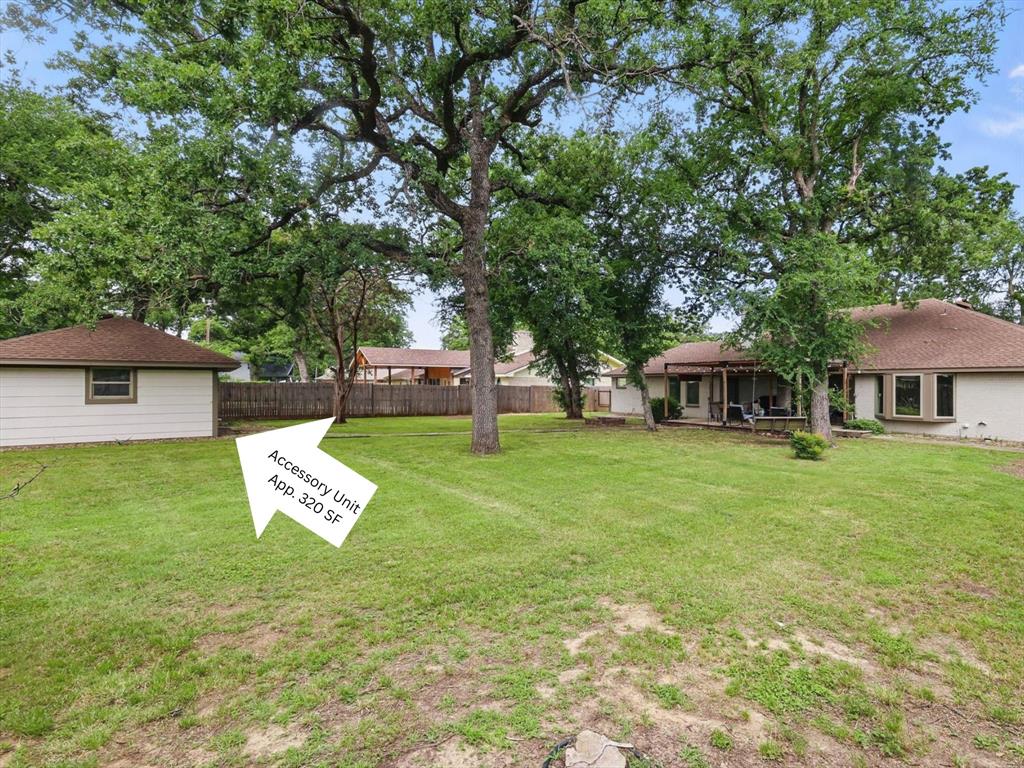 Discover resort-style living located in one of Lake Granbury’s most desirable gated communities. This 3-bedroom, 2-bath home with a detached accessory unit (approx. 320 of additional sq ft) is a flexible bonus space complete with a loft bed, built-in storage, desks, and cabinetry. It includes exterior water access and a dedicated window unit for cooling, perfect as a guest retreat, hangout, home office, or creative studio. Step inside to an open layout where all bedrooms feature spacious walk-in closets. The primary suite offers direct access to the covered back patio, an ideal spot for morning coffee or evening relaxation beneath the shade of mature trees. A luxurious ensuite bath to the primary bedroom includes dual vanities, a separate shower, a jetted garden tub, and two walk-in closets that extend into a shared cedar-lined closet. The heart of the home is a welcoming living area anchored by an electric fireplace and seamlessly connected to the kitchen and dining spaces. Multiple access points from the kitchen, living room, and primary suite lead to the covered back patio. Off the kitchen, a private study provides a quiet workspace. Formerly a half bath, with capped plumbing, offering an easy conversion back if desired. The oversized garage features two full-size parking spaces, plus a third spot for a golf cart, built-in cabinets, and an 8' x 8' flex room that can be reconnected to the HVAC system, great for a workshop, hobby room, or extra office space. The privacy fence has a gate large enough to drive through, allowing the ability to park a trailer. Enjoy all the amenities this lakefront community has to offer, including social clubs, golf, swimming pool, clubhouse, tennis, pickleball, RV parking, playground, marina with boat launch, gated security, and more. Don’t miss your chance to live in this exceptional community. Schedule your private tour today!
