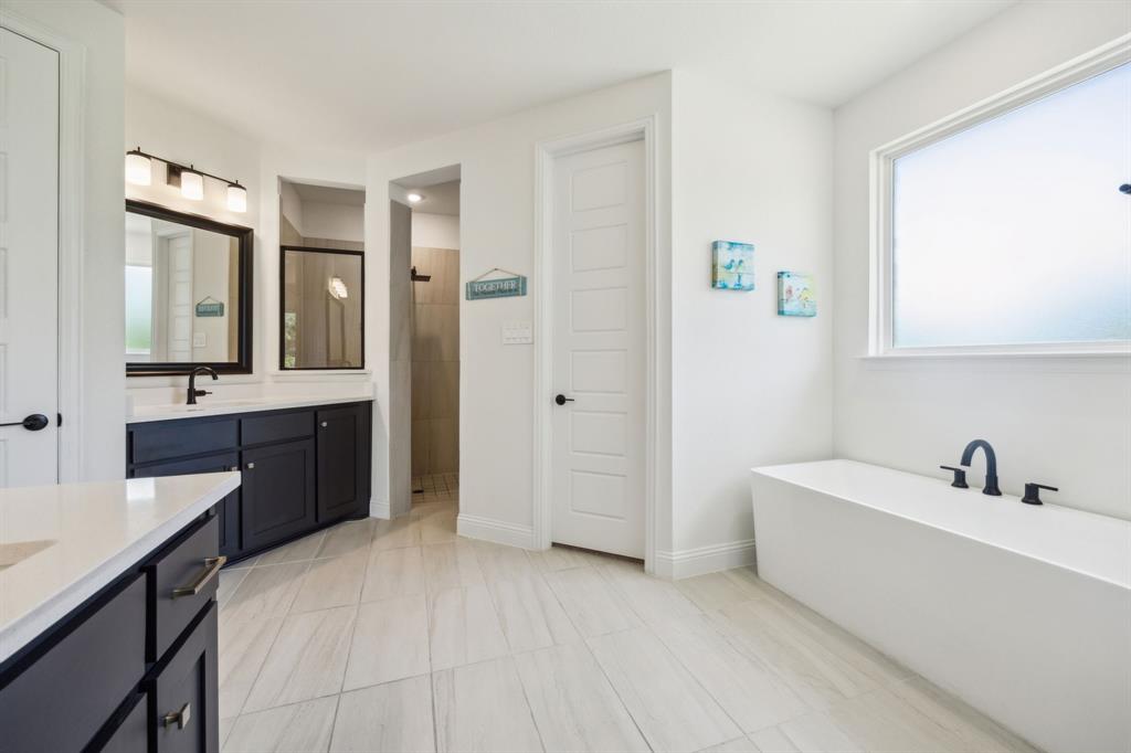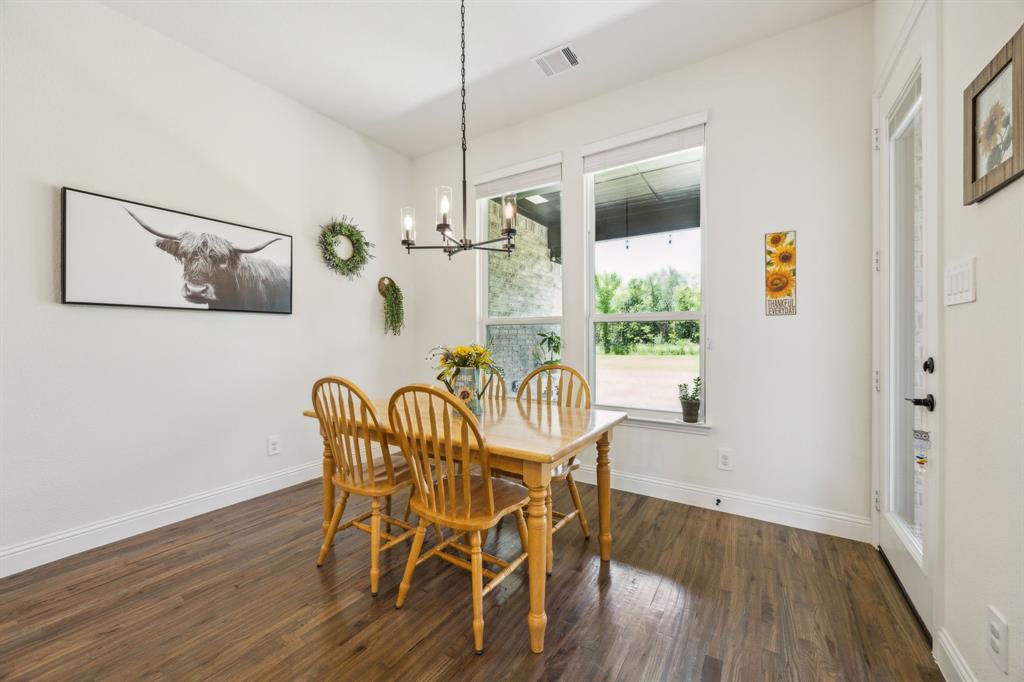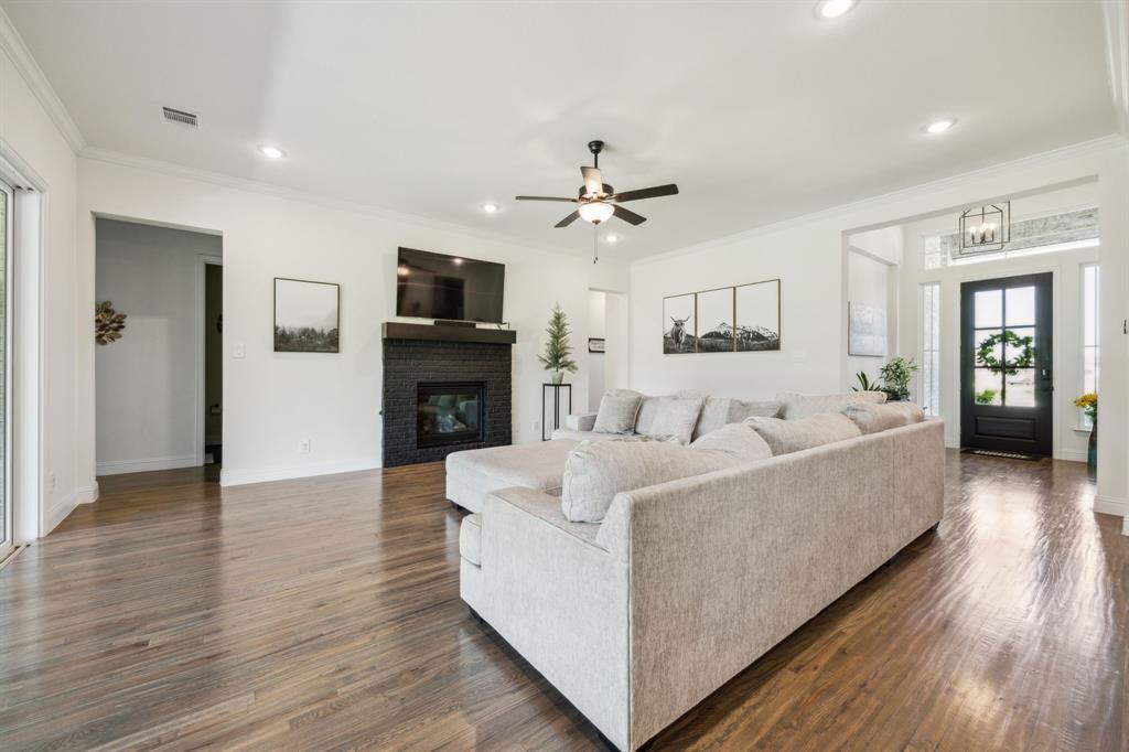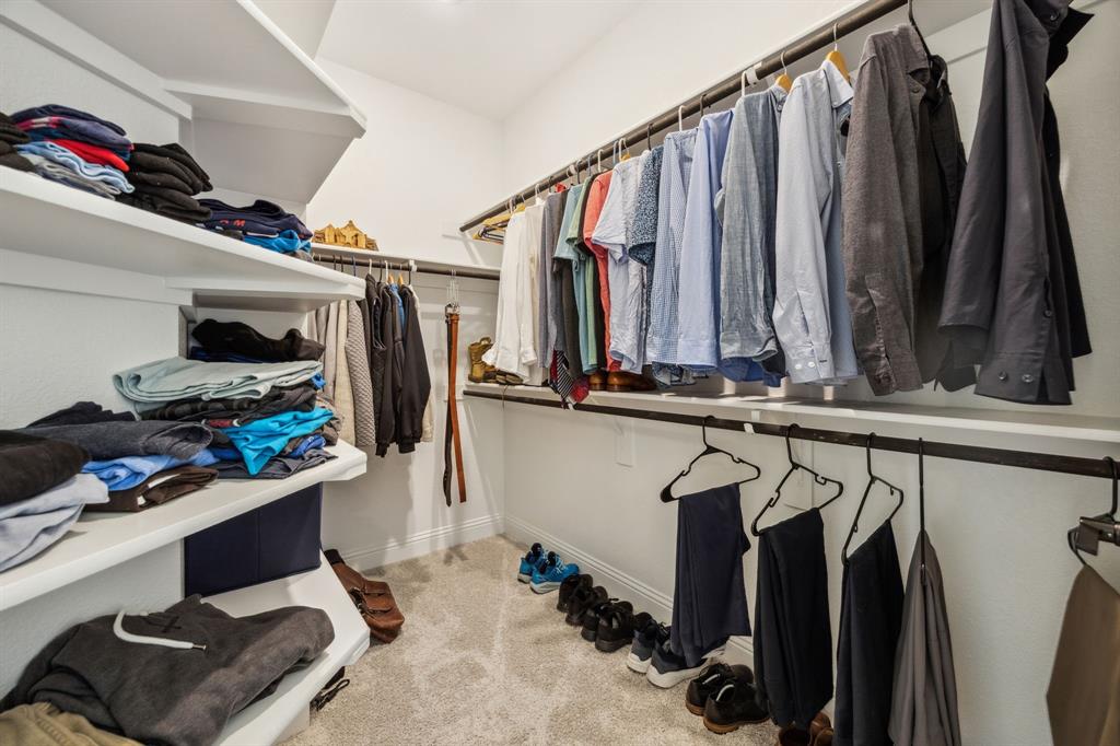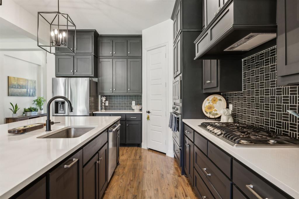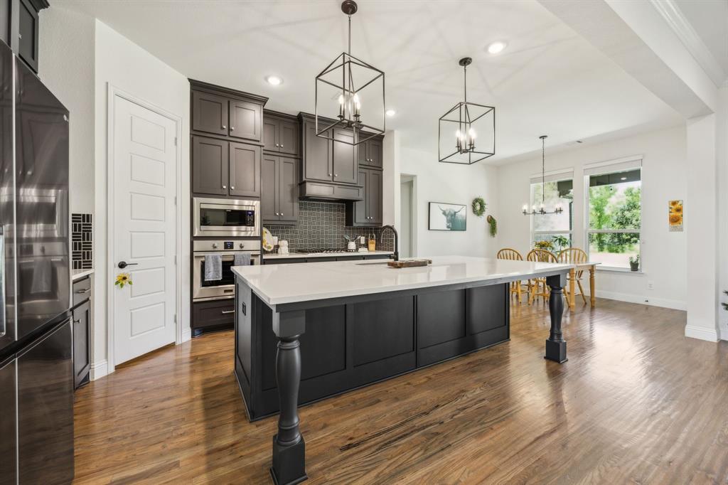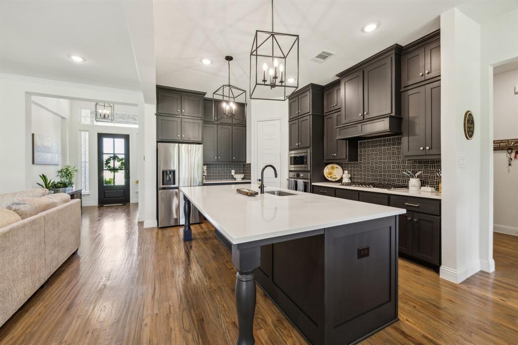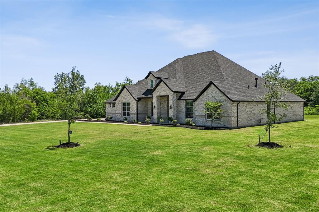Stunning, nearly-new, single-level home anchored on over 1 acre, tucked into a greenbelt! With community trails, lakes, a clubhouse and pool within walking distance, this property is private and expansive, offering quiet living a short drive from Downtown Dallas and area airports. With 5 bedrooms + office, 2.5 bathrooms, and a 3-car-garage, you'll be ready to entertain at the large and elegant kitchen island, or simply enjoy the open floor plan and indoor + outdoor living. As you enter the front door, you're given immediate line-of-sight access through the open concept kitchen, dining, and living areas, through the large windows and sliding glass doors overlooking the covered patio and tree-lined backyard -- where you might catch wildlife enjoying the surrounding greenbelt. The split bedroom layout allows for a large, private primary suite overlooking the backyard, with split vanities, a garden tub, separate shower and two walk-in closets. The other four bedrooms are roomy in size, with plenty of storage and loads of light. Other features include: a cozy fireplace, beautiful hardwoods, walk-in pantry, modern, but classic finishes, new ceiling fans in all bedrooms and on back patio, lush landscaping, and a garage with recently added storage in the closets, on the walls, and in the attic. Don’t miss this rare opportunity to own a private retreat just minutes from all Dallas has to offer!