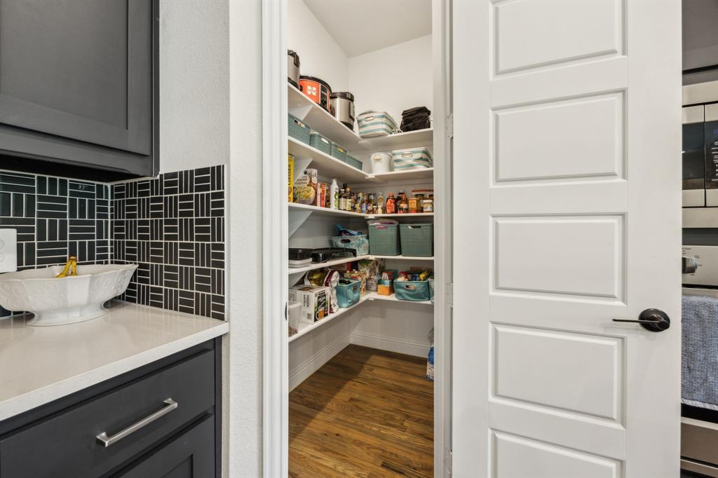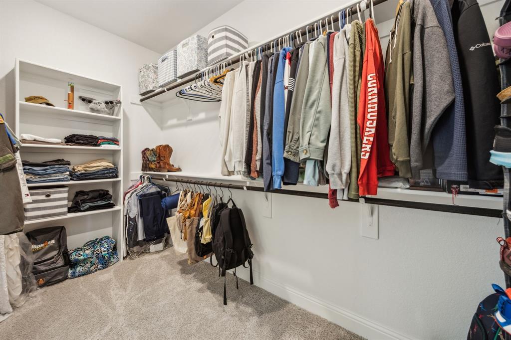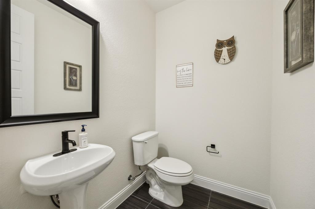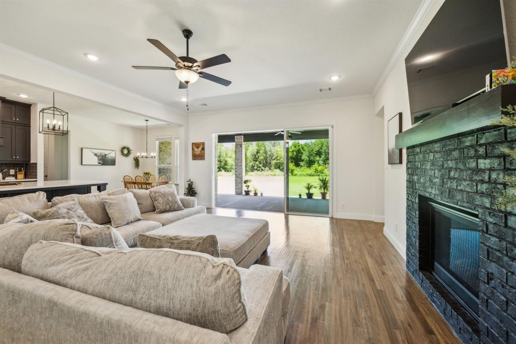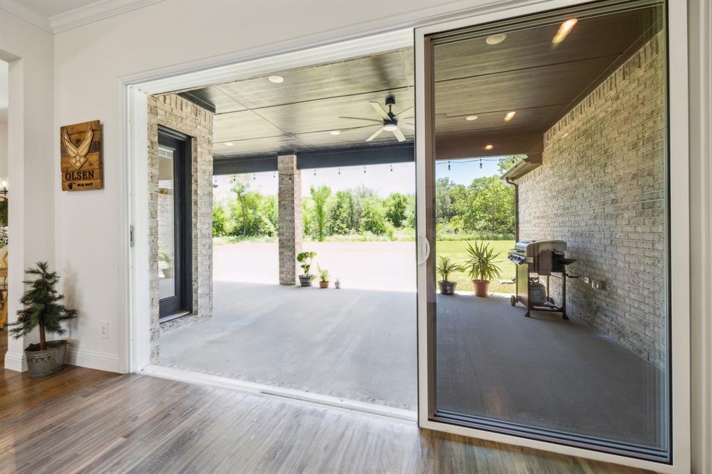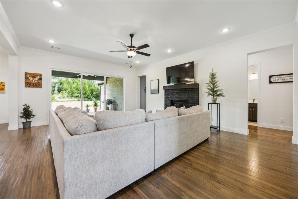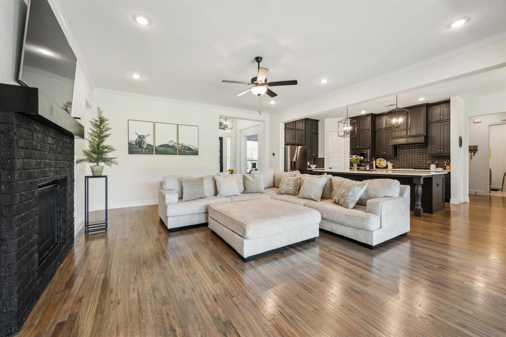 Stunning, nearly-new, single-level home anchored on over 1 acre, tucked into a greenbelt! With community trails, lakes, a clubhouse and pool within walking distance, this property is private and expansive, offering quiet living a short drive from Downtown Dallas and area airports. With 5 bedrooms + office, 2.5 bathrooms, and a 3-car-garage, you'll be ready to entertain at the large and elegant kitchen island, or simply enjoy the open floor plan and indoor + outdoor living. As you enter the front door, you're given immediate line-of-sight access through the open concept kitchen, dining, and living areas, through the large windows and sliding glass doors overlooking the covered patio and tree-lined backyard -- where you might catch wildlife enjoying the surrounding greenbelt. The split bedroom layout allows for a large, private primary suite overlooking the backyard, with split vanities, a garden tub, separate shower and two walk-in closets. The other four bedrooms are roomy in size, with plenty of storage and loads of light. Other features include: a cozy fireplace, beautiful hardwoods, walk-in pantry, modern, but classic finishes, new ceiling fans in all bedrooms and on back patio, lush landscaping, and a garage with recently added storage in the closets, on the walls, and in the attic. Don’t miss this rare opportunity to own a private retreat just minutes from all Dallas has to offer!
