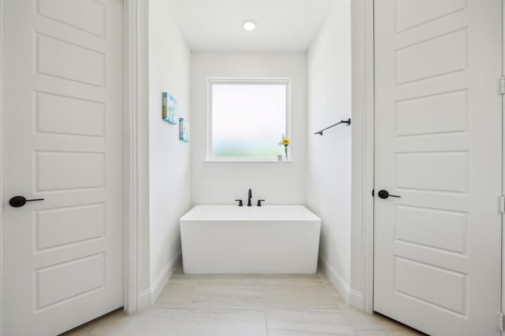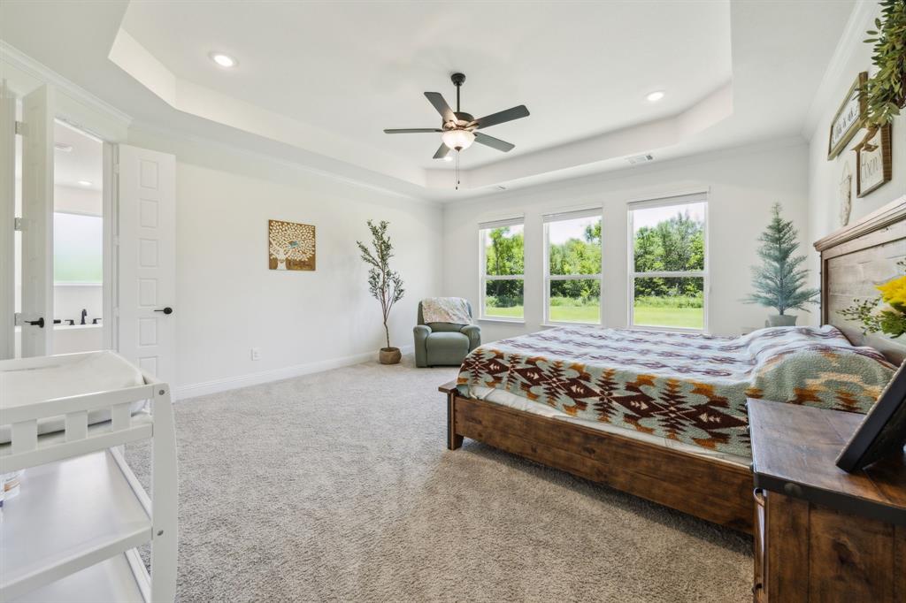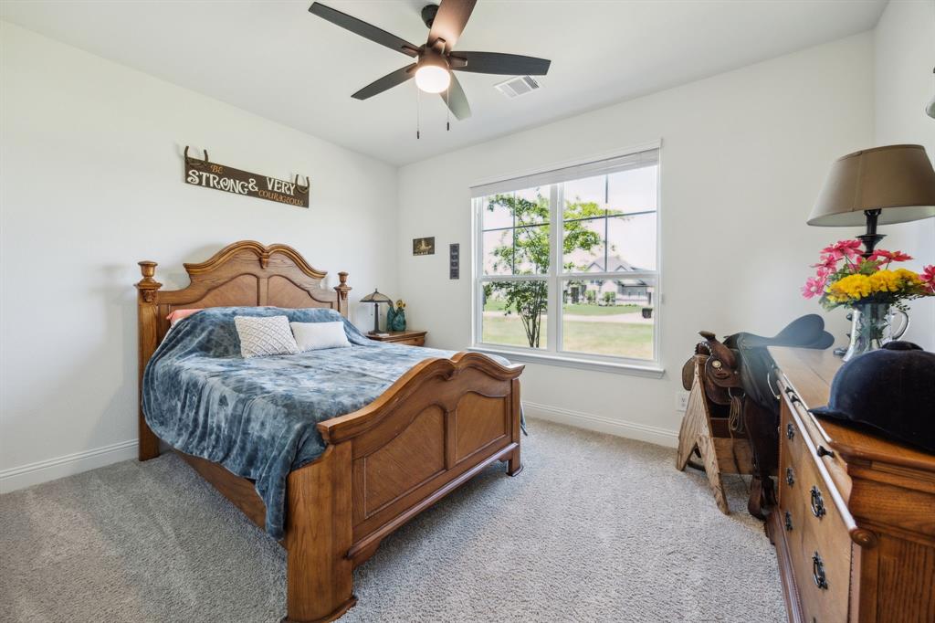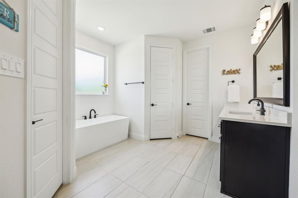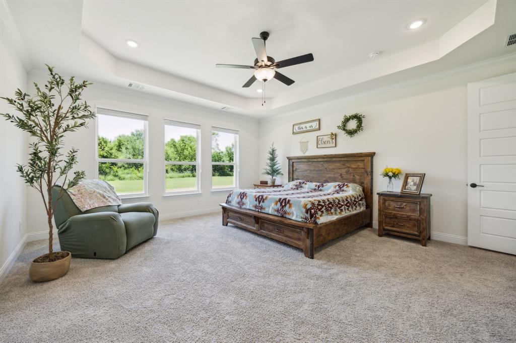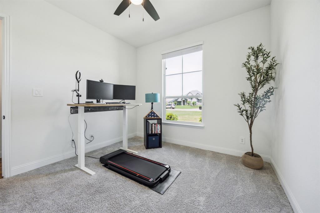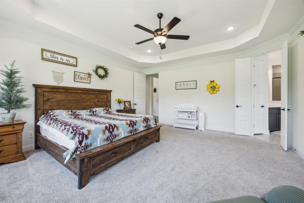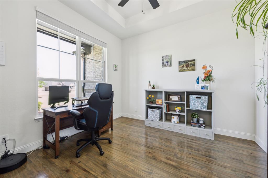 Stunning, nearly-new, single-level home anchored on over 1 acre, tucked into a greenbelt! With community trails, lakes, a clubhouse and pool within walking distance, this property is private and expansive, offering quiet living a short drive from Downtown Dallas and area airports. With 5 bedrooms + office, 2.5 bathrooms, and a 3-car-garage, you'll be ready to entertain at the large and elegant kitchen island, or simply enjoy the open floor plan and indoor + outdoor living. As you enter the front door, you're given immediate line-of-sight access through the open concept kitchen, dining, and living areas, through the large windows and sliding glass doors overlooking the covered patio and tree-lined backyard -- where you might catch wildlife enjoying the surrounding greenbelt. The split bedroom layout allows for a large, private primary suite overlooking the backyard, with split vanities, a garden tub, separate shower and two walk-in closets. The other four bedrooms are roomy in size, with plenty of storage and loads of light. Other features include: a cozy fireplace, beautiful hardwoods, walk-in pantry, modern, but classic finishes, new ceiling fans in all bedrooms and on back patio, lush landscaping, and a garage with recently added storage in the closets, on the walls, and in the attic. Don’t miss this rare opportunity to own a private retreat just minutes from all Dallas has to offer!