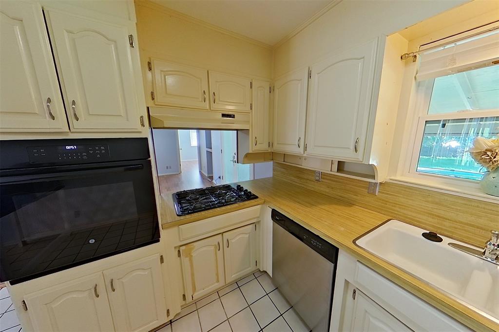 The kitchen overlooks the backyard oasis, giving you panoramic views of mature trees, a sparkling pool, and the expansive covered patio—perfect for morning coffee or evening gatherings. The kitchen has ample cabinetry and counter space, making it a functional hub for daily living.