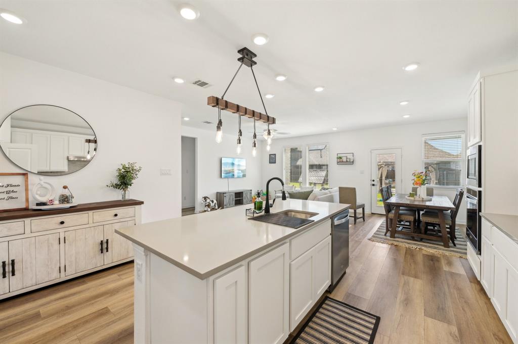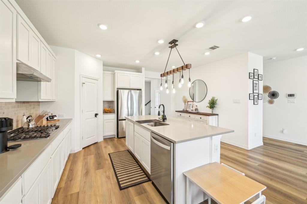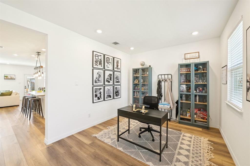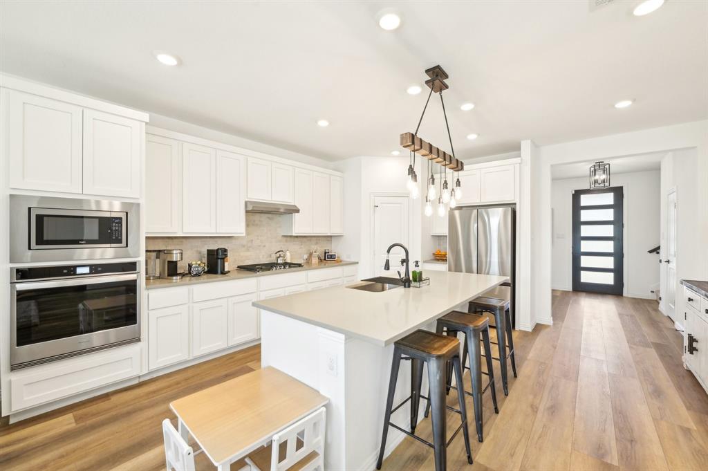The home features a desirable open floor plan. Upon entering, you'll find a dedicated office area and a convenient half-bath for guests. The spacious kitchen flows seamlessly into the living and dining areas, featuring a breakfast bar with a quartz island and a farmhouse sink. The kitchen is well-equipped with stainless steel appliances, including a gas cooktop, vented exhaust fan, electric oven, and microwave. Recessed lighting enhances the entire home.