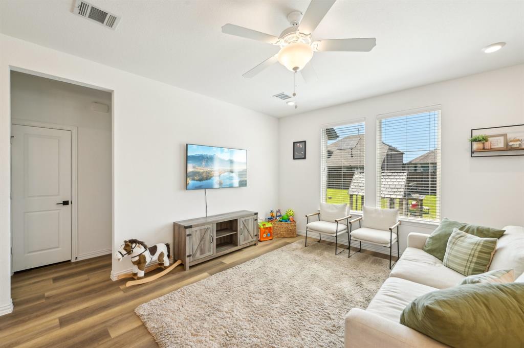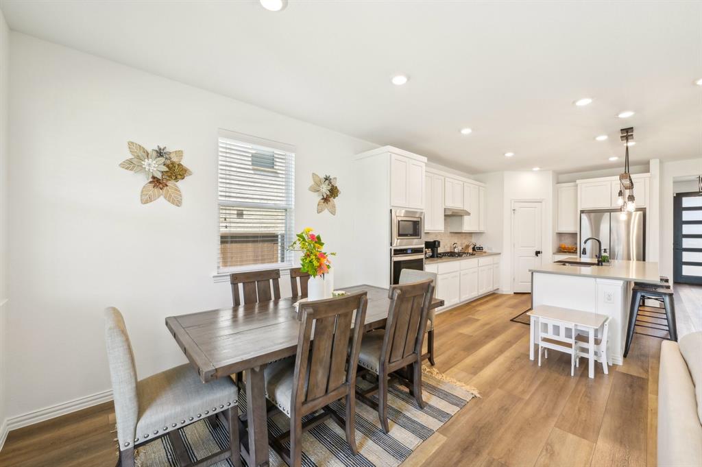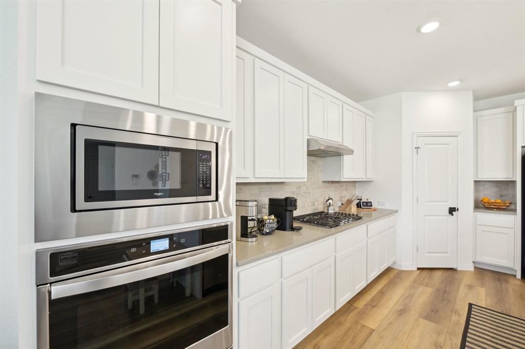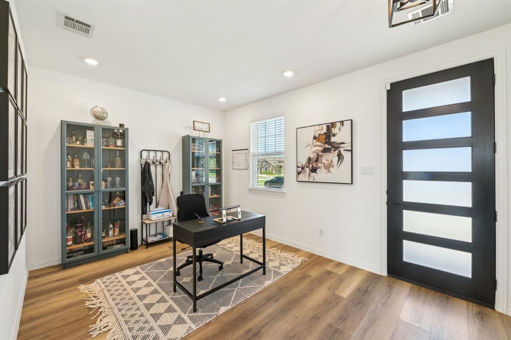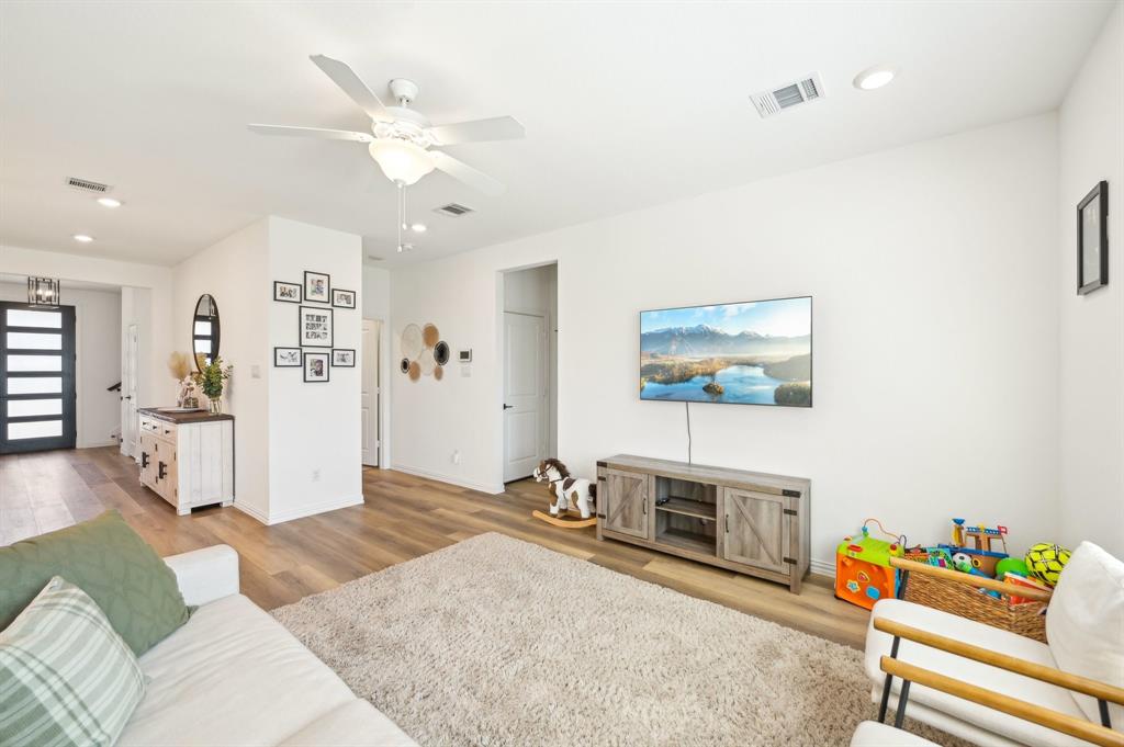The home features a desirable open floor plan. Upon entering, you'll find a dedicated office area and a convenient half-bath for guests. The spacious kitchen flows seamlessly into the living and dining areas, featuring a breakfast bar with a quartz island and a farmhouse sink. The kitchen is well-equipped with stainless steel appliances, including a gas cooktop, vented exhaust fan, electric oven, and microwave. Recessed lighting enhances the entire home.