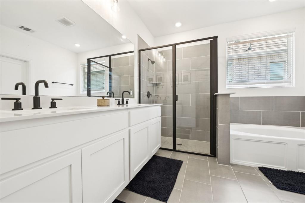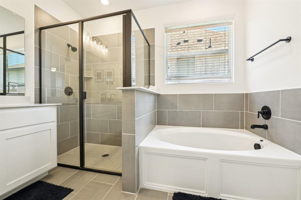 The primary bedroom is conveniently located on the main floor and includes a ceiling fan, a large walk-in closet, a soaking tub, double sinks, and a tiled walk-in shower. Upstairs, you'll find a large family or game room with a generously sized window that fills the space with natural light. The secondary bedrooms, each with walk-in closets, and an additional bathroom are also located upstairs.