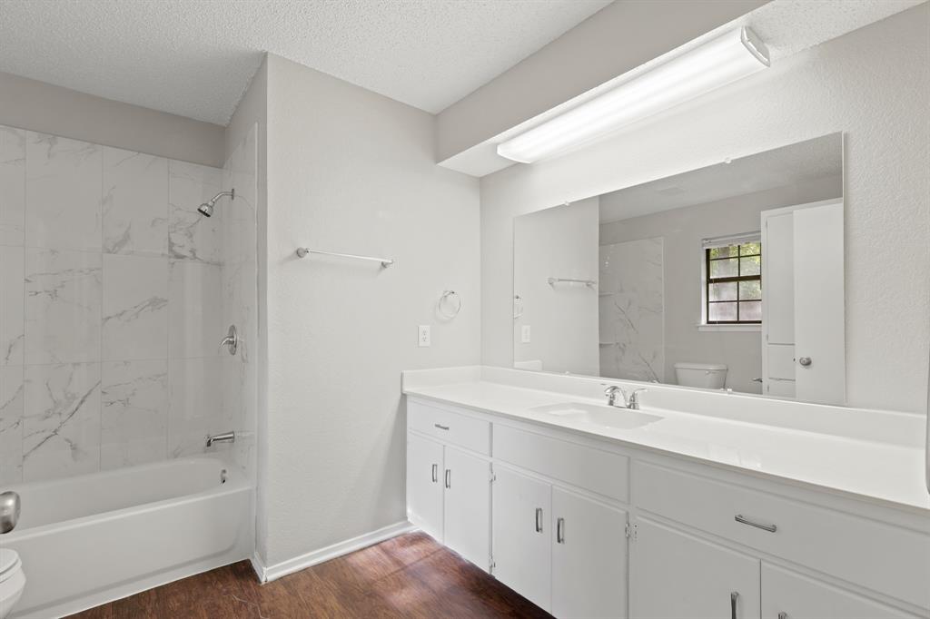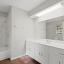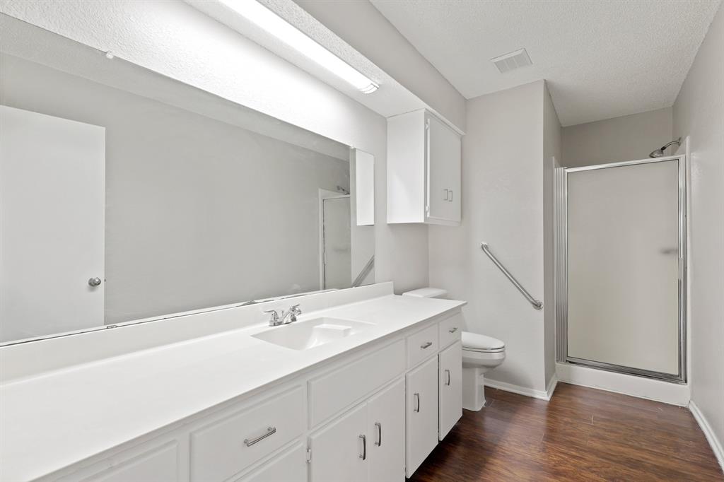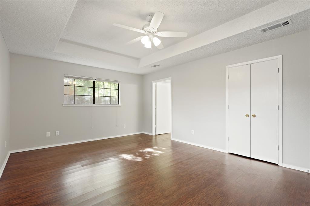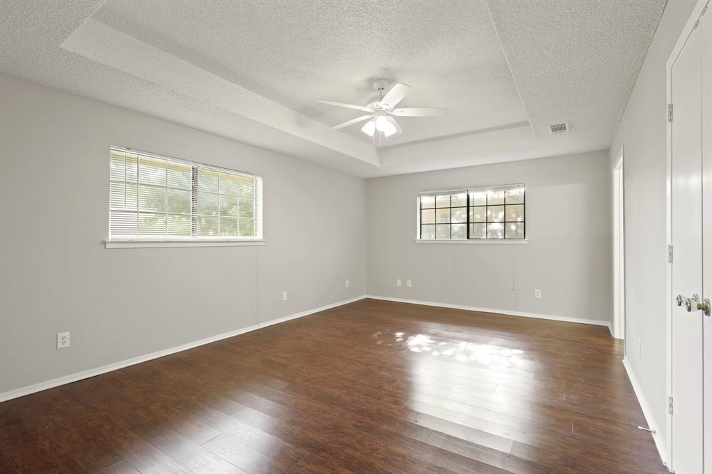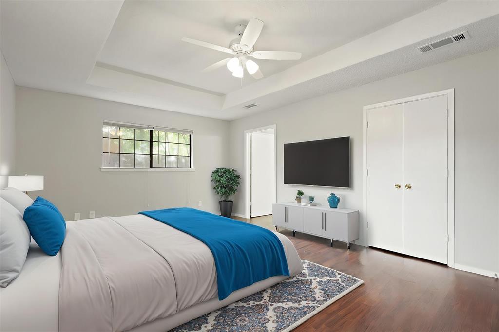 The primary bedroom suite is a true retreat, featuring a tray ceiling, ceiling fan, and a spacious layout. The en-suite bathroom includes a step-in shower, generous counter space, and abundant cabinetry for linens and toiletries.