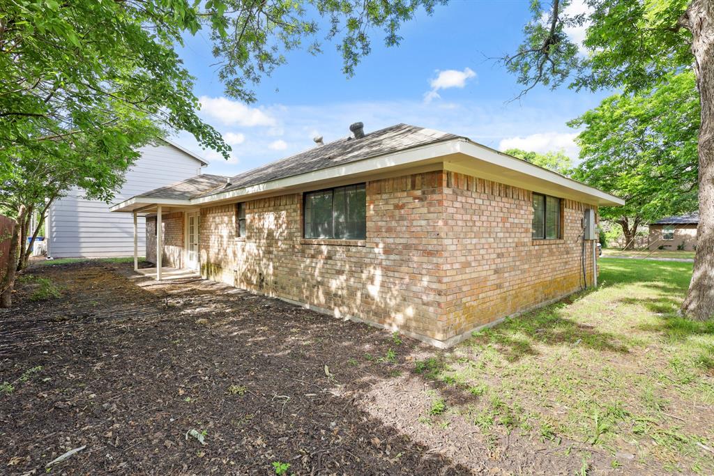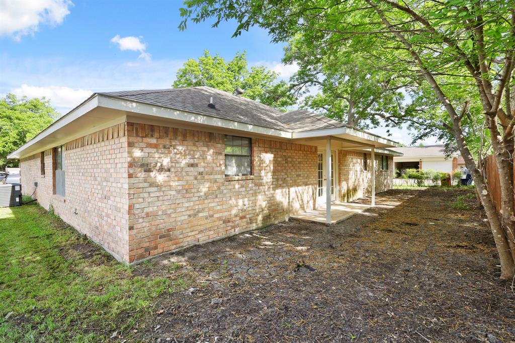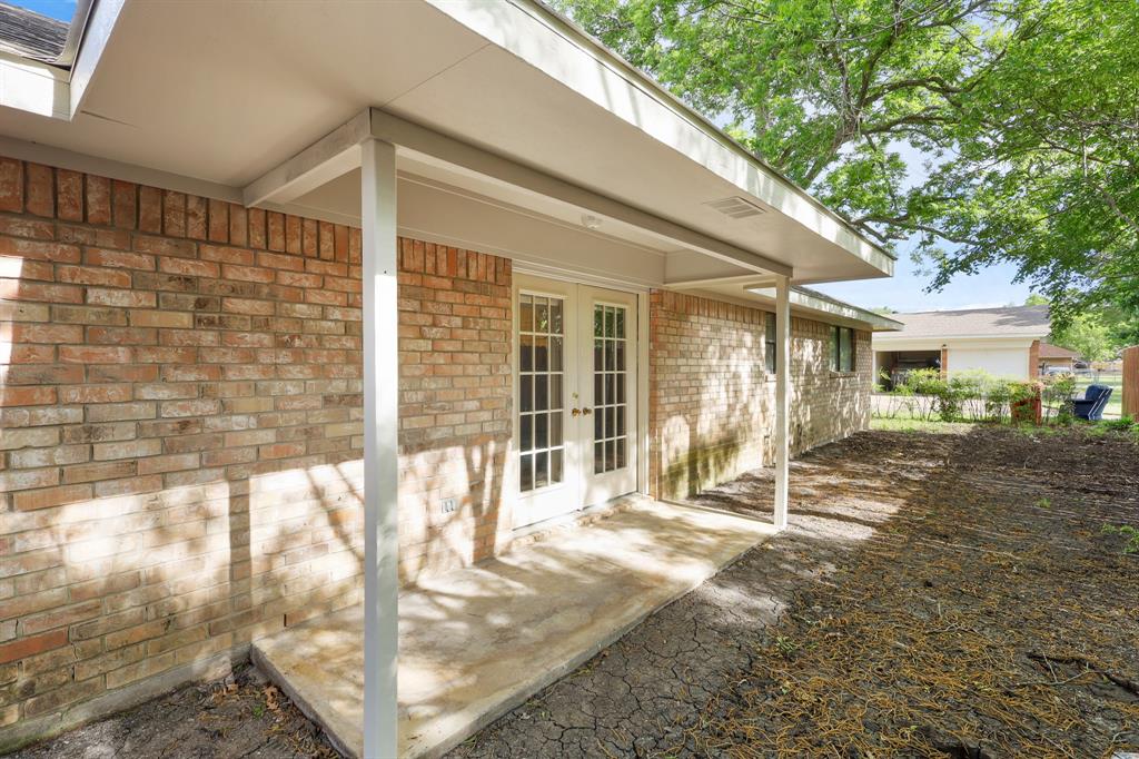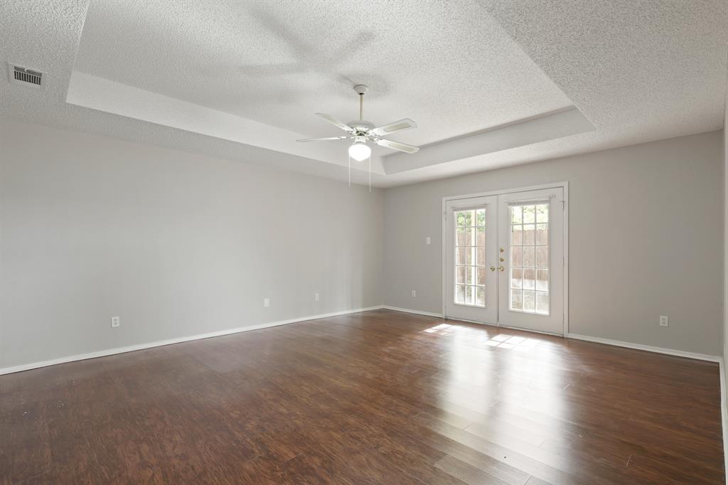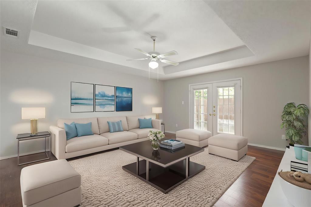 The gorgeous living room is a standout with its tray ceiling, ceiling fan, and elegant French doors that open to a covered back patio—perfect for relaxing or hosting guests. The backyard provides ample space for a garden, play area, or future patio expansion, all surrounded by mature shade trees for privacy and tranquility.