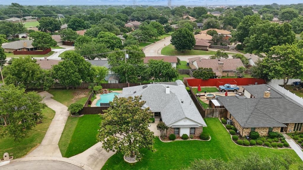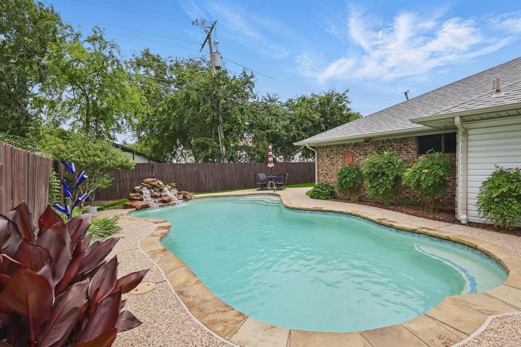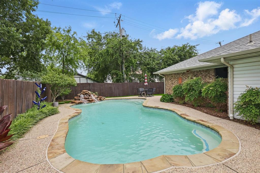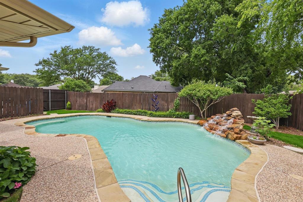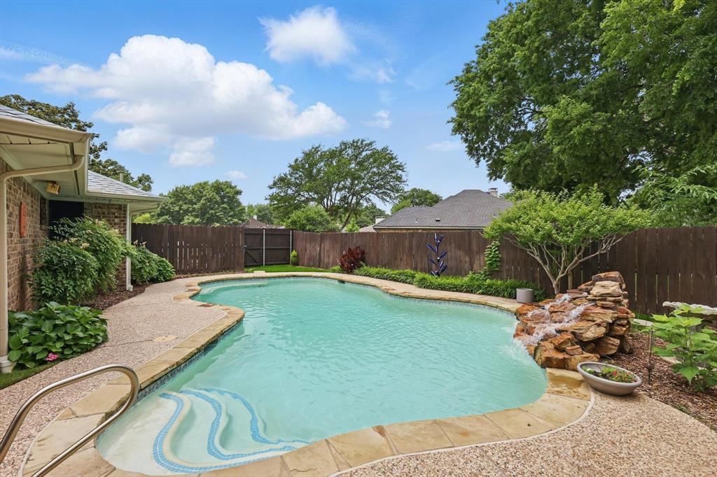 Meticulously maintained one story home in the sought after school district of Marcus High School. This home has 3 bedrooms with a den that can be a 4th bedroom since it has a closet and ensuite half bathroom. The formal dining room is great for entertaining and has access to the kitchen. The Breakfast Room located in the kitchen which has an abundance of cabinets, gas cook top, electric range and dishwasher. The living room has a cozy brick fireplace and a mirrored wet bar. The Primary Suite boasts a bay window, sitting area and a walk in 12 X 9 closet with a sky light. The primary bathroom has an additional closet, dual sinks, separate vanities, walk in shower and linen closet. After a long day, unwind on the covered patio and enjoy the pristine swimming pool with a relaxing waterfall and lush landscaping. Make this your next home sweet home!