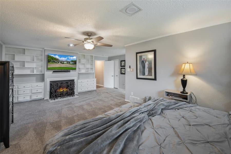 The luxurious primary suite is a private retreat, complete with fireplace, dual vanities, soaking tub, two walk-in closets, and custom built-ins. Throughout the home, thoughtful details like glass-front cabinetry, intricate woodwork, and walls of windows bring timeless charm and abundant natural light.