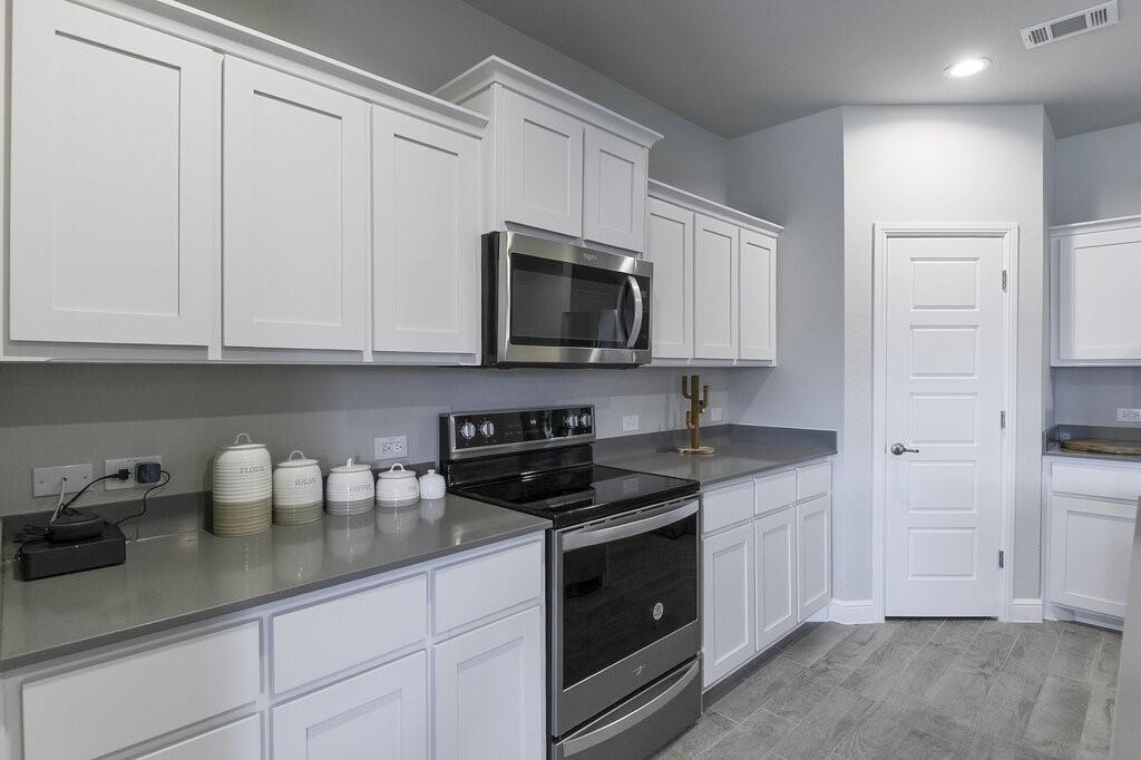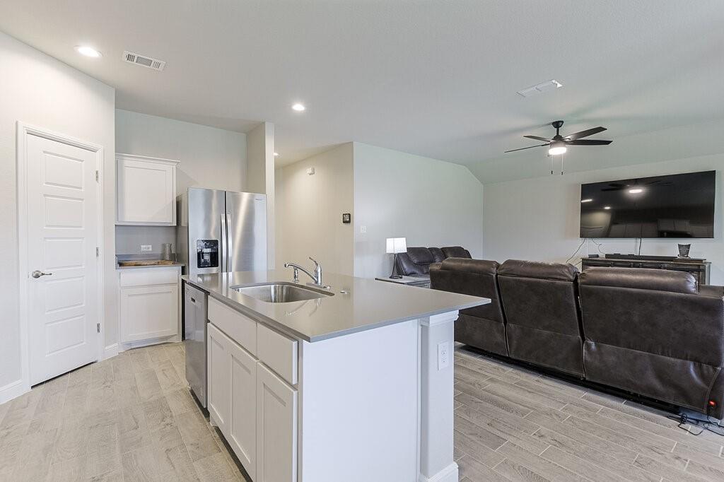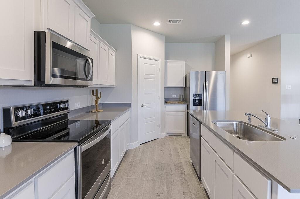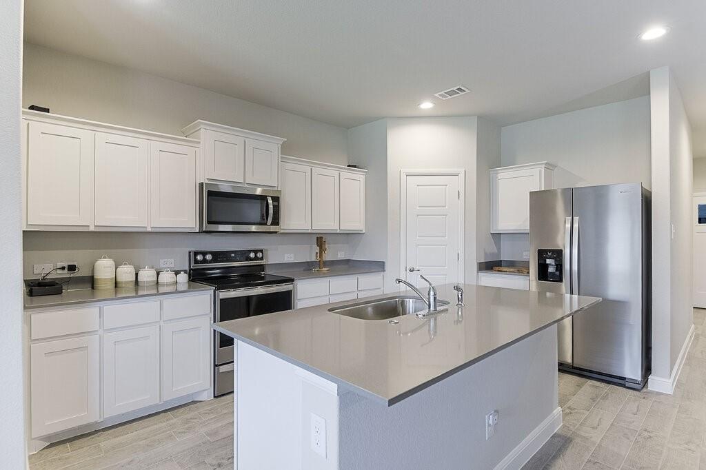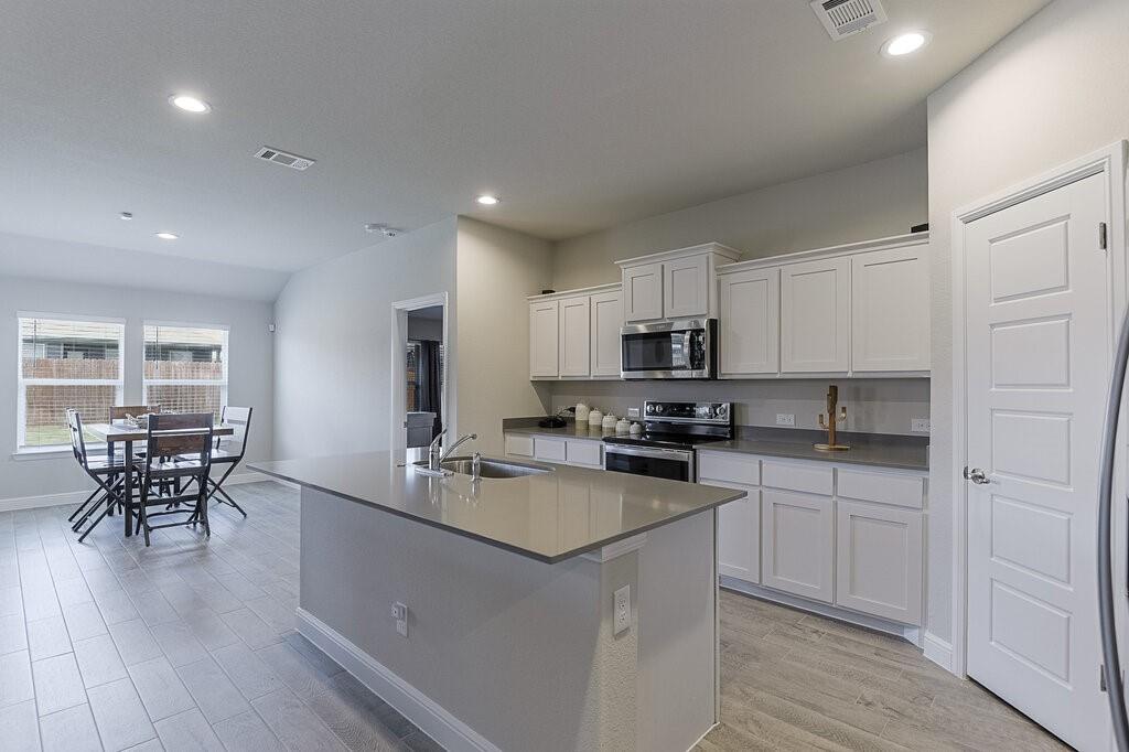 From the moment you step inside, you’re greeted by high ceilings, abundant natural light, and stylish finishes throughout. The heart of the home is the gourmet kitchen, featuring quartz countertops, stainless steel appliances, a walk-in pantry, and a large center island that overlooks the bright living and dining areas — ideal for both daily living and entertaining guests.