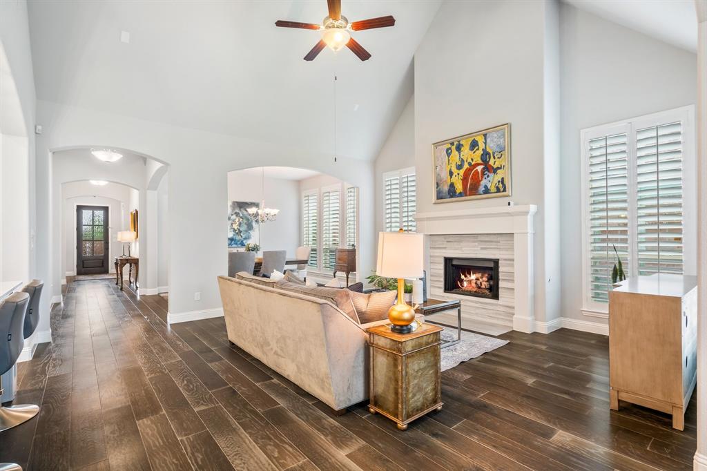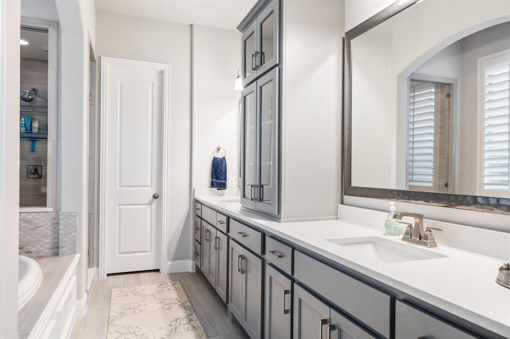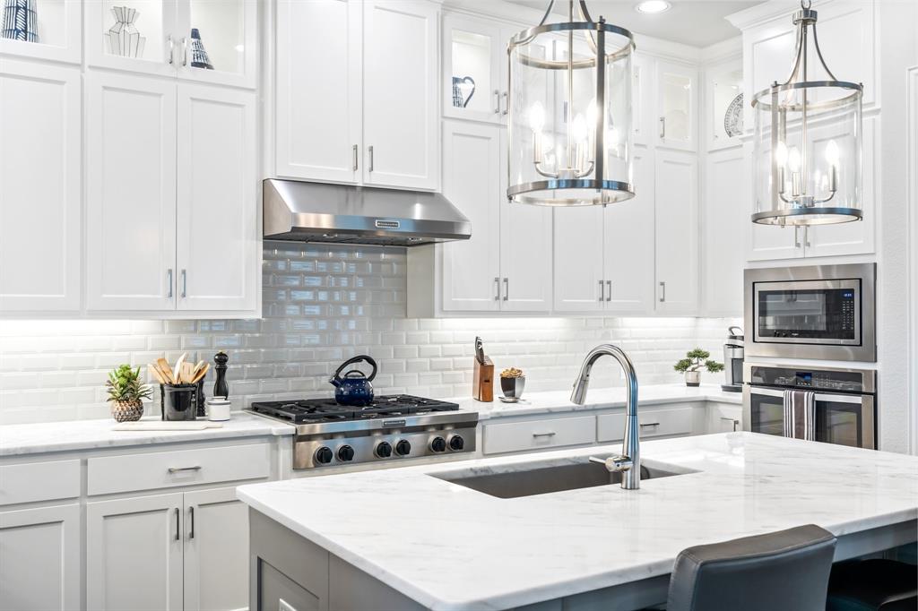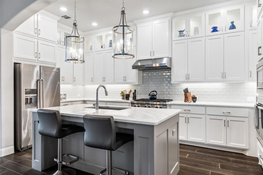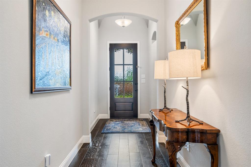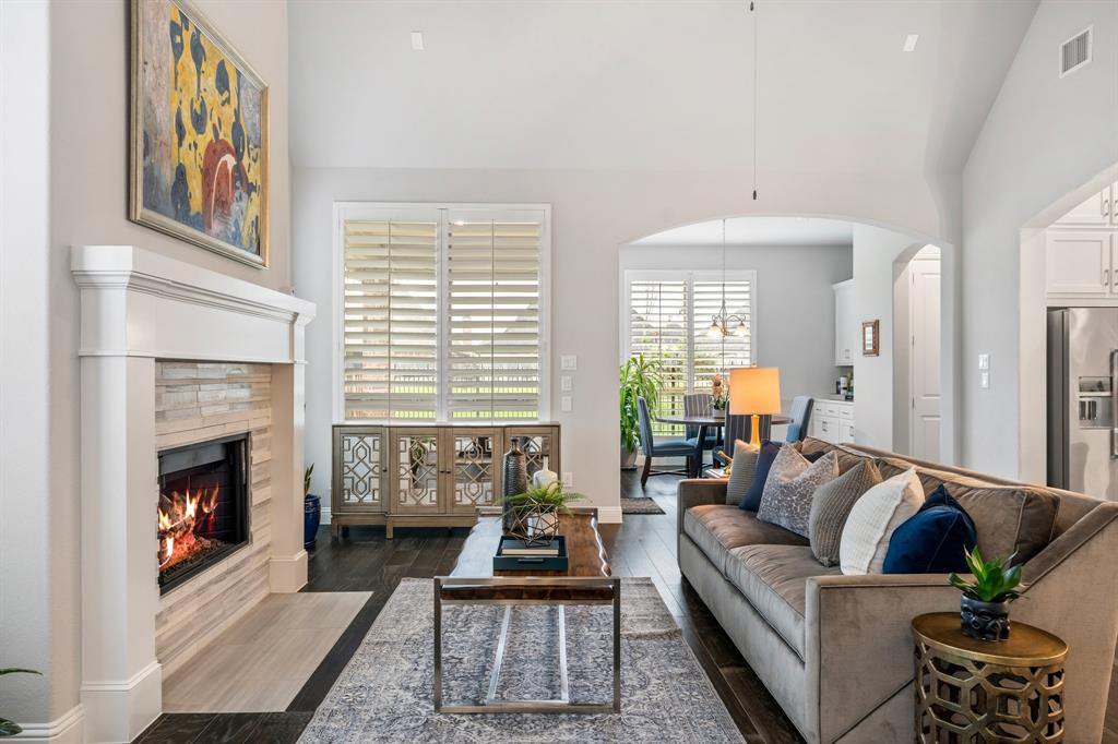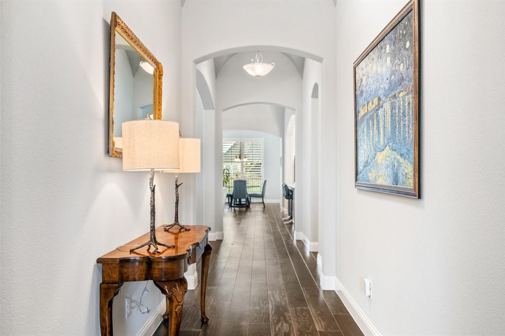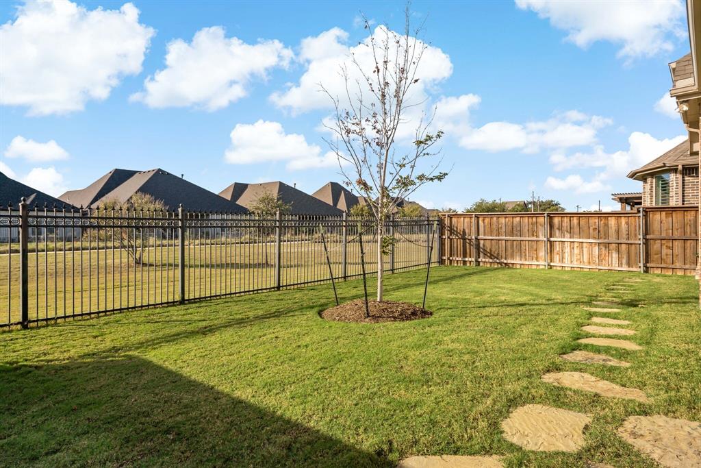 Discover this elegantly crafted single-story home nestled in The Tribute, a premier lakeside community near Lake Lewisville. Built by American Legend in 2018, this residence offers three bedrooms and 2.5 baths, seamlessly merging modern comfort with stylish design. Highlighted by an open floor plan, the home boasts high ceilings, plentiful natural light, and a gourmet kitchen complete with stainless steel appliances, generous cabinetry, and expansive countertops, perfect for hosting gatherings. The kitchen flows effortlessly into the spacious family and dining areas, while the tranquil backyard features a covered patio and peaceful greenbelt views. The primary suite presents an ensuite bath with dual vanities, a soaking tub, a walk-in shower, and an expansive closet. Two additional bedrooms share a full bath, complemented by an office, a half-bath, and a two-car garage. The Tribute community enriches the living experience with resort-style pools, premier golf courses, and scenic trails, and is conveniently zoned to Prestwick STEM Academy and Strike Middle School. Enjoy luxury living in this vibrant, amenity-filled neighborhood.