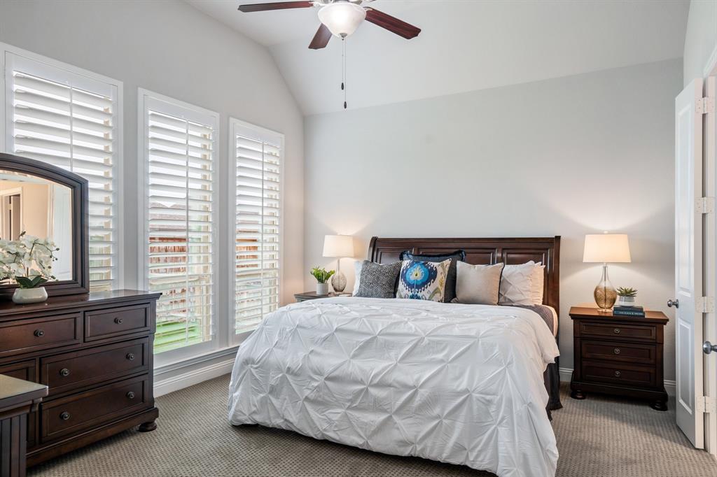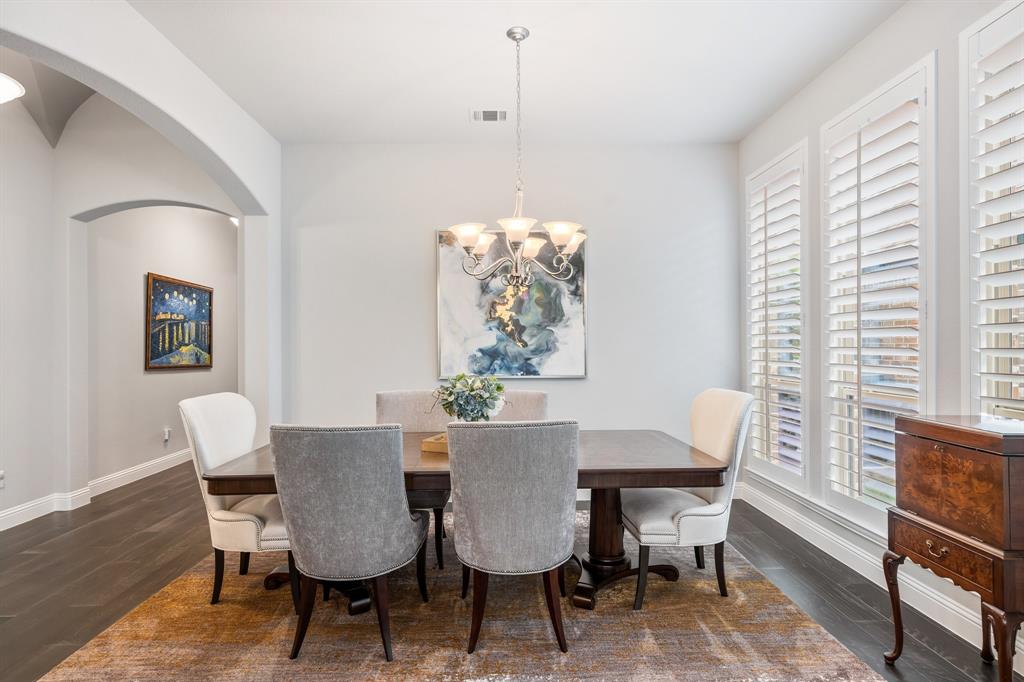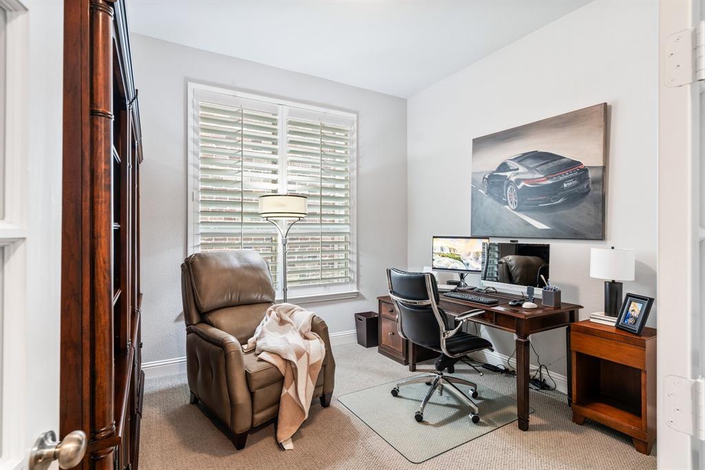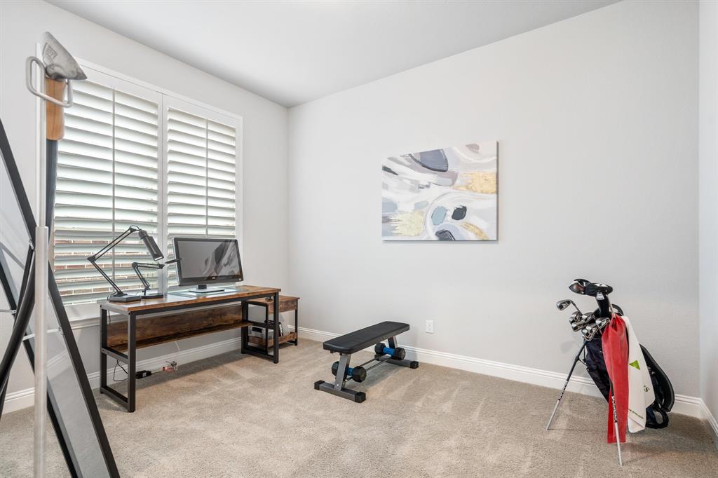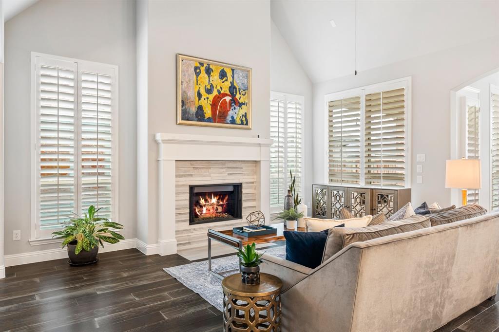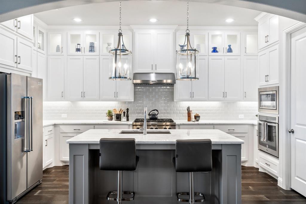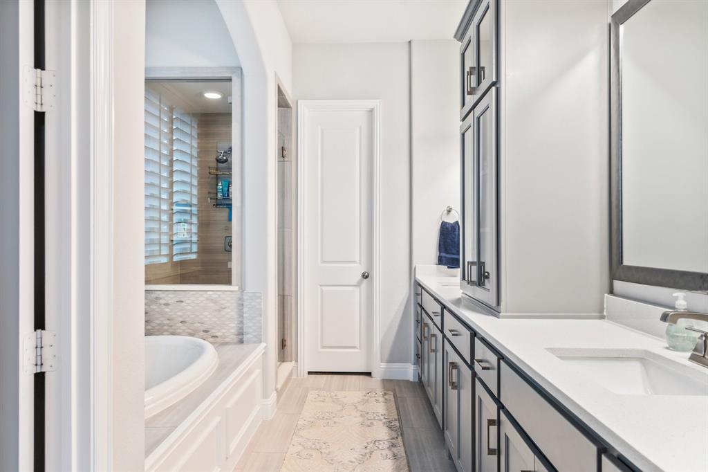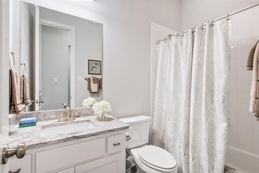 Discover this elegantly crafted single-story home nestled in The Tribute, a premier lakeside community near Lake Lewisville. Built by American Legend in 2018, this residence offers three bedrooms and 2.5 baths, seamlessly merging modern comfort with stylish design. Highlighted by an open floor plan, the home boasts high ceilings, plentiful natural light, and a gourmet kitchen complete with stainless steel appliances, generous cabinetry, and expansive countertops, perfect for hosting gatherings. The kitchen flows effortlessly into the spacious family and dining areas, while the tranquil backyard features a covered patio and peaceful greenbelt views. The primary suite presents an ensuite bath with dual vanities, a soaking tub, a walk-in shower, and an expansive closet. Two additional bedrooms share a full bath, complemented by an office, a half-bath, and a two-car garage. The Tribute community enriches the living experience with resort-style pools, premier golf courses, and scenic trails, and is conveniently zoned to Prestwick STEM Academy and Strike Middle School. Enjoy luxury living in this vibrant, amenity-filled neighborhood.