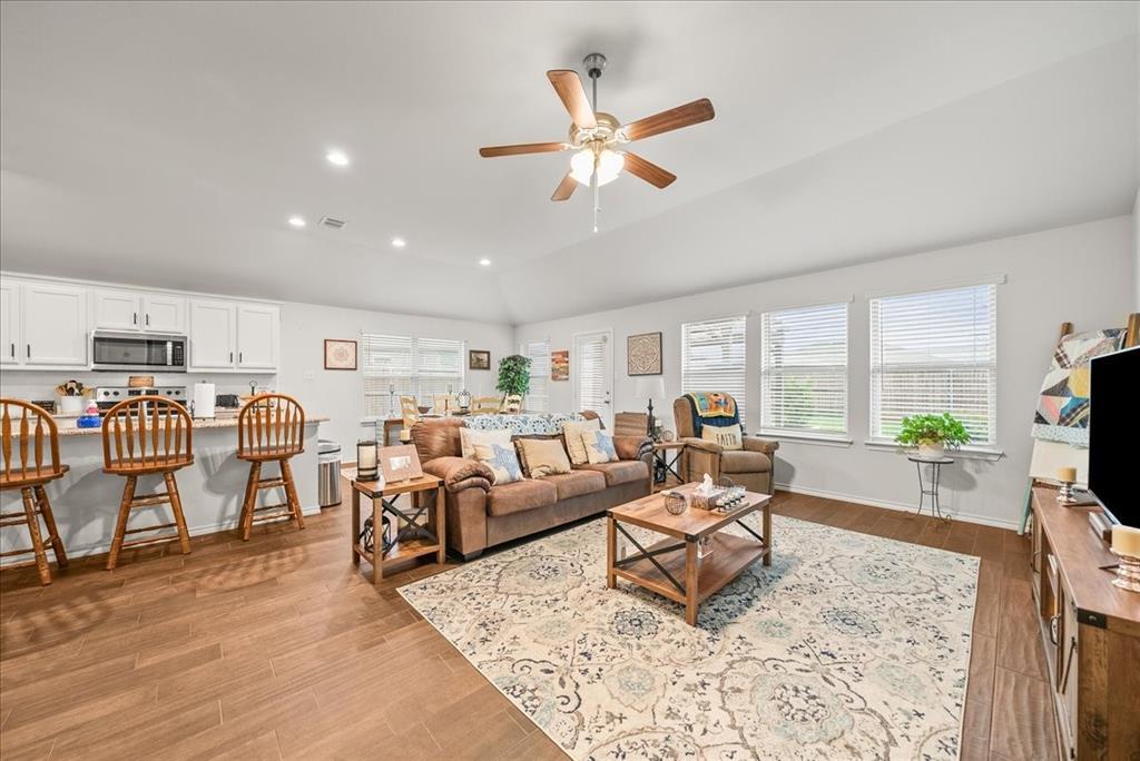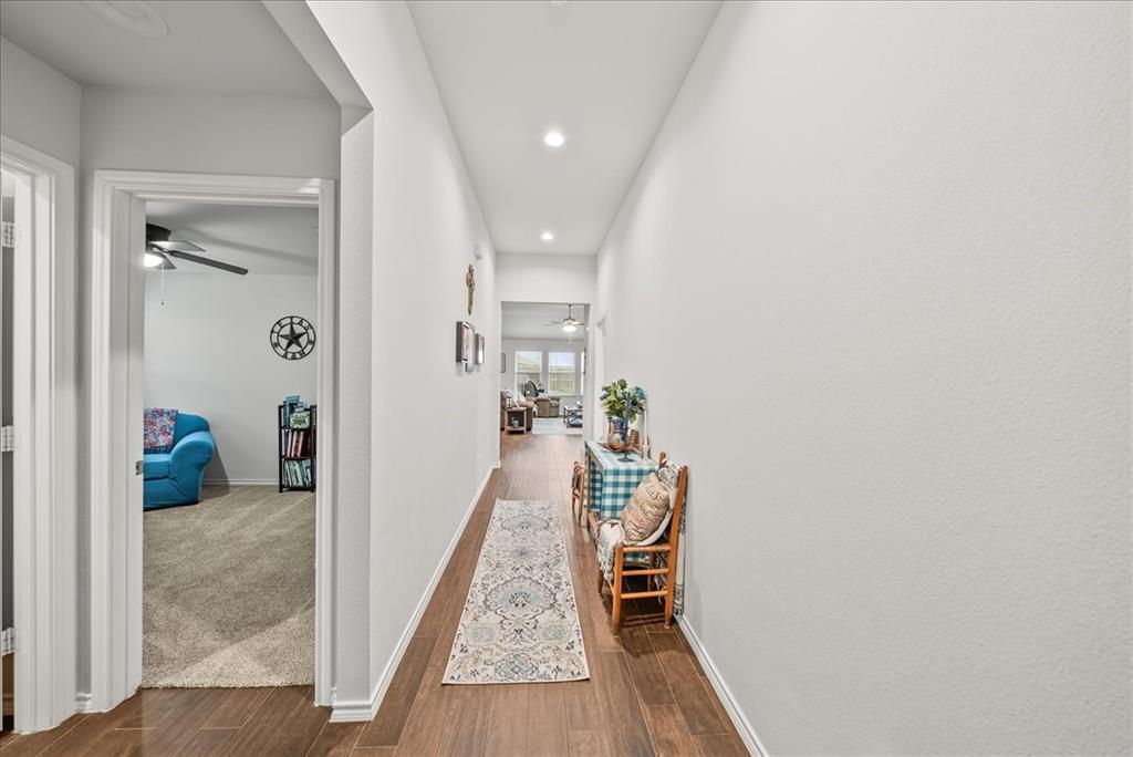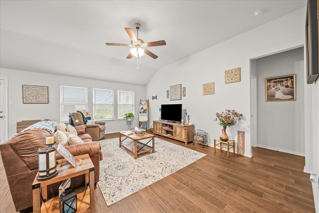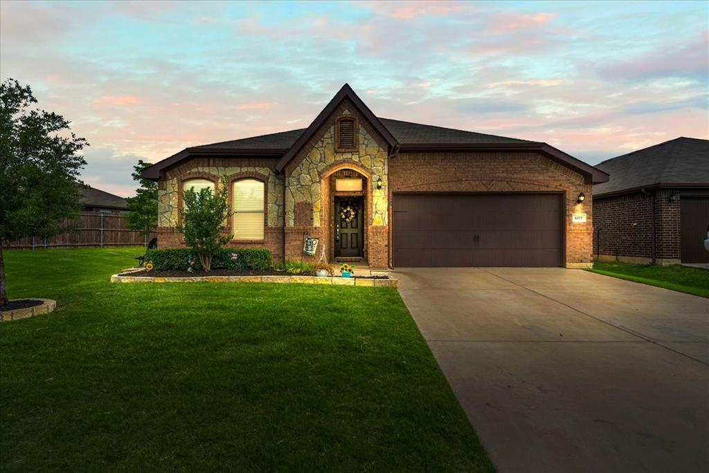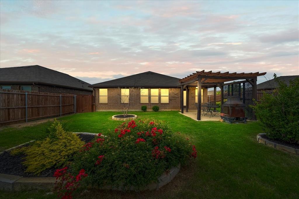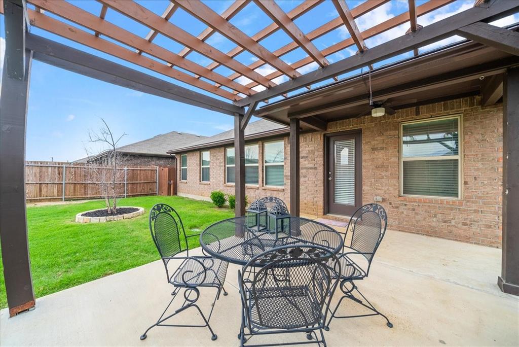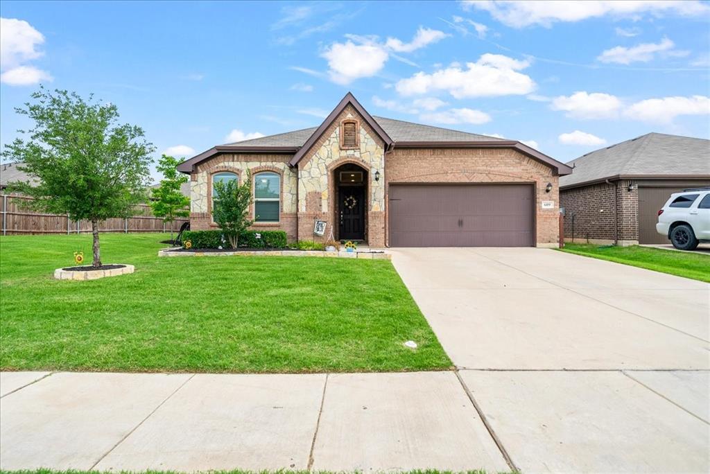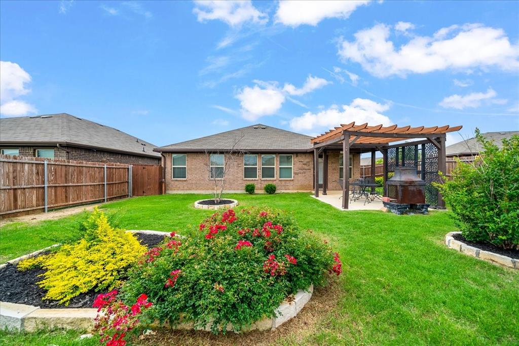 Welcome to this beautifully maintained 3-bedroom, 2-bath home in the desirable Buddy Hardeman subdivision of Justin, TX. Built in 2020, this 1,632 sq ft residence seamlessly blends modern finishes with inviting charm, all nestled on a well-manicured 0.18-acre lot. From the moment you arrive, you'll notice the home's lovely curb appeal featuring a blend of brick and stone façade, lush green lawn, and tasteful landscaping. Inside, an extended entry hall welcomes you with wood-look tile flooring and opens into a bright, spacious living area ideal for relaxing or entertaining. The heart of the home is the chef-inspired kitchen boasting granite countertops, a stylish tile backsplash, white cabinetry, stainless steel appliances, and an oversized island with bar seating—perfect for gatherings and everyday living. The private primary suite offers a peaceful retreat with a dual-sink vanity, a soaking tub, separate shower, and generous closet space. Two additional bedrooms and a full bath provide ample room for guests, family, or a home office. Step outside to your backyard oasis where a covered patio with pergola invites alfresco dining, and the beautifully landscaped yard offers room to play, garden, or unwind under the Texas sky. Additional highlights include a two-car garage, neutral paint tones throughout, ceiling fans, and a thoughtfully designed open floor plan that maximizes space and natural light. This charming home offers the perfect blend of comfort, style, and location—just minutes from local schools, parks, and commuter routes. Don’t miss your chance to make it yours!