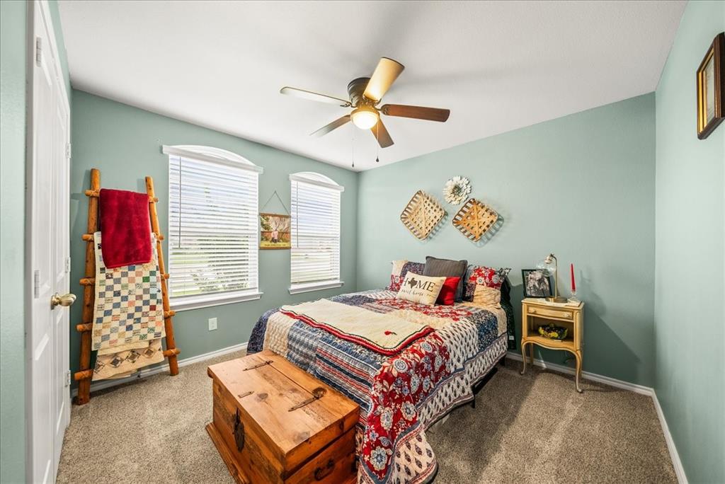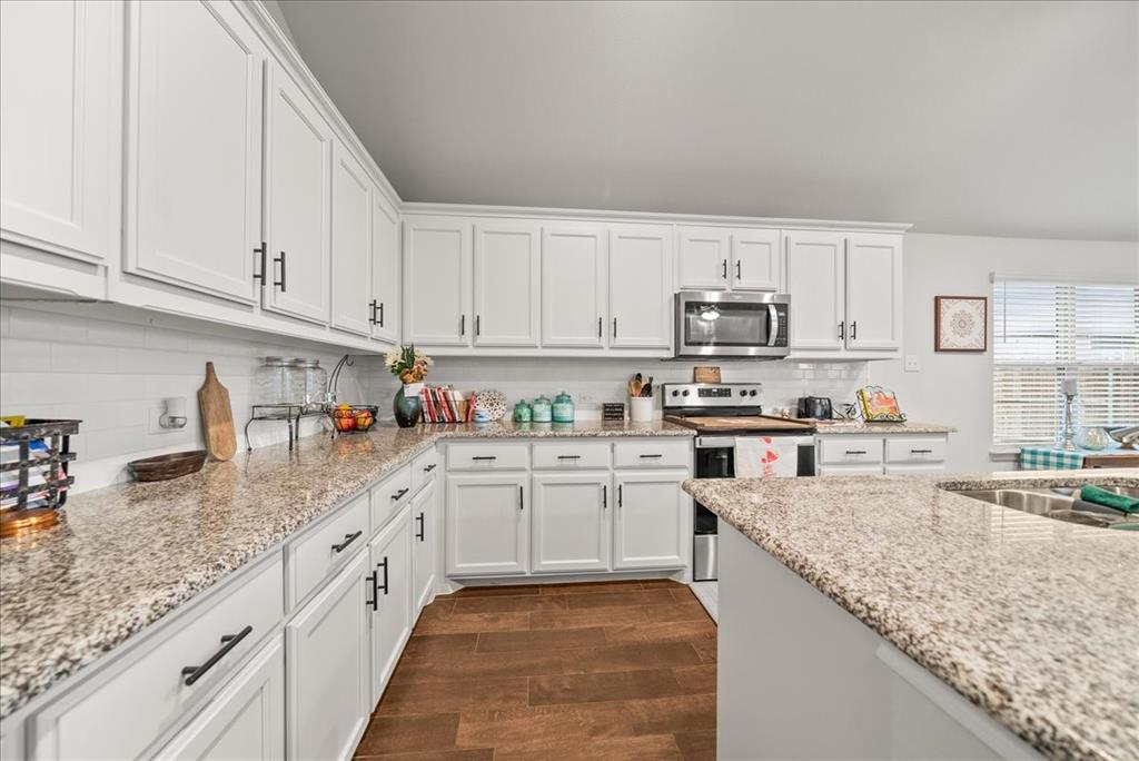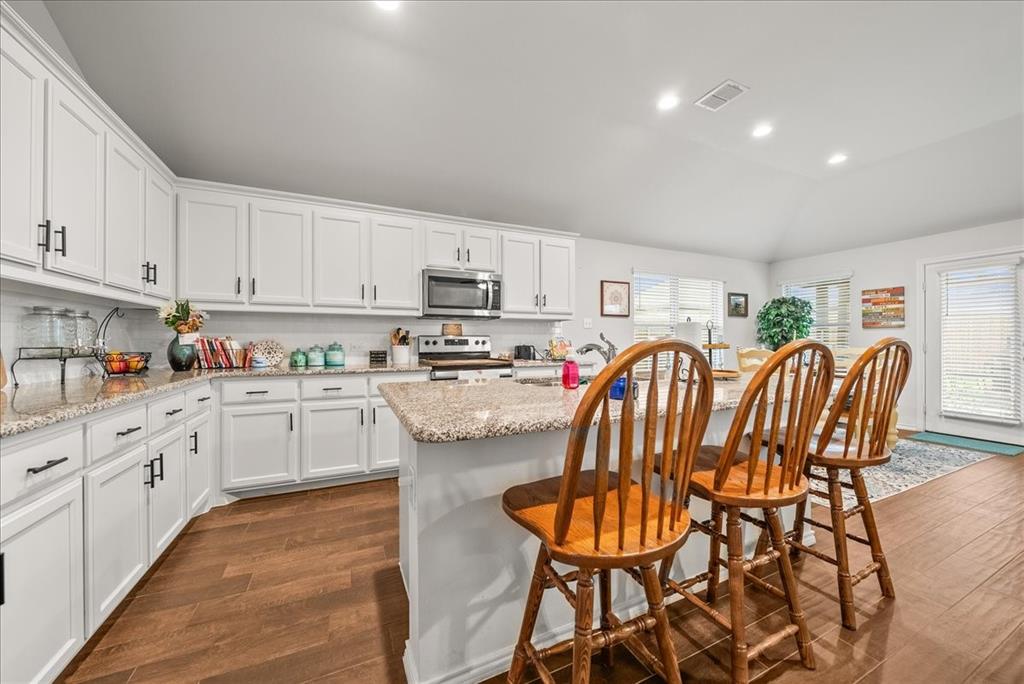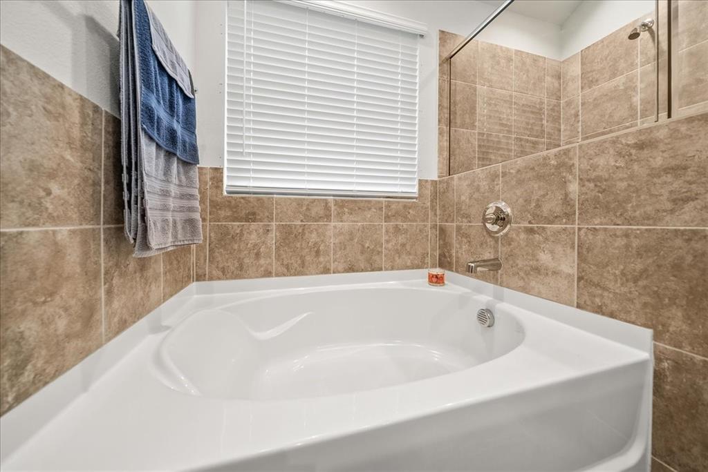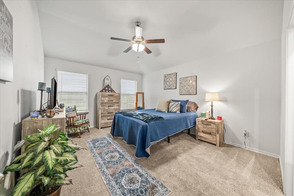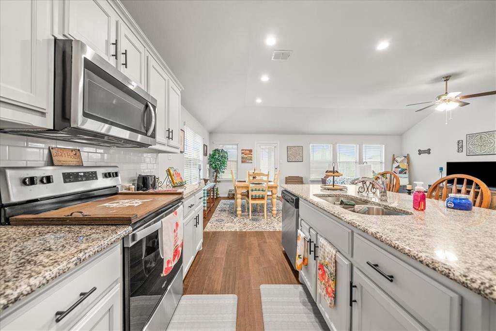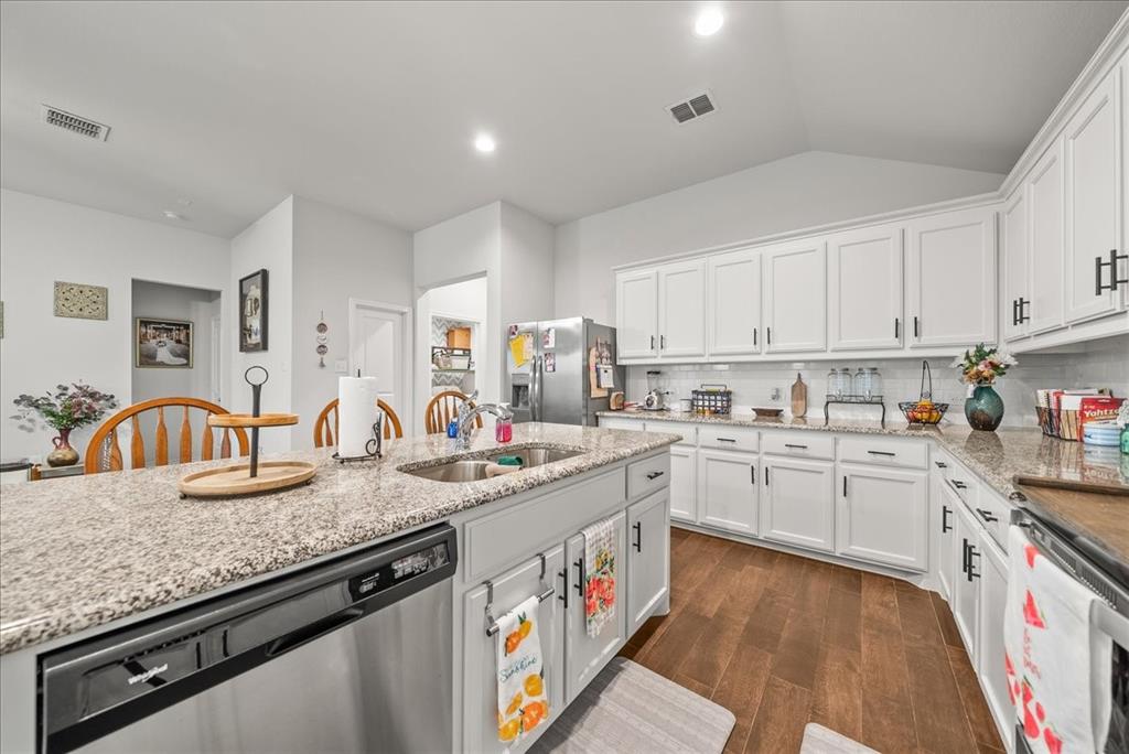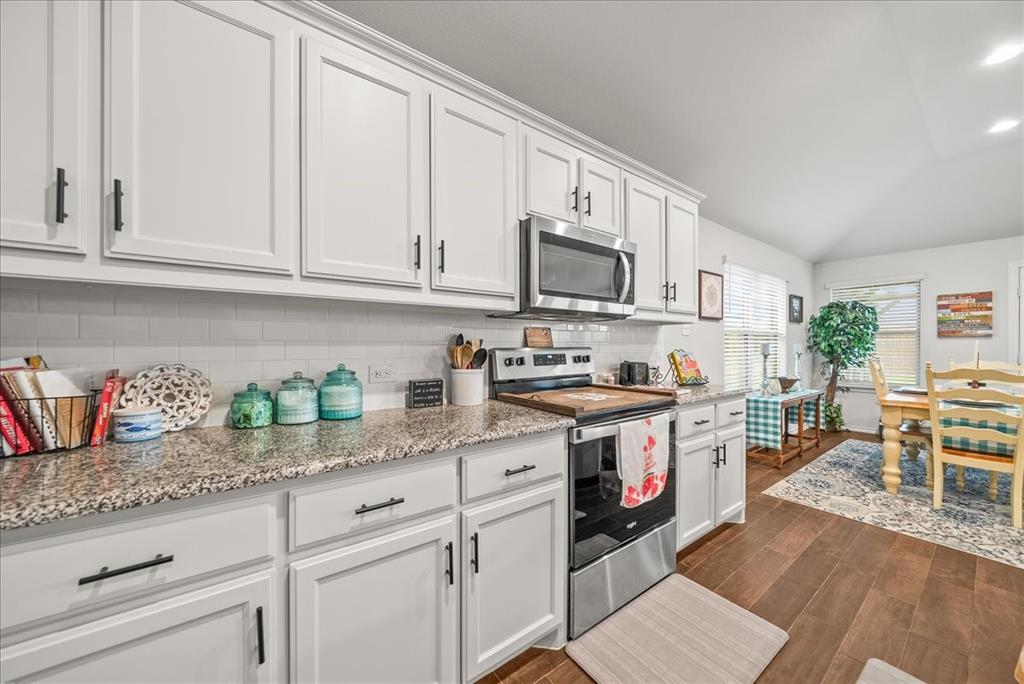 Welcome to this beautifully maintained 3-bedroom, 2-bath home in the desirable Buddy Hardeman subdivision of Justin, TX. Built in 2020, this 1,632 sq ft residence seamlessly blends modern finishes with inviting charm, all nestled on a well-manicured 0.18-acre lot. From the moment you arrive, you'll notice the home's lovely curb appeal featuring a blend of brick and stone façade, lush green lawn, and tasteful landscaping. Inside, an extended entry hall welcomes you with wood-look tile flooring and opens into a bright, spacious living area ideal for relaxing or entertaining. The heart of the home is the chef-inspired kitchen boasting granite countertops, a stylish tile backsplash, white cabinetry, stainless steel appliances, and an oversized island with bar seating—perfect for gatherings and everyday living. The private primary suite offers a peaceful retreat with a dual-sink vanity, a soaking tub, separate shower, and generous closet space. Two additional bedrooms and a full bath provide ample room for guests, family, or a home office. Step outside to your backyard oasis where a covered patio with pergola invites alfresco dining, and the beautifully landscaped yard offers room to play, garden, or unwind under the Texas sky. Additional highlights include a two-car garage, neutral paint tones throughout, ceiling fans, and a thoughtfully designed open floor plan that maximizes space and natural light. This charming home offers the perfect blend of comfort, style, and location—just minutes from local schools, parks, and commuter routes. Don’t miss your chance to make it yours!